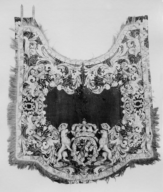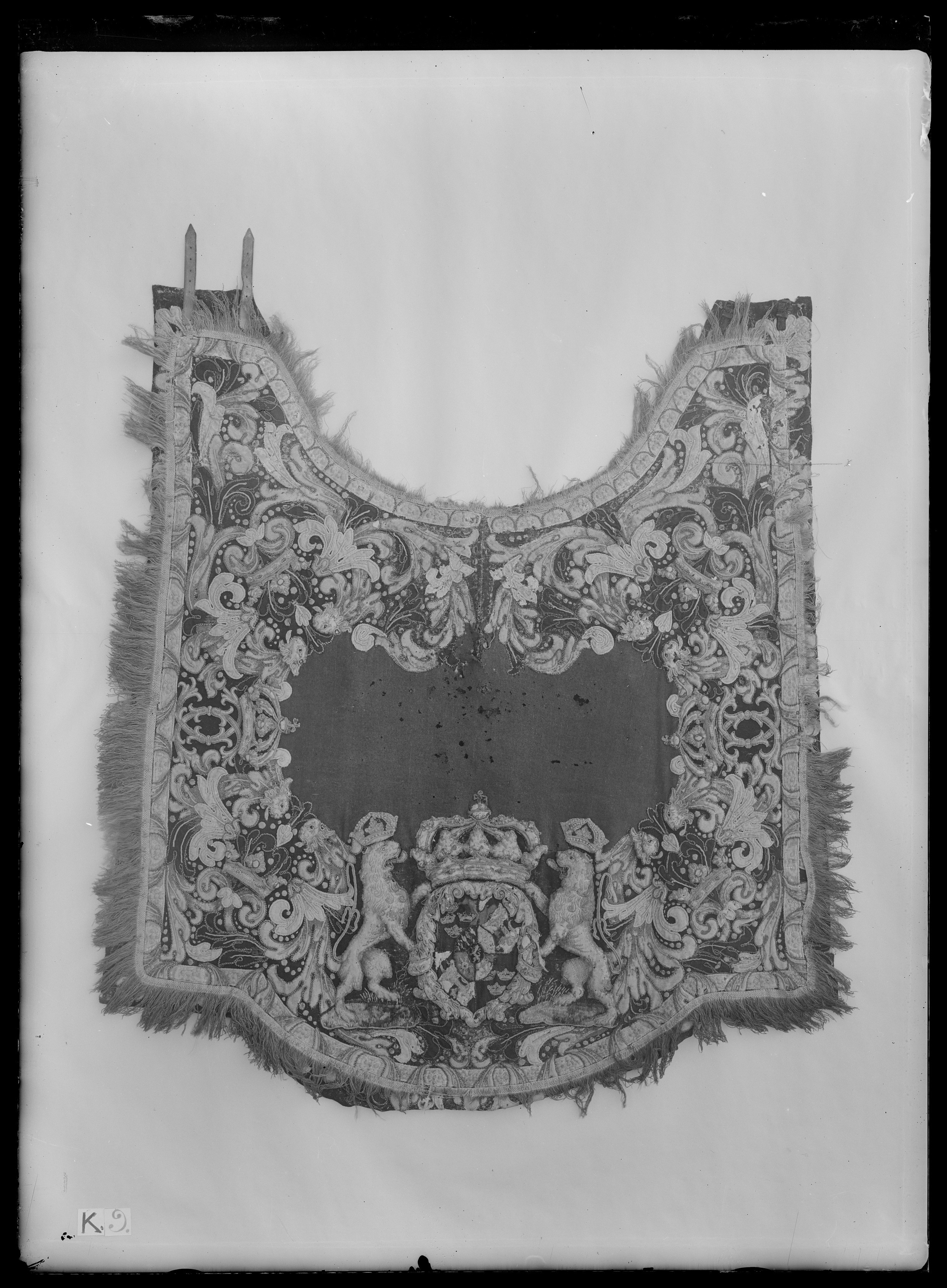 Handhästtäcke, ur en svit om 30 st med svenska riksvapnet och Karl XI:s namnchiffer.