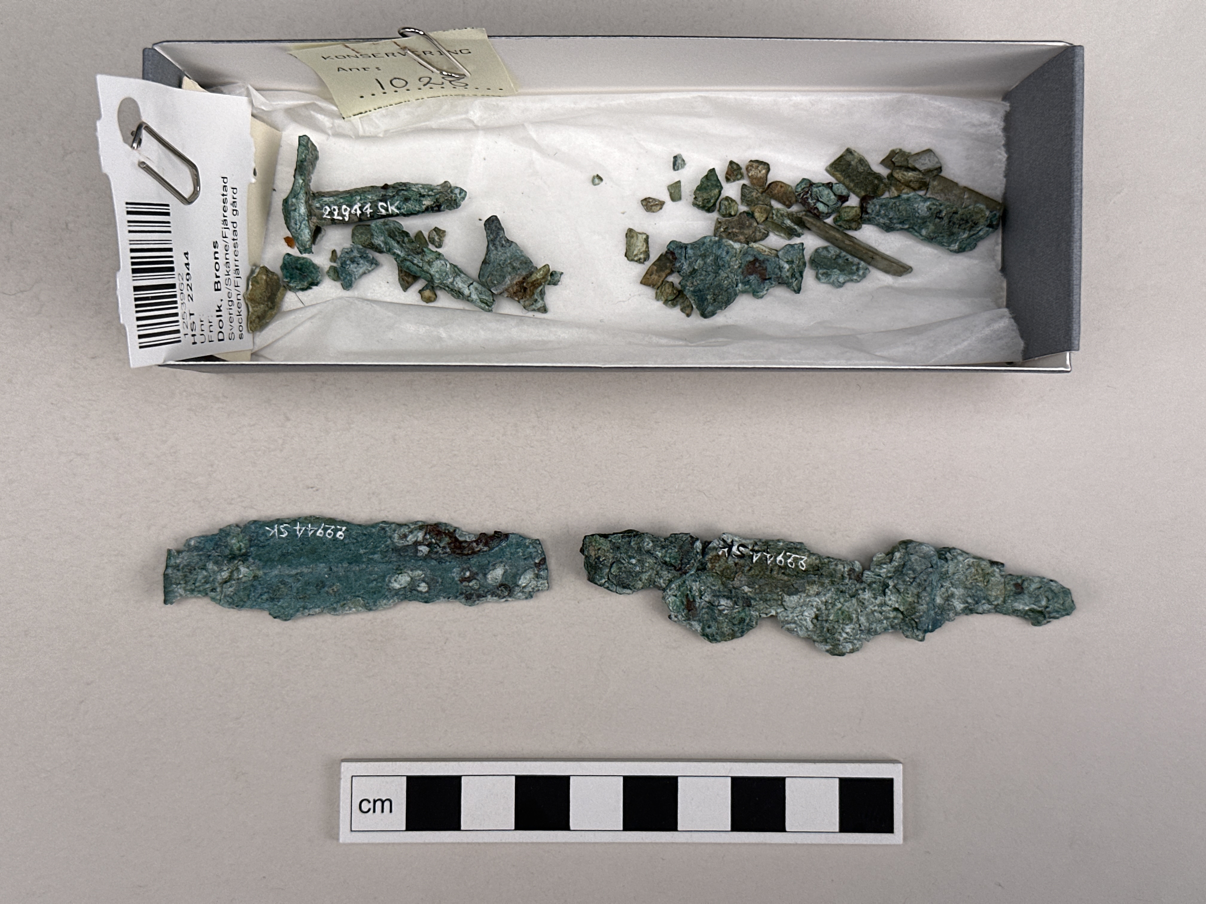 Fragmentarisk dolk, med tånge, som uppvisar rester av fästeknapp.