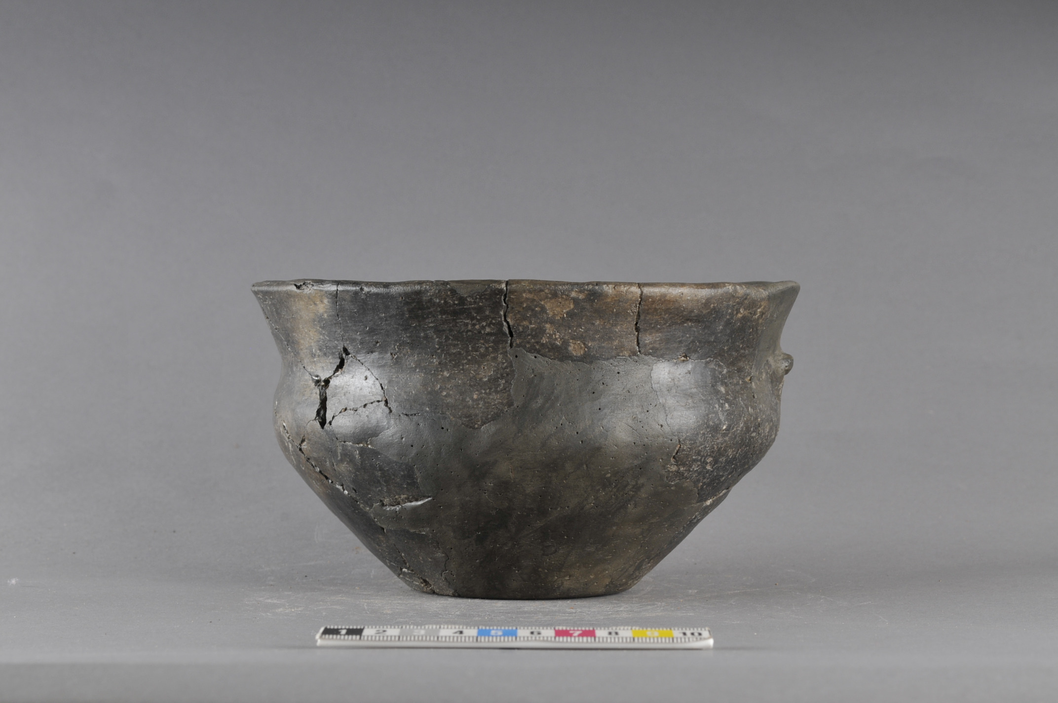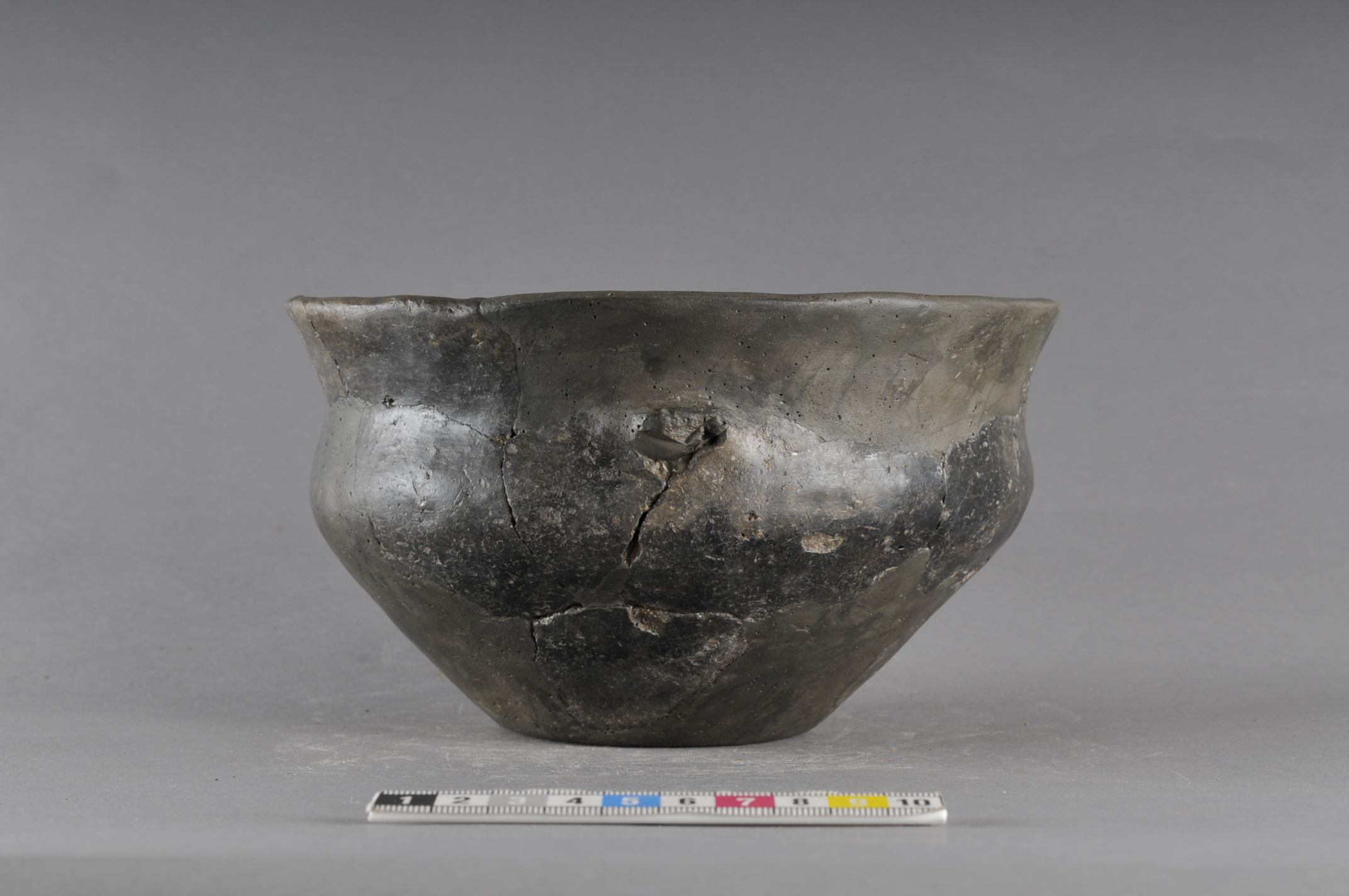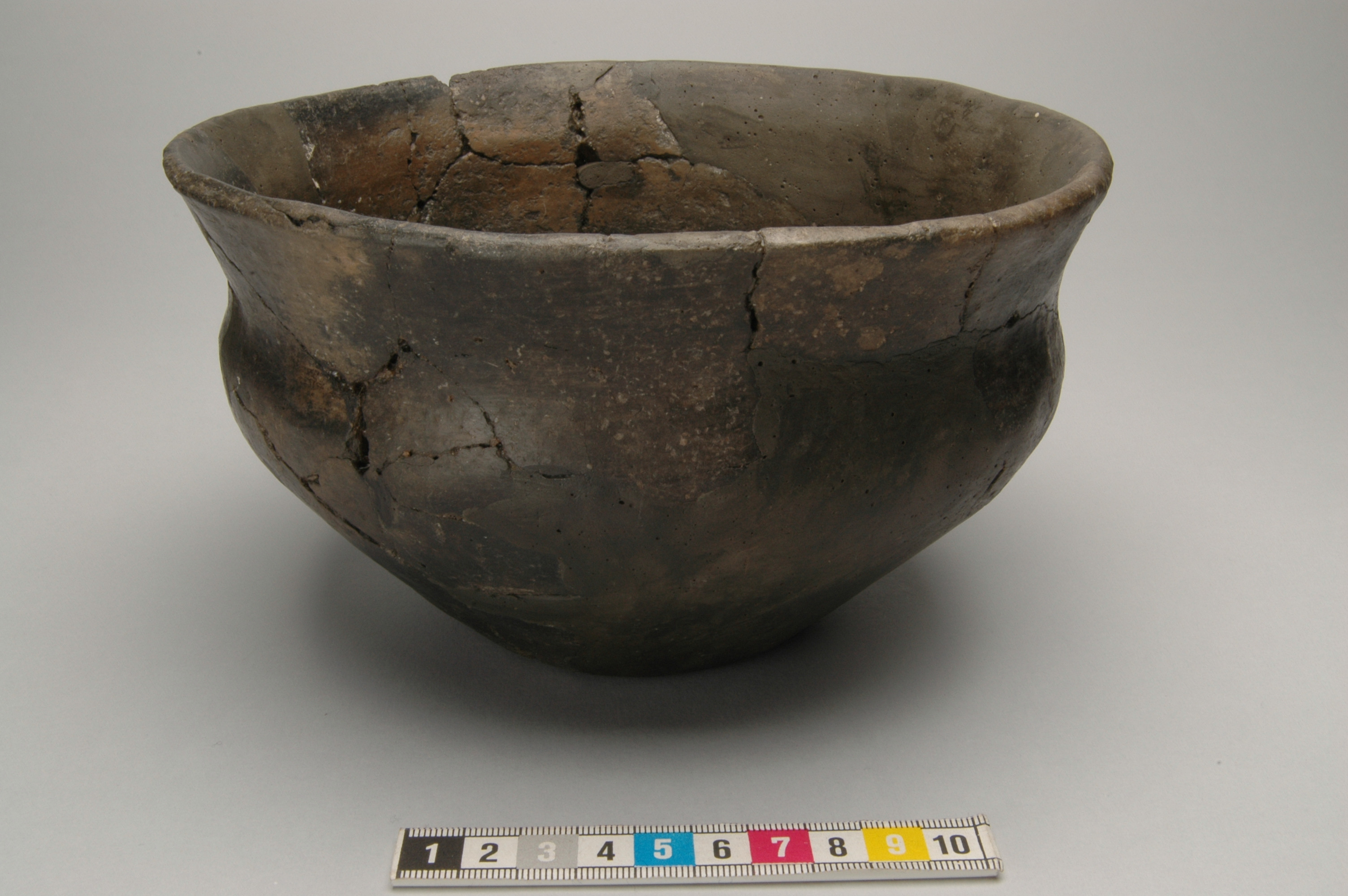 Till viss del rekonstruerat keramikkärl med kupig botten och utåtbuktad sida som övergår direkt i botten, rak mynningskant. På ena sidan syns en avslagen hänkel som förmodligen gått upp till den saknade mynninigsranden ovanför. Godset är mörkbrunt och polerat. OBS! Inventarienummer stämmer ej överens med katalog.