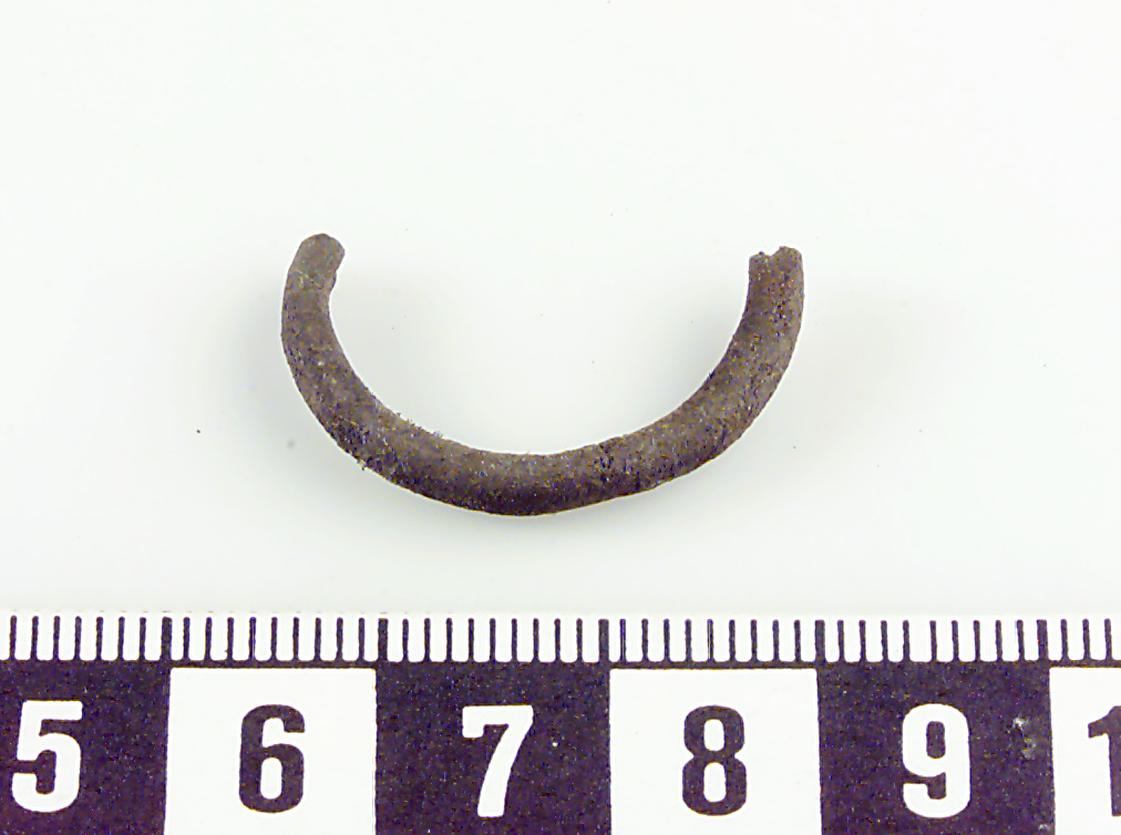 Halvcirkelformad. Avbruten i båda ändarna. Tunn ränna på mitten på insida. Något oval ten.