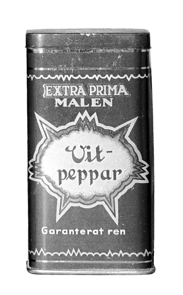 PEPPARBURK Av bleckplåt, grönlackerad. Hög, med rektangulärt tvärsnitt med rundade hörn samt trycklock. På bredsidorna i grönt mot grå botten, på den ena i ovalt fält: Vit-peppar På den andra i runt fält upptill: Arvid Nordqvist H A B I mitten hovleverantörsmärke (svenska riksvapnet) samt nedtill "Stockholm"; kring fälten utstående spetsiga uddar. Lock plant, med utanpågående sarg, på överkanten ett ovalt fält som på bredsidorna, genombrutet med runda hål. I burken malen vitpeppar. Höjd: 11,7 cm.; sidbredd. 4,4 och 6,1 cm