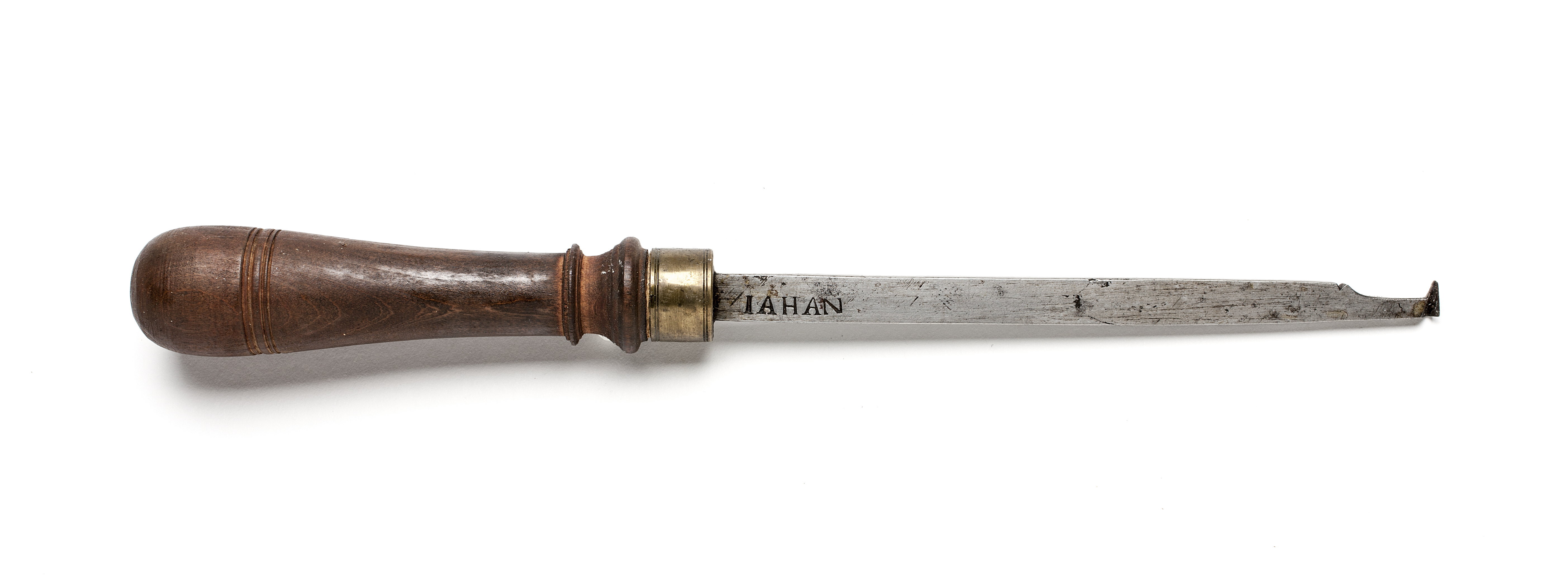Klinga med rektangulär genomskärning, via profilering på en sida övergående i smalare ände. Främre, rak egg samt vinkelställd, spetsig egg. Stämplat på klingan: "IAHAN". Svarvat skaft av päronträ, med två vulster nedtill ("rydboholmstyp"). Mässingsring.