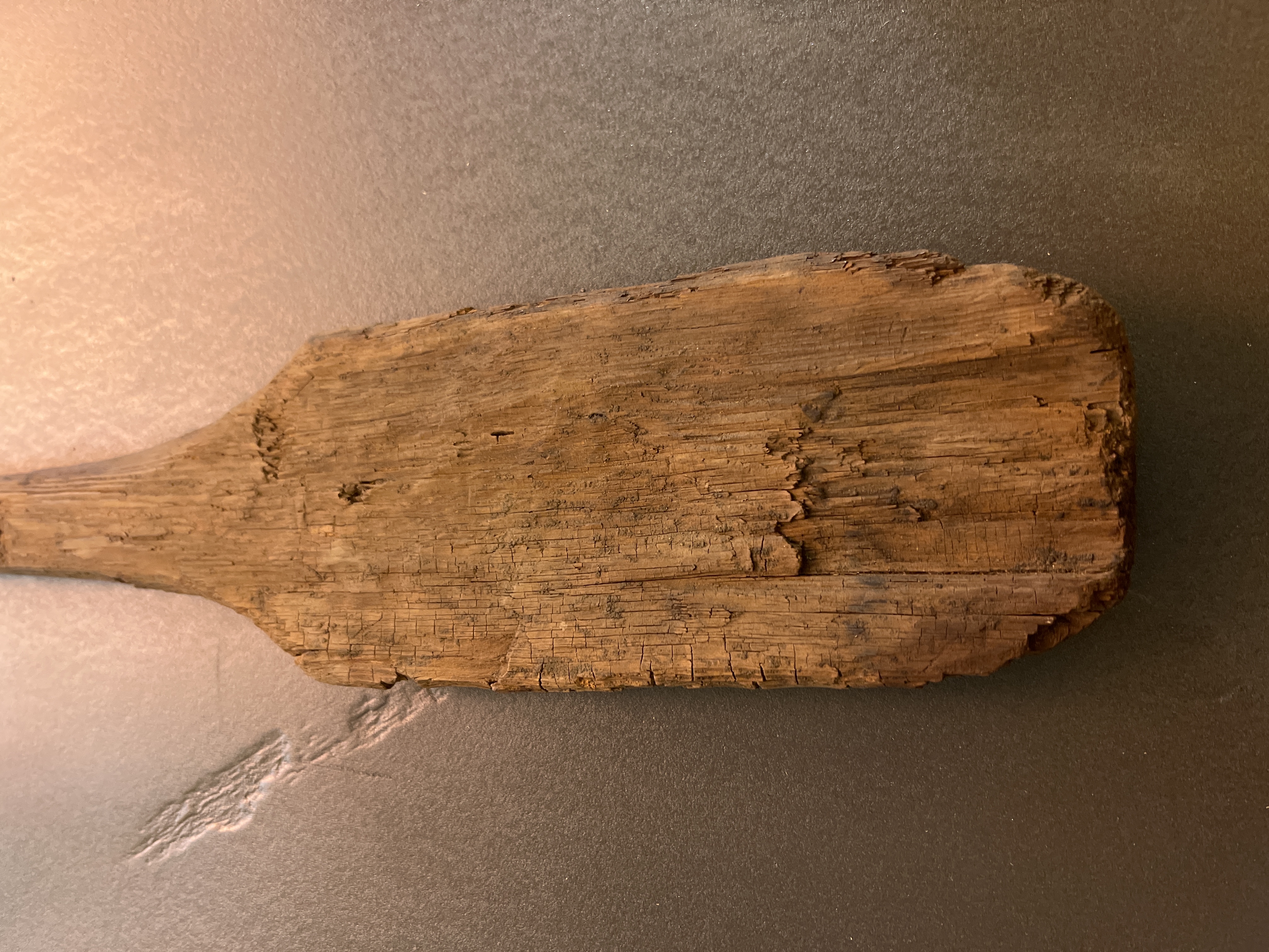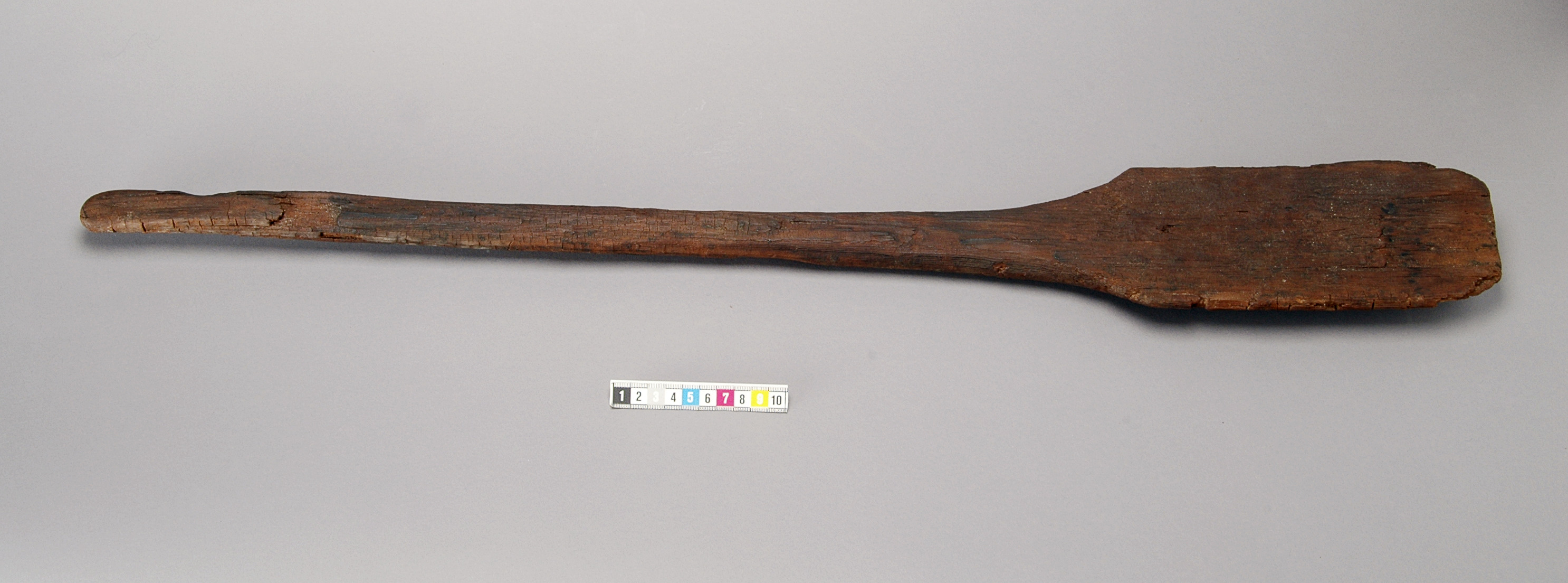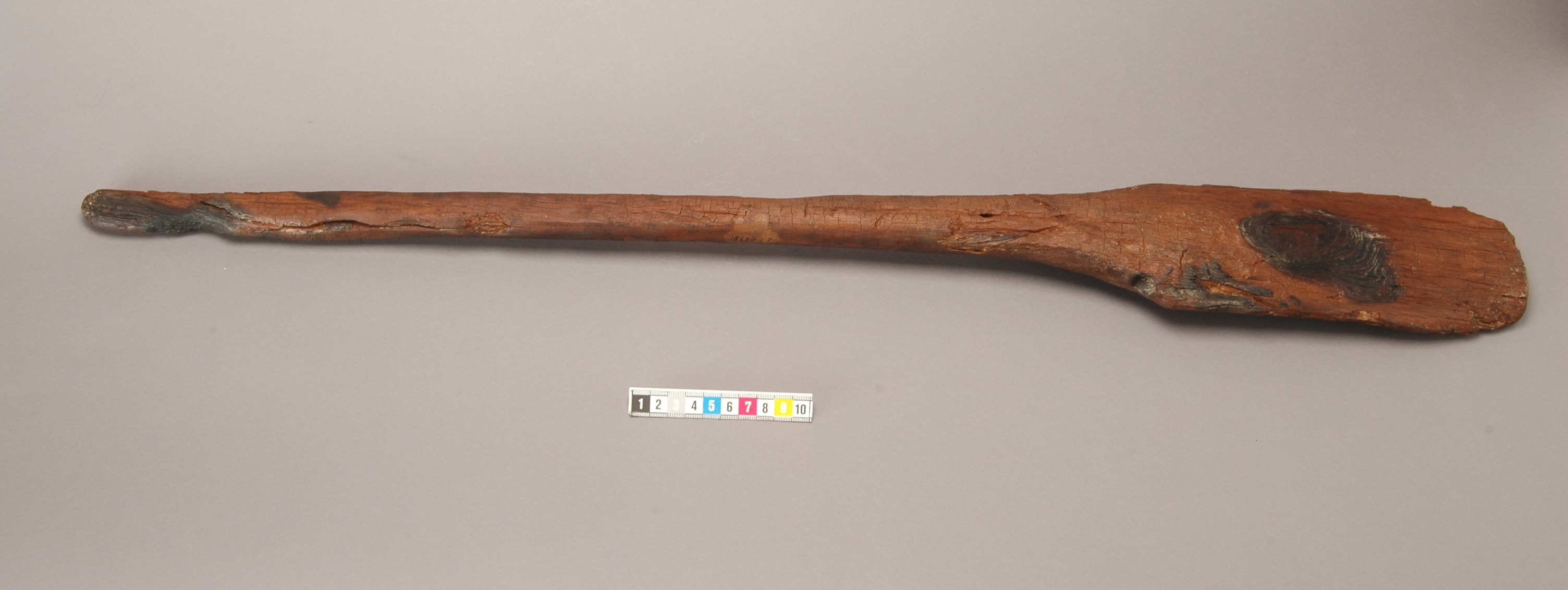 Paddelåra av furu med svagt kupigt blad och svagt avrundade hörn. Skaftet smalnar av mot änden. 14C-daterad år 2006: Ua-33253: 13C ‰ PDB -27,5; 7910+-65 BP
