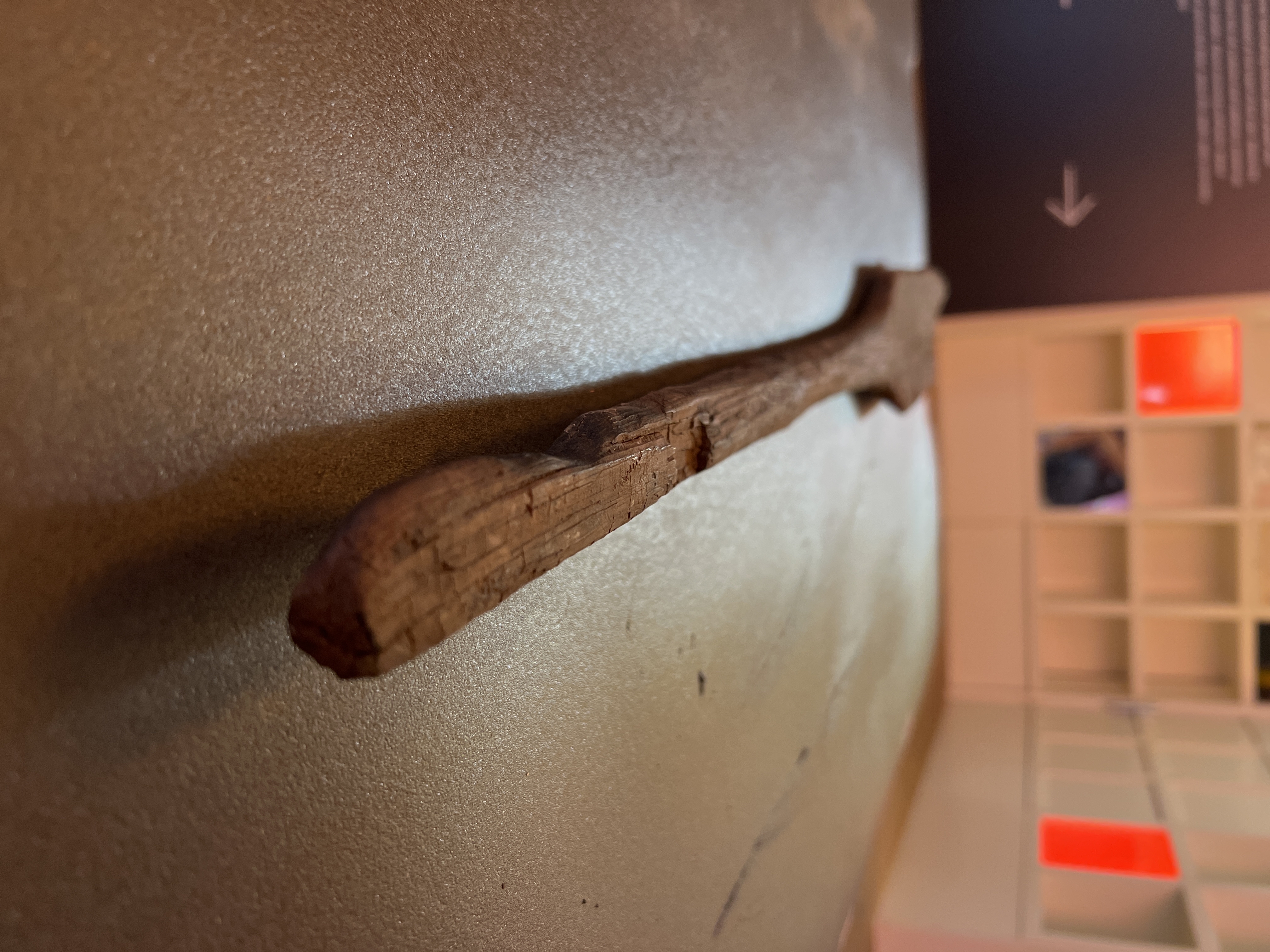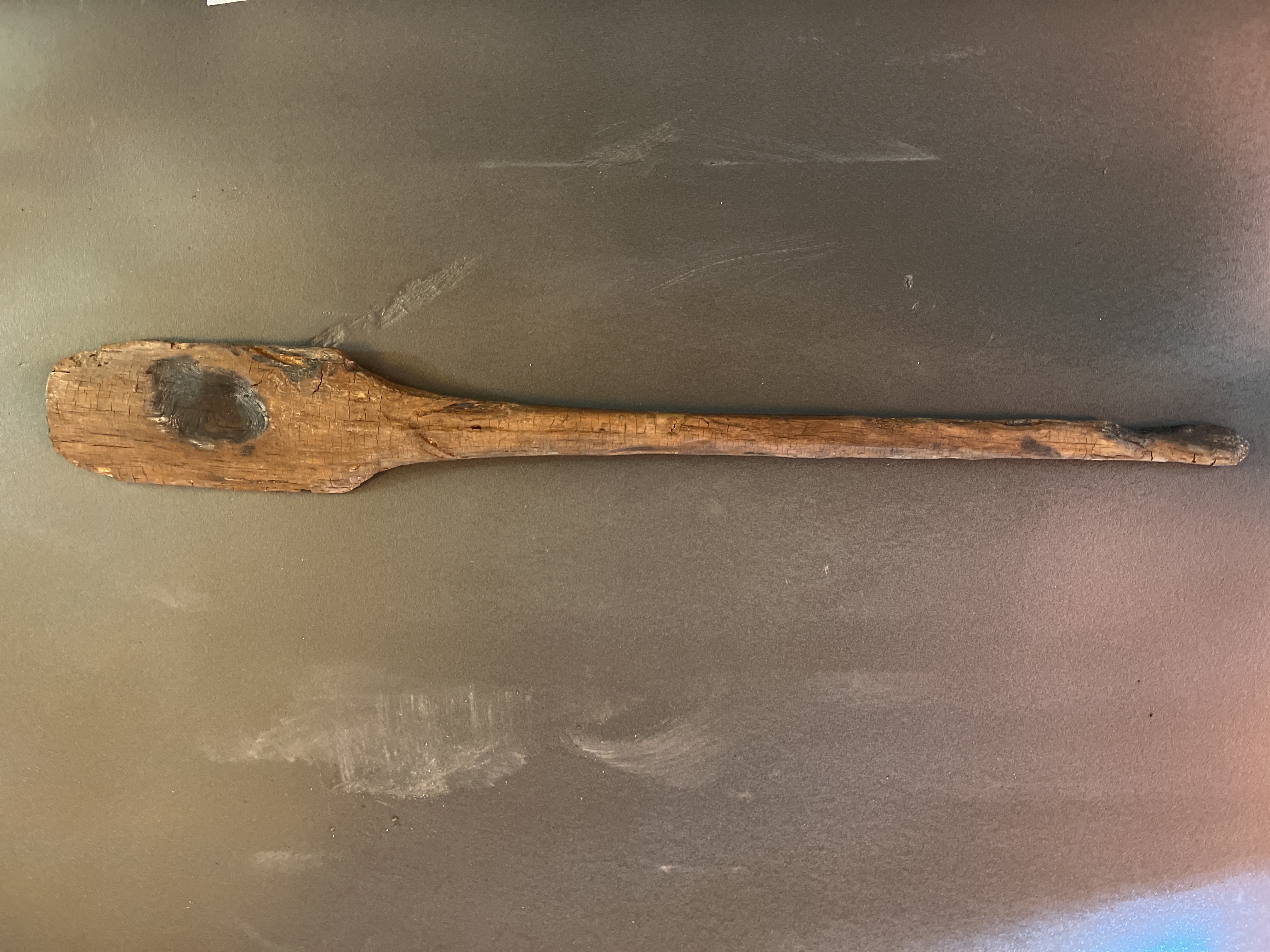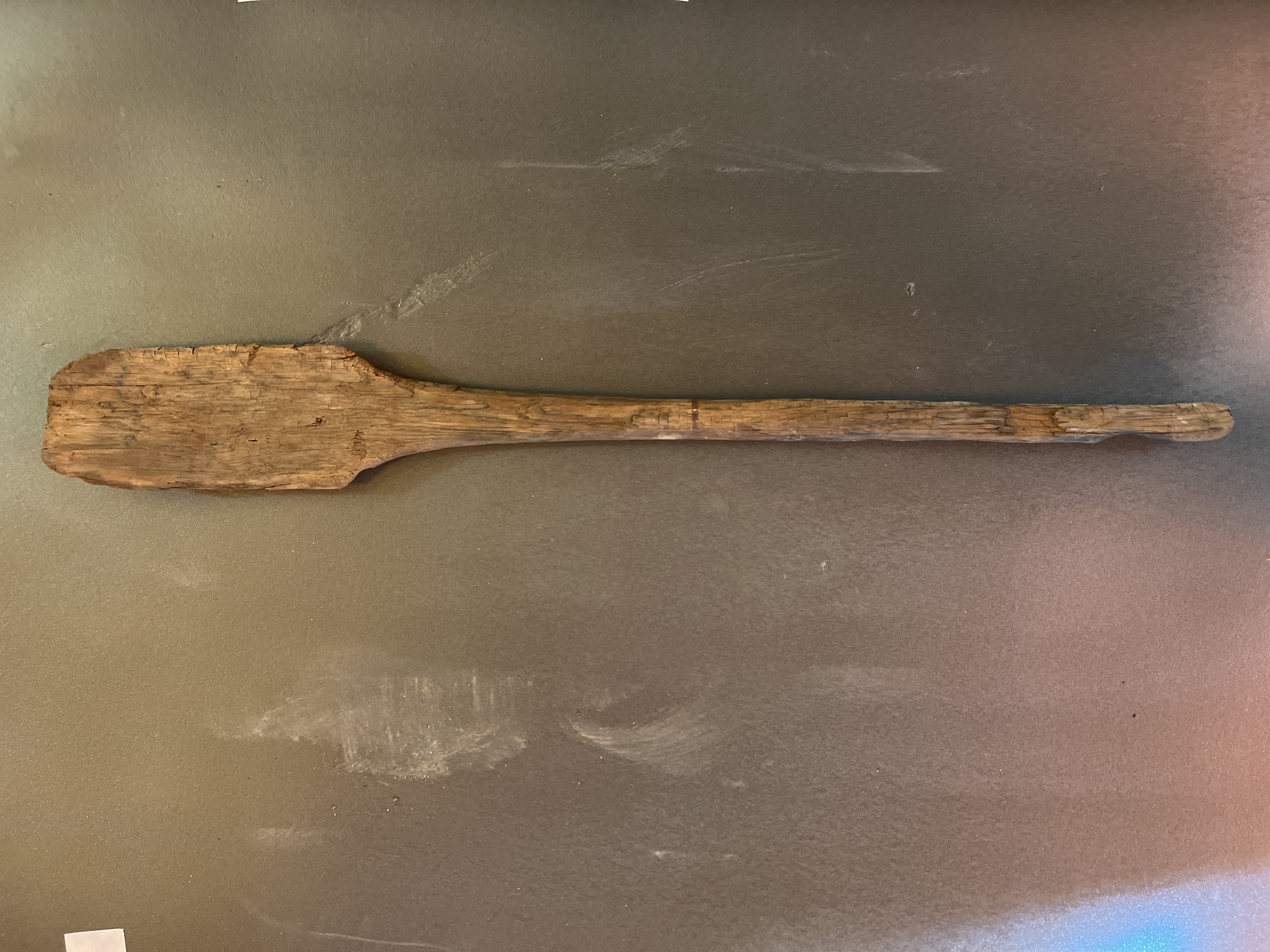 Paddelåra av furu med svagt kupigt blad och svagt avrundade hörn. Skaftet smalnar av mot änden. 14C-daterad år 2006: Ua-33253: 13C ‰ PDB -27,5; 7910+-65 BP