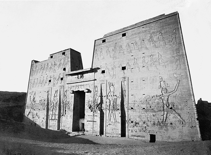 Pylonen vid templet i Edfu. Egypten. Text på fotografiet: Edfou. Pylône. Fotografierna LXVI:M.01.- 201. kommer från resan till Egypten och Sudan som Wilhelmina och Walther von Hallwyl gjorde vintern 1900-1901. De lämnade Sverige den 5 november 1900 och fortsatte från Egypten till Palestina den 28 mars 1901. Med på resan var döttrarna Ellen med maken Henric de Maré och Irma med maken Wilhelm von Geijer. Wilhelminas sällskapsdam, fröken Ida Uhse reste också med. Under en del av resan anslöt sig ledamoten av Internationella domstolen i Kairo, assessorn Otto Conrad Waldemar Cedercrantz med makan Anna Elisabeth. Vid resan uppför Nilen hade Walther von Hallwyl hyrt ångfartyget Columbia med besättning. Båtresan startade i Kairo 27 december 1900, gick ända till Wadi Halfa varifrån man reste vidare med tåg till Khartum och tillbaka till Wadi Halfa. Båten vände åter i riktning mot Kairo, men det verkar som att sällskapet tog tåg sista biten, från Luxor. Henric och Ellen de Maré samt fru Cedercrantz lämnade båten redan då de passerade Luxor första gången. Resten av sällskapet återvände till Kairo den 1 mars. Fotografierna LXVI:M.01.-120. togs av resenärerna själva, de största av Ellen de Maré, de mellersta av Wilhelmina von Hallwyl och de minsta av Wilhelm von Geijer. Resten köptes av professionella fotografer i Kairo, de flesta från Studio Photogr. Artistique G. Lekegian & Cie. Alla uppgifter kommer från Ida Uhses reseanteckningar. Inköpt hos studio Photogr. Artistique G. Lekegian & Co.