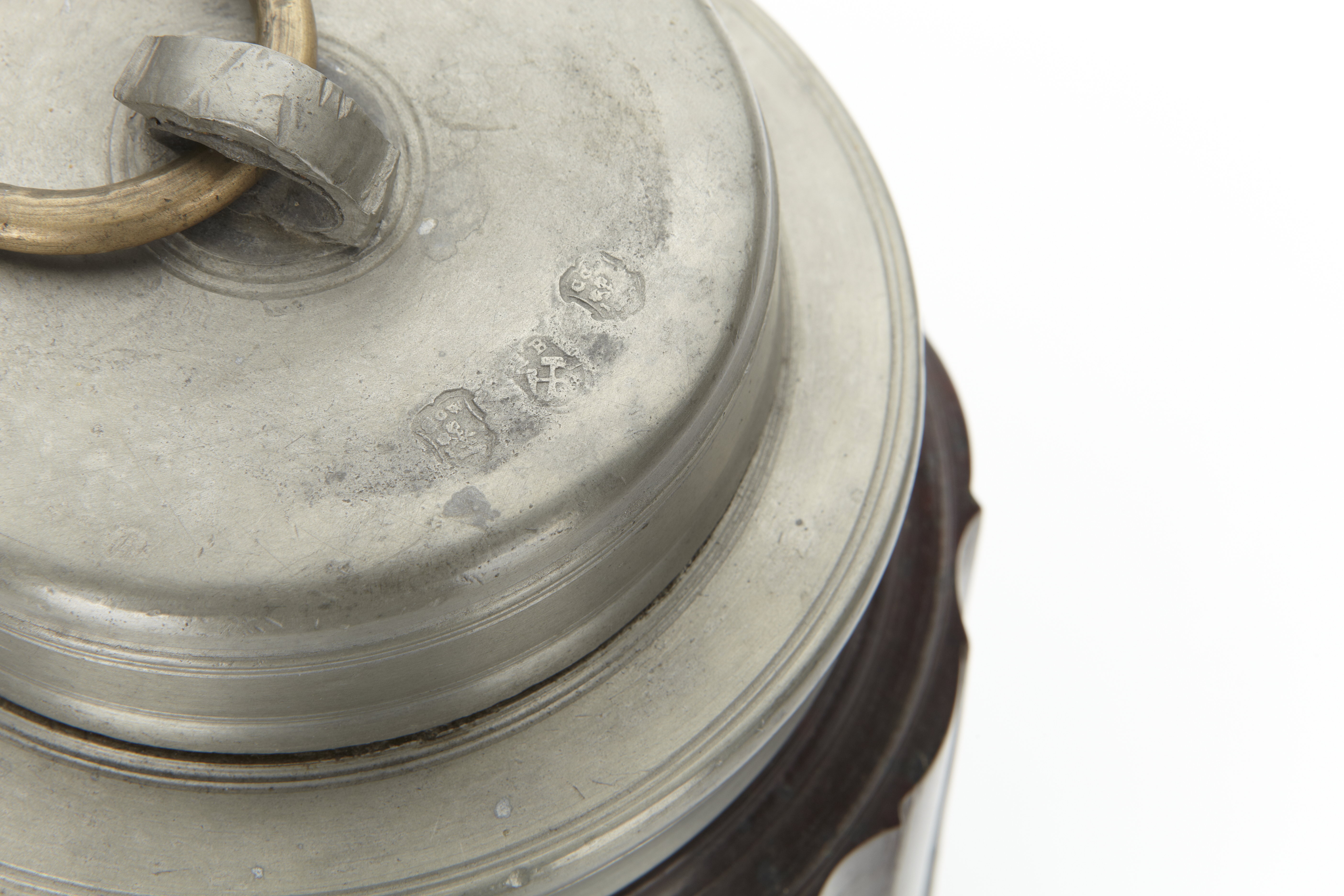Flaskan rund med konvexa och konkava kannelyrer. Runt mynningen tennring. På locket mässingsring. Stämplar: Skruvlocket är trestämplat, mästarstämpel stadsstämpel mästarstämpel. Mästarstämpel: i en konturerad sköld med bård versalerna COW över en ur marken växande planta med tre blommor, flankerade av talet 13. Stadsstämpel: i ett sköldformat fält versalerna MB över två korslagda hammare = Marienberg, Sachsen.