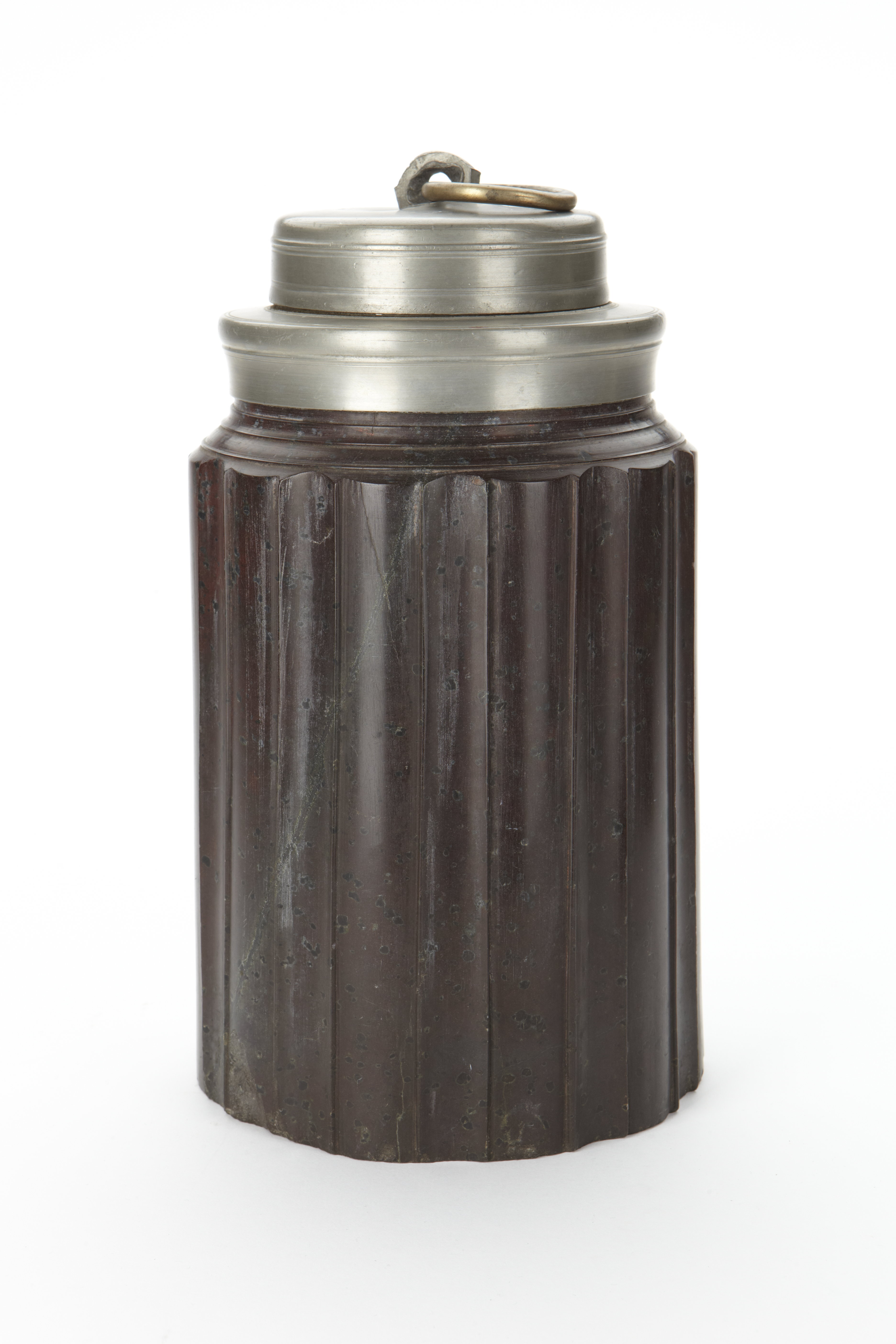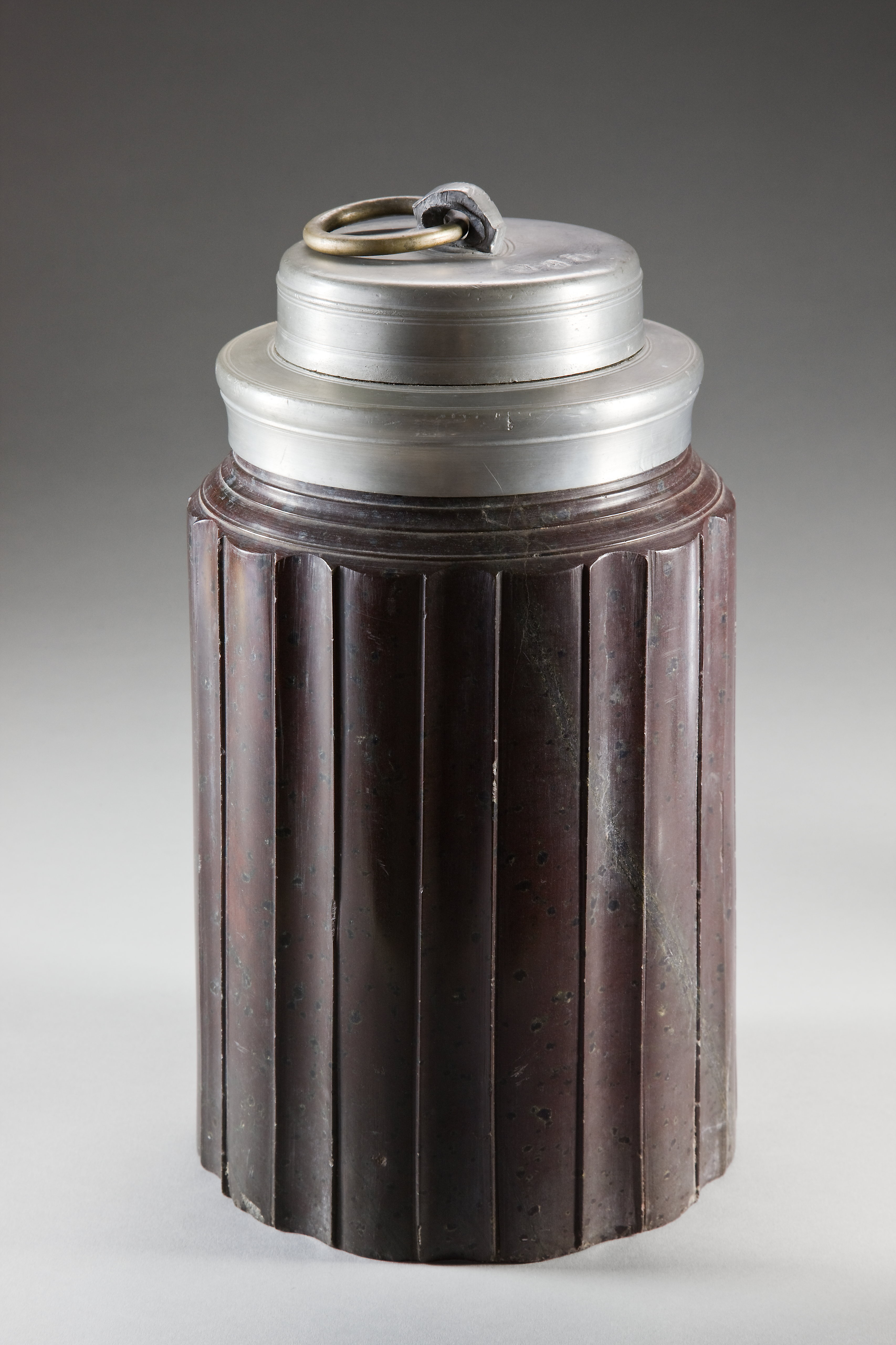 Flaska av svarvad brun serpentin med skruvlock av tenn.