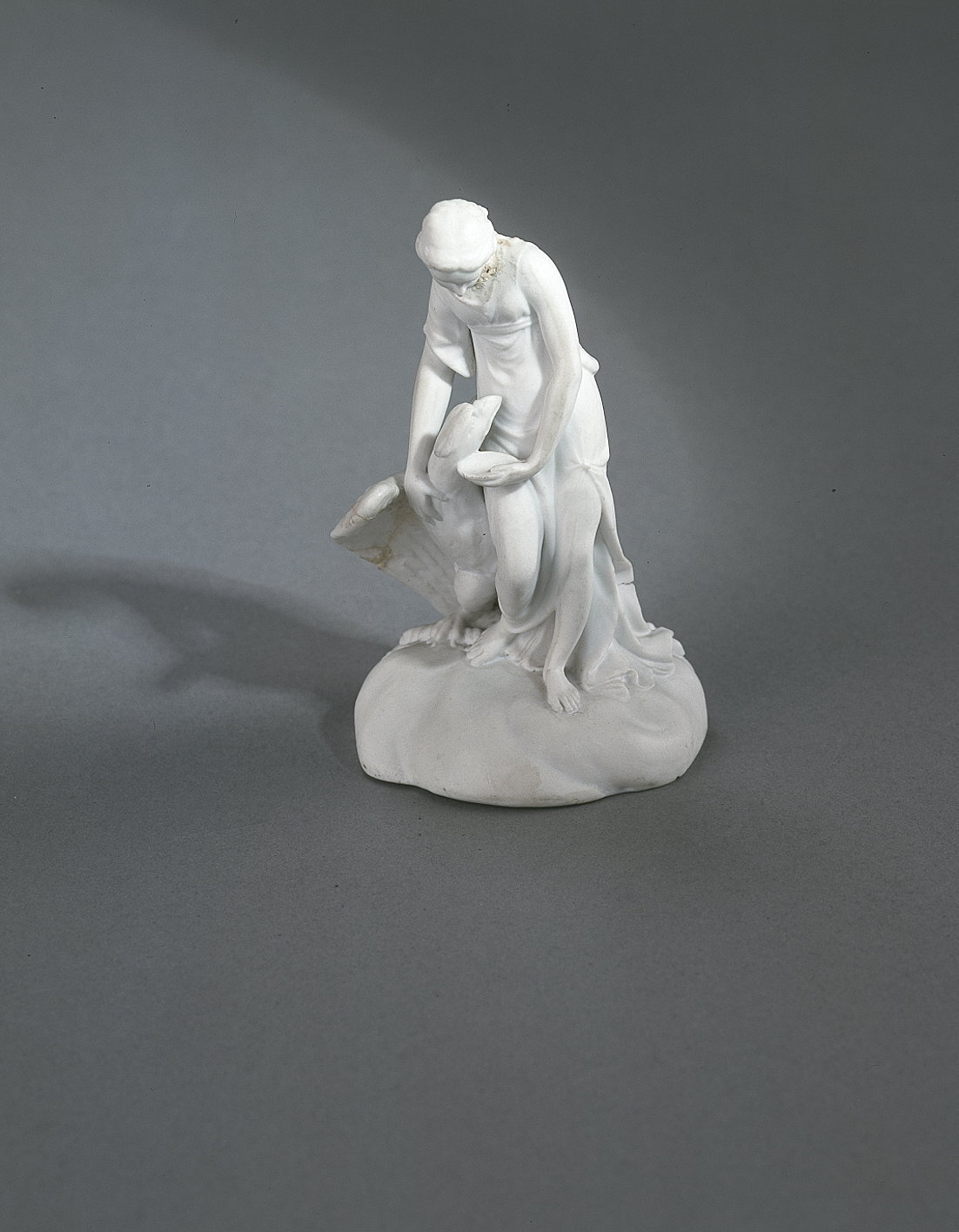 FIGURIN. Kvinna som matar en örn. Motivet är hämtat från en grekisk gudasaga; möjligen Hebe, Zeus dotter. Gåva julafton 1915 från kammarherren Henrik de Maré. Etrurira (1768-). Fabriken grundlades 1769 av Josiah Wedgwood och dennes kompanjon, Thomas Bentley. Wedgwood grundade Etruria för tillverkning av exklusivare varor i nyklassisk stil.