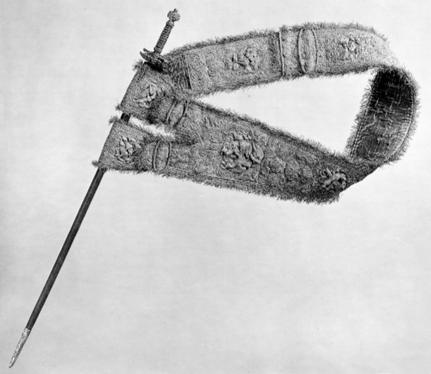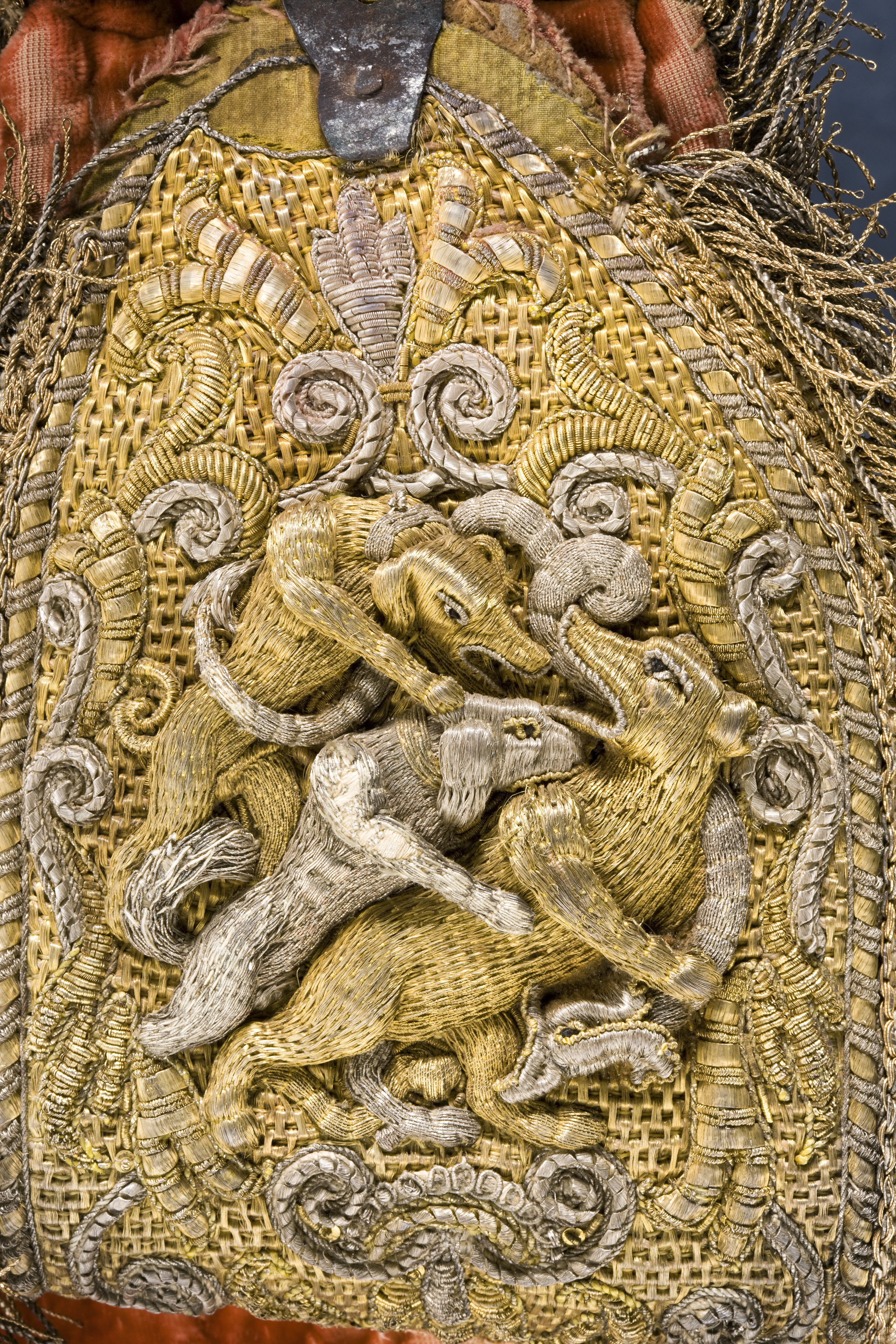 Gehänget består av 3 delar, den största i form av en utdragen triangel (likbent) 132 cm lång. Största bredden nertill, där den är kluven i 2 tampar vardera 14 cm långa och 6,5 cmbreda. Nedanför denna är själva värjhylsan bestående av 2 öglor, vardera 10,5 cm breda och som täcks av broderade partier som är 15,5-16 cm långa (d.v.s. i kant med vikningen). Hylsorna är "upphängda" genom ett fastnitat 3 cm långt upptill kluvet järnbleck som böjts runt det ovala spännets (eller söljans) mitt-ten och här är också järntornen fästade som bakifrån och ut på framsidan trätts genom mittpartiet av de smala ändtamparna på gehängets långa stycke och vilar mot söljans övre kant. Tornen sticker rakt genom broderiet utan något speciellt "knapphål" eller träns, deras plats är 7 cm från tamparnas nederkant. Söljorna är 8,5 cm breda och de är 4,5 cm höga med klädsel som består av 5 parallella strängar av guld- respektive silverlan med gult respektive beige silkeskärna, som griper i varandra. Hela gehänget är broderat i reliefsöm med guld respektive silvertrådar, bottentyget syns inte. Vissa bottenpartier, har en täckande botten som av guldtenar ca 12 st bredvid varandra som liknar en "tuskaftsbotten" vävtrådarna är 2 mm breda i "varpriktningen" i"inslagsriktningen" finns en åt höger tvinnad gul silkestråd. Broderiet är för övrigt sammansatt av silverkantilj som bildar kontur i ett ornamentmönster av 4 mm breda platta guldlan omspunna av guldtenar, avklippta till små bitar (varierande längd 6 mm ej ovanligt). På dessa ligger 2 strängar av guldkantilj. Innanför dessa ligger små knippen av silverkantilj vilka omsluter i mitten en liten topp av silverlan. Dessa små knippen bildar även en övre kontur och innanför denna finns det guldlan omspunnen av guldtenar (ca 2 mm breda) i spiralform. Mot insidan är mönstret av kantiljer av guldten och silverlan. Dessutom finns krusiga strängar av en tjock kärna av gult silke h omspunnen av guld och silverlan. Huvudmotiven i gehänget är djur, lejon, drakar, ormar och fåglar bitande i varandra, broderade i silver och i guld. Djurmotivet återkommer 4 gånger i den stora delen av gehänget djurreliefen är något mindre eftersom gehängets mittparti avsmalnar mot gehängets tredje stycke. Djuren är broderade antingen med strängar av guldtenar mindre eller större eller med strängar av silvertenar. Gul eller grå silke v omspunnen av silver eller guldlan och tenar av silver och guld har använts. Kring djurens munnar och ögorna bildar en krusig tråd (grå silkeskärna h omspunnen av silverten eller guldten) kontur. Ögorna är av svart silke med en liten silverkantilj på sidan. Där djuret har broderats i guld är konturerna av silver eller omvänt det i silver broderade djuret har konturen i guldtråd. På varje hylsa finns ett djurmotiv med ornament brodering i guld och silver. Hylsorna är 17 cm långa och 11 cm breda. Även gehängets 3:e del har i mitten ett djurmotiv och ornament. I ytterkanten av gehänget går en total 420 cm lång frans. Fransen är 2,5 cm bred bestående av drejade guld- och även några silvertrådar. Vid överkanten av denna frans är en 8 mm bred kant arbetad med 3 och 3 styck guld respektive silvertrådar (en med guldlan resp. silverlan tätt omspunnen silkeskärna som bildar ett rutigt mönster, i vars mitt 7 vertikala trådar ligger varav 2 st. silvertrådar). Bården är fastsydd med h-tvinnad beige silke. I den smala ändan av gehängets långa mittstycke är en större oval sölja fästad, 14 cm bred, då gehängets hela bredd är trädd härigenom , 5,4 cm hög, och på samma sätt som tidigare nämnts har här gehängets tredje stycke (bakstycket) som är 55 cm långt, "upphängts". Under denna på gehängets tredje stycke sitter en kring tredje stycket böjd järnögla klädd på samma sätt som söljan och 14 cm bred. Broderiet täcker dock endast de mittersta 26 cm (synligt parti) och 10,5 cm på bredaste stället. Tornen i söljan går upp 11 cm i det långa styckets ände. Det tredje styckets övre parti som ligger under söljan, är av vitt skinn (l:7,5 cm, b: 10 cm), 26 cm är den broderad i silver och guld, 12 cm är den täckt av den röda sammeten 1 cm innanför den yttersta spetsen finns 3 nitar hållande en avsliten läderbit, samma som i spetsen. Hela gehänget är fodrat med ljusrött sammet, och har ett mellanfoder av ca 3 mm tjockt, gult läder.