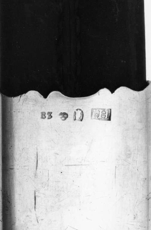 Balja av läder beslagen med munbleck, 172 mm högt, doppsko 320 mm hög och mellanband 145 mm brett av slät silverplått med parvis inpressade raka linjer samt däremellan korslagda. Samtliga beslag med konturerade kanter. Doppsko med släpsko, konturerad och högre på framkanten. På samtliga beslagens insida kontrollstämpling: " B 3, trekronorsmärke, manshuvud, I. H ". På munbleckets och mellanbandets bakre kant rund hållare med koppelring av silver.