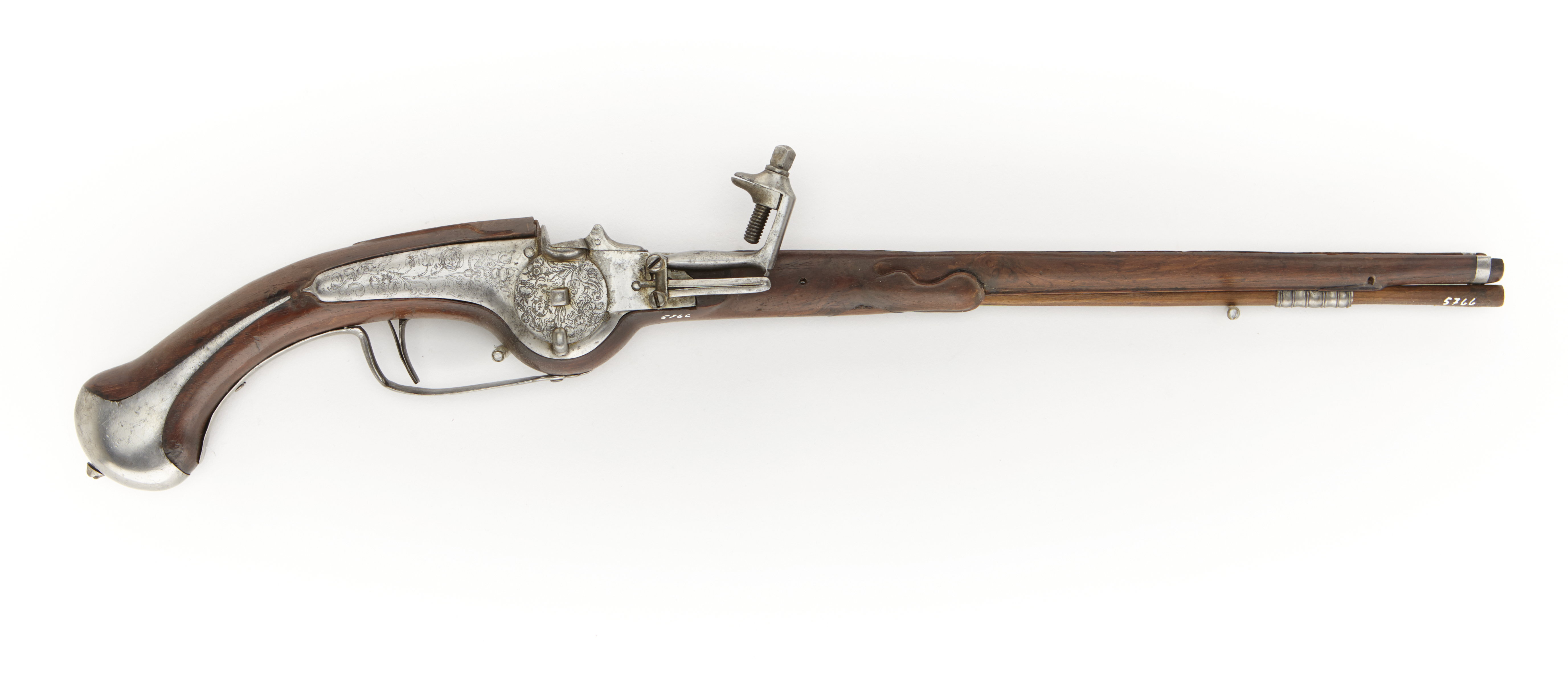 Pipan saknas. Hjullås. Kullrigt låsbleck av fransk typ - utsvängt för hjulet. Låsbleck och hjul med etsad dekor föreställande blommor och blad. Låg, rundad krutskärm. Hane med lös underkäke. Hjulet är fäst med krampa kl. 6. Hel stock av jakaranda. Platt, rundad kolv, som är utsvängd för hjulet. Kolvkappa av stål med långa flikar. Ursprungligen tre låsskruvar. Runt låsskruvarna finns ett ur stocken snidat parti med form av låsblecket. Stocken är något snidad vid laddstockrännans bakre del. Smalt näsband av stål. Profilerad rörka av stål. Enkel varbygel, vars bakre arm följer kolvhalsens undersida. Fjäderbelastad avtryckare. Tillbehör: Laddstock av ljust trä. Märkt: 78 bakom låsblecket, stanstyp 5376. 73 bakom låsblecket, stanstyp 5376.