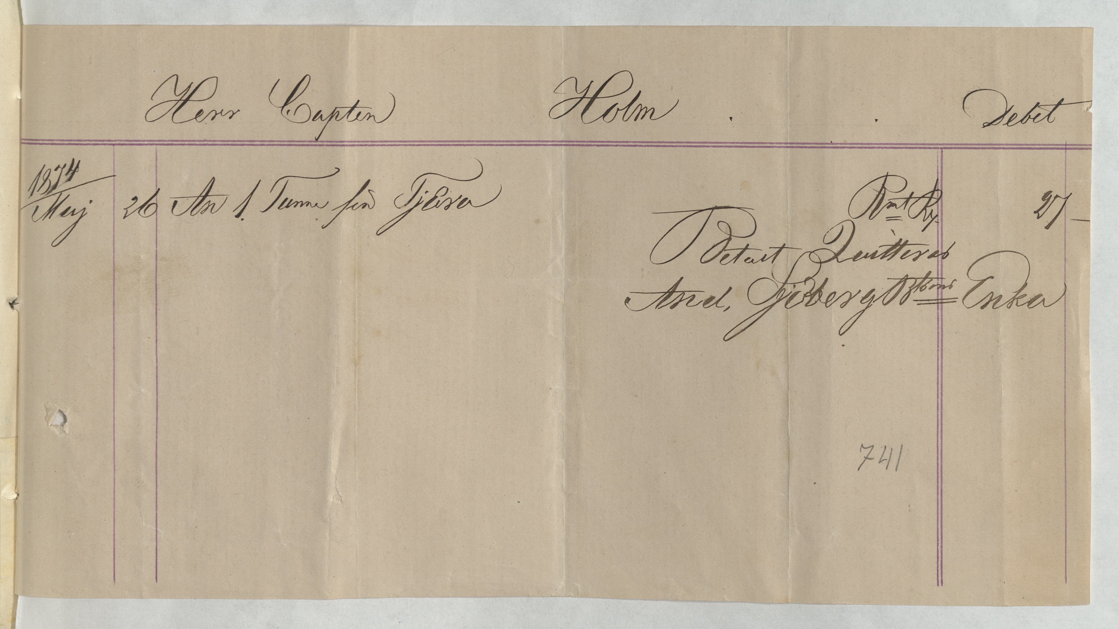 Kvitto från Axel Sjöbergs änka. Gällande inköp av tjära.