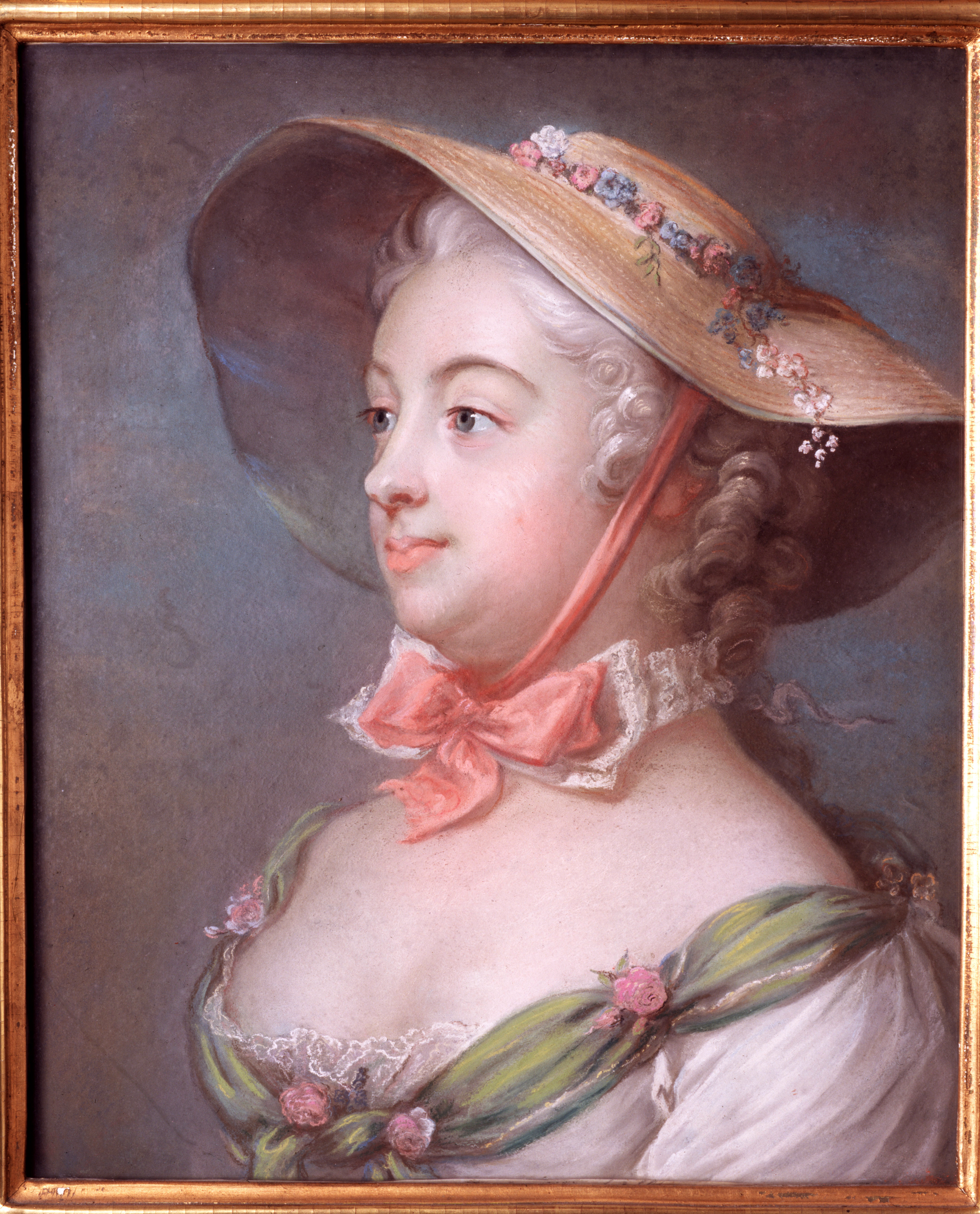 Bröstbild, profil vänster. pudrat hår, Schäferhatt med blommor, ljusröd hakrosett, spetshalskrage. Djupt urringad löst sittande vit klänning med grön isättning samt spetsar i urringningen. Under glas. På baksidan skiva av trä, klistrad med papper i flera lager. Skrivet med bläck: "Fru Schröderheim". Förgylld rikt profilerad ram av furu med löst förgyllt genombrutet överstycke vari lyra, facklor och lagerkrans(1735:3). Ramlistens bredd 70 mm.