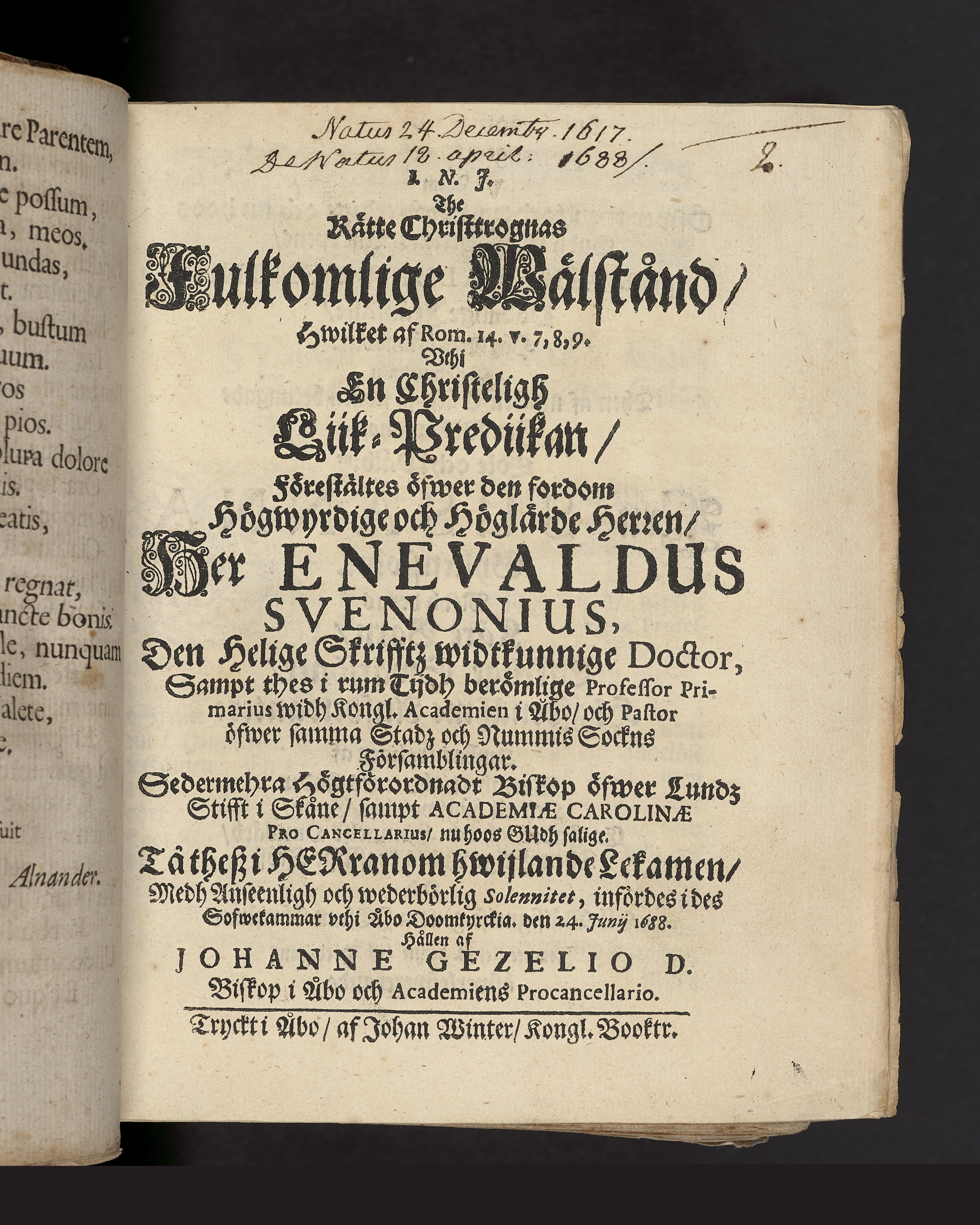 I. N. J. The rätte christtrognas fulkomlige wälstånd ... vthi en christeligh lijk-prediikan, förestältes öfwer den fordom högwyrdige och höglärde herren, Her Enevaldus Svenonius ... vthi Åbo doomkyrckia, den 24. junij 1688. Hållen af Iohanne Gezelio ... Tryckt i Åbo, af Johan Winter, kongl. booktr.