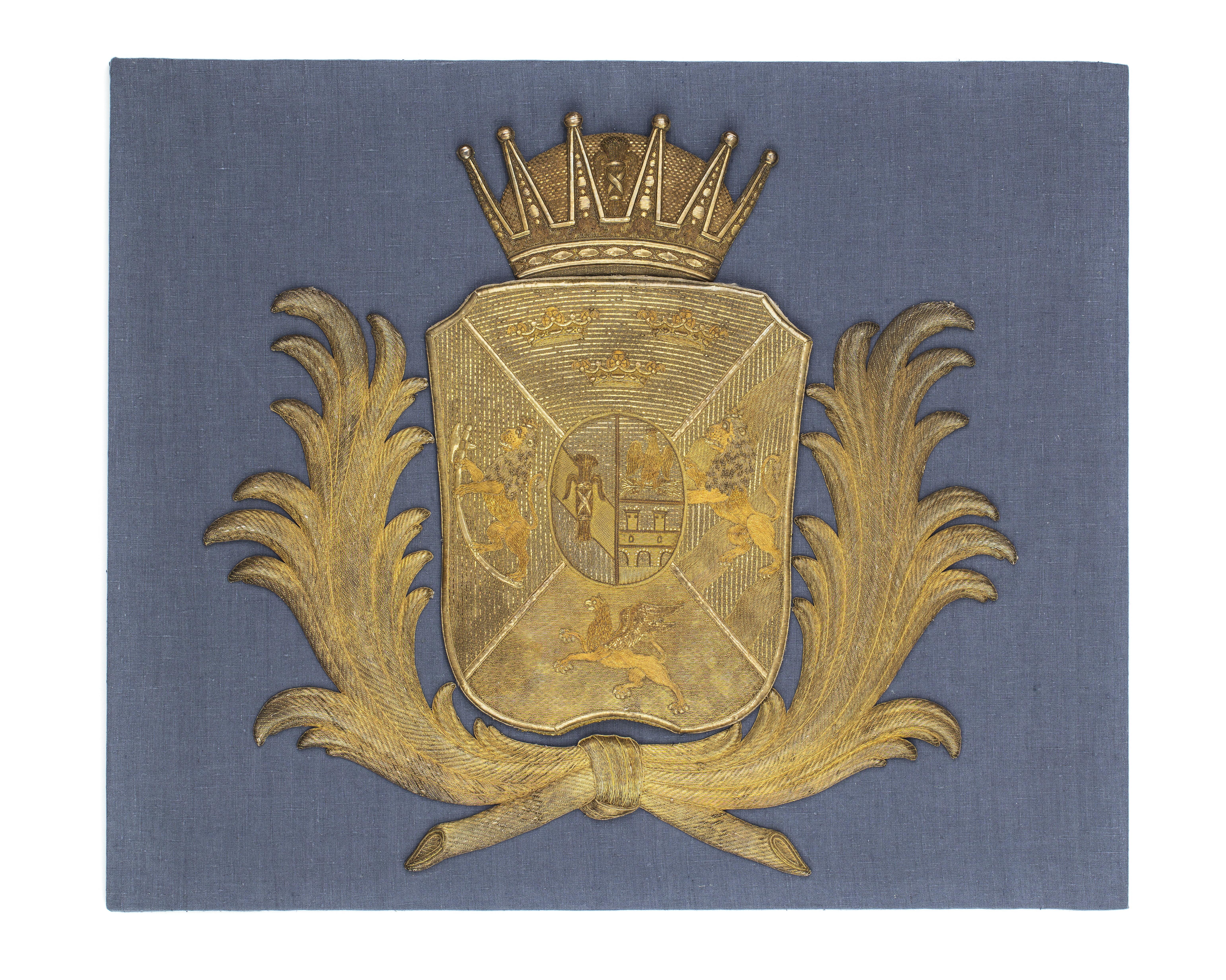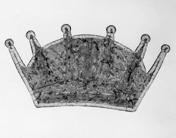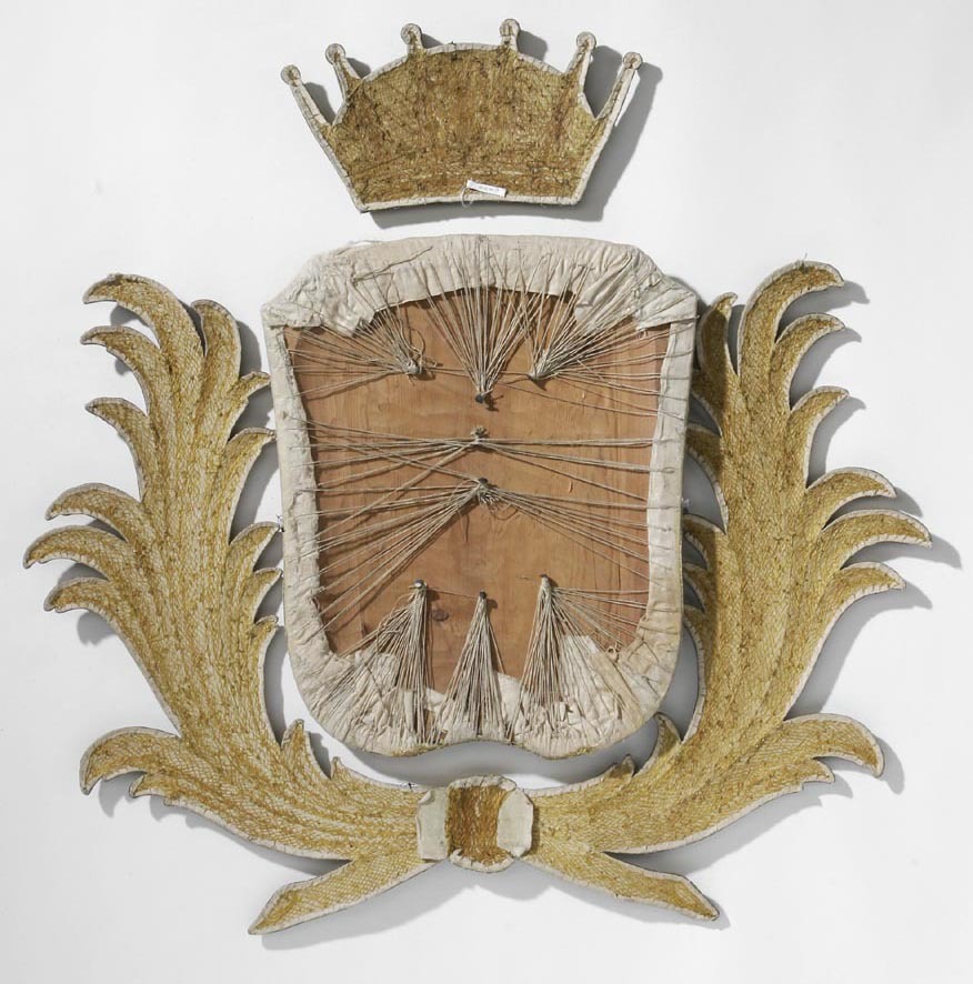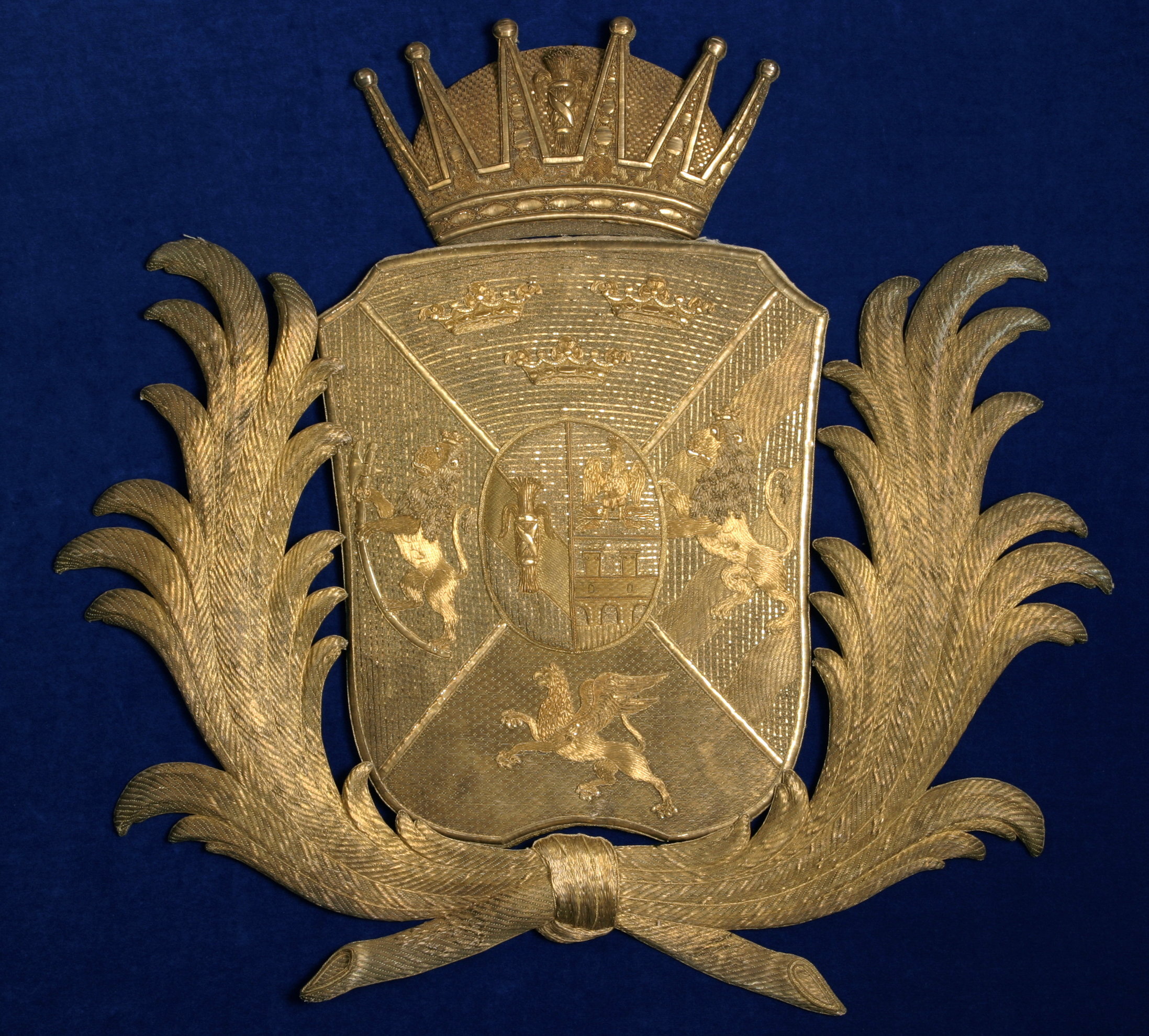 Hjärtskölden är kluven av Vasa och Ponte Corvo, böjd bro och den på en åskvigg sittande krönta örnen. Skölden är fyrstyckad med tre kronor i första, det norska krönta lejonet i andra och folkungalejonet i tredje fältet. I fjärde fältet en framåtseende grip med drakvingar halv upprest. Stommen är gjord i trä, konvex från framsidan sett. På framsidan ett vitt linne i tuskaft klistrat, från baksidan synligt 10 mm. Därpå är ett vitt siden klistrat. I det på baksidan synliga linnet är på 10 mm avstånd runt skölden fästa lintrådar vilka löper till baksidans mitt och där virade runt 8 st ej fult nerslagna spikar. Bottenbroderiet i guldlan och guldlantråd nedsytt med gult silke i läggsöm i det gula sidenet. Andreaskorset i guldlan. Lejon, grip och kronor applikationer på bottenbroderiet av guldlan, guldlantråd, paljetter och kantiljer. Hjärtskölden en applikation kantad med tre snoddar. Kronprinskronan har som bottentyg linne i tuskaft på vilket bottenbroderiet, av guldlan, guldlantråd och kantiljer är nedsytt med gult silke i läggsöm. På kronringens bottenbroderi i relief föreställande stenar och pärlor av guldlan kantade med kantiljer. Kronringens övre del har ett rankmönster av kantiljer och från kronringen utgår fem spetsformer av guldtråd nedsytt i läggsöm. Spetsarna slutar i en rund pärlform av guldlan kantad med kantiljer. Insidorna av spetsarna i läggsöm med guldlantråd. Fodret i guldlan och kantiljer, nämligen lodräta kantiljer möter en vågrät guldlan. På fodrets mitt en vase i kantiljer och guldlanstråd. Palmkvistar ombundna med rosett, reliefbroderi av guldlantråd nedsydda med läggsöm i diagonalmönster omger skölden.