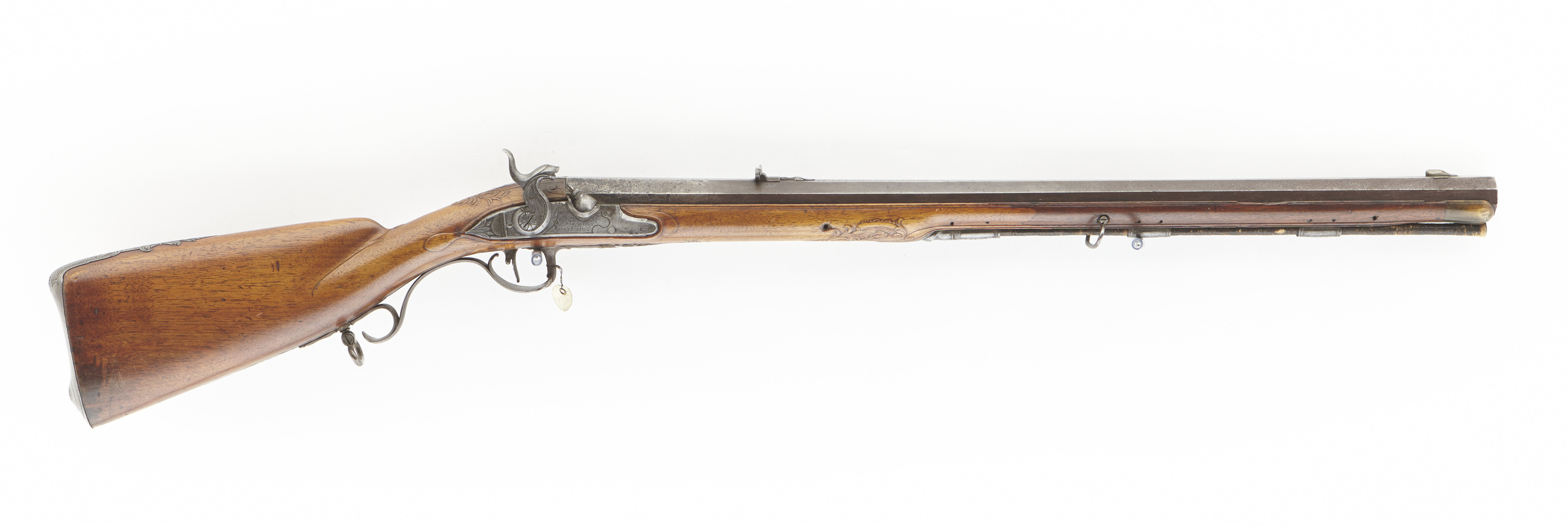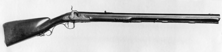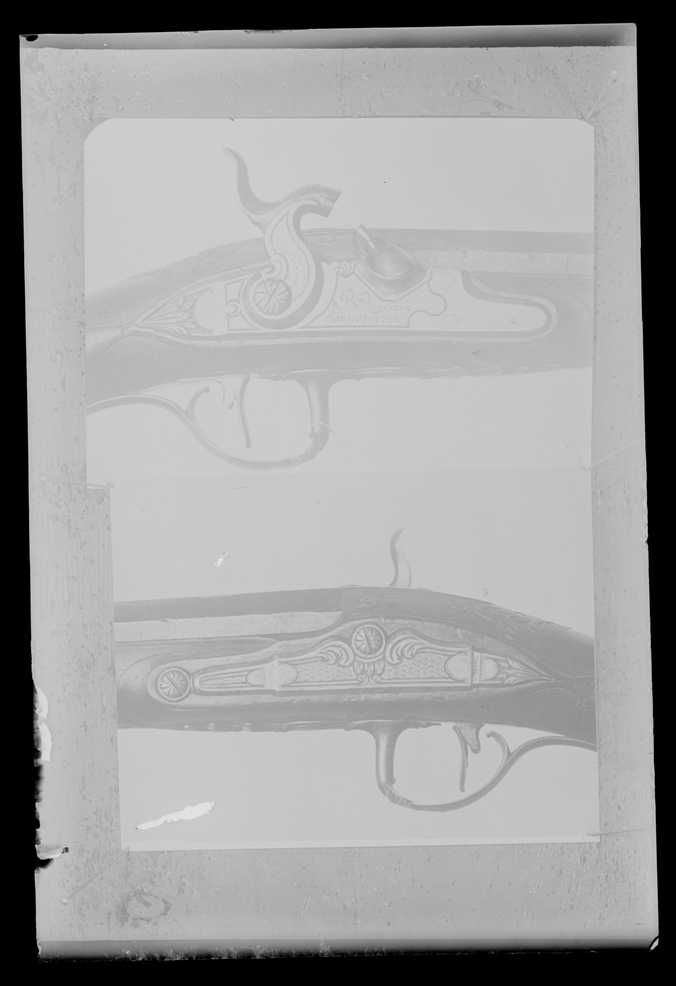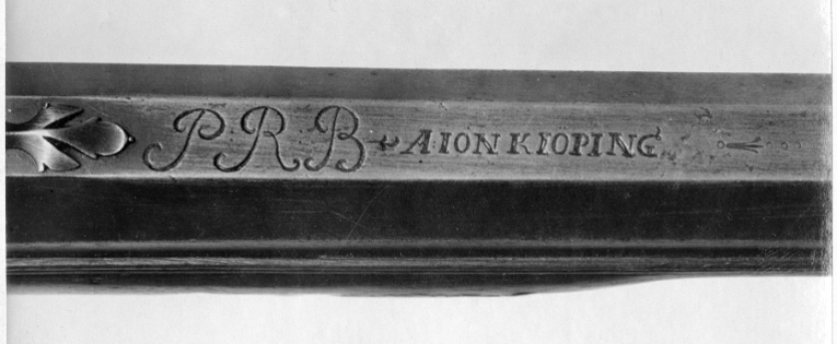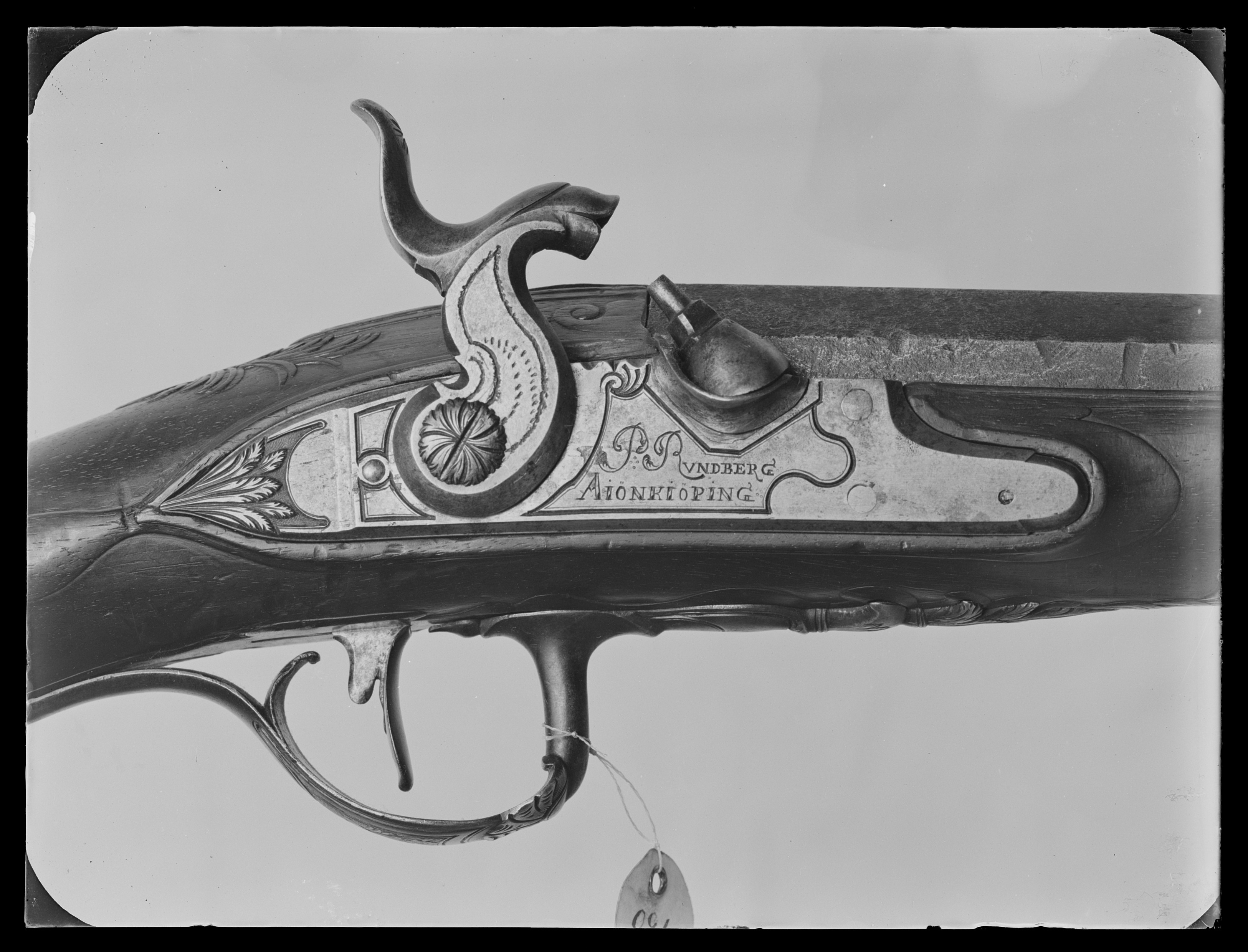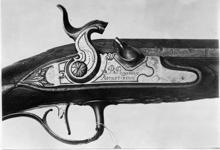 Åttsidig, ursprungligen brunerad (?), 12-räfflad pipa, plana räfflor. På h. sida en rundad snäcka med tändhattsnippel. Svagt böjt, baktill tvärt avskuret svansskruvblad. Graverad dekor, på svansskruvbladet ett bladknippe mot mörkpunsad bakgrund, framför skruvhålet kors av punsade ringar. Vid pipbasen graverat "A", framför siktet graverad signering: "P R B A IÖNKIÖPING", mellan PRB och Iönkiöping litet blad, framför signeringen likaså litet blad samt punsade ringar. Runt loppet en enkel ring och vid ytterkanterna en dubbel ring. Drall 3/4 varv. Riktmedel: Inlaxade riktmedel. Klaffsikte med en uppfällbar klaff på rektangulär platta med kanter fasade i längsriktningen, avslutning framtill med fasetterat treflikigt blad. Stolpkorn av silver med litet blad framtill. Fästning: Tre häften. Pipan fäst med krysskruv, bakre låsskruven i hak i svansskruvplattan samt främre rembygelns skruv, pipstiften saknas. Flintlås ändrat till slaglås, plant låsbleck med fasade kanter, något försänkt bakspets med lodrät profilering vid övergången. Graverade kantlister i form av bredare och därinnanför smalare linje, på bakspetsen bladknippe i låg relief mot mörkpunsad bakgrund. Framför hanen signatur: "P:RVNDBERG // AIÖNKIÖPING". S-formigt svängd, slaglåshane med mungipor och fasade kanter, hanskruv med blomformigt graverat huvud, grovt graverad kantlinje på hankroppen med antydan till fjäll, stjärnformig gravering på greppet. Enkel krage för tändhattssnäckan. Slag- och stångfjäder fint smidda med fasade kanter. Fästning: Två låsskruvar. Svagt böjd avtryckare, konturerat avtryckarbleck. Helstock av två träslag, bakre delen ljusare, skarv framför spetsrörkan. Lågt, rundat kindstöd. Fint snidad rankdekor i båda ändar av kindstödet, vid svansskruvbladet, varbygeln och spetsrörkan. Näsband av horn, övriga beslag av graverat stål. Kolvkappa med konturerad spets, bladknippen mot mörk bakgrund, avslutning i form av fem-flikigt blad, vid hälen fält med flätmönster, ring i varje ruta. Två fästskruvar med graverade skallar, runt hälskruven en ring, vid andra skruven tre koncentriska ringar, de två yttre dubbla, den innersta enkel. Plant sidbleck med fasade kanter, försänkta ändar, skålade fasningar vid övergången dekor i form av blad mot mörk bakgrund samt på mitten rutfält med ringar, litet rutfält även på den främre delen. Tre rörkor, alla med bladstavar längs mitten, slät spets. Varbygel med rundad framstolpe övergående i palmett vid bygeln, kluven bakre stolpe. Kraftigt nedsvängd bakre arm, nästan omböjd till ring vid bakre rembygen, rundad, 8-formig ändplatta med kraftig rembygel. Främre armen likaså rundad och 8-formig, avslutning i form av urna och femflikigt blad. Tillbehör: Laddstock av stål, l: 714 mm, helt lindad med svartnat snöre.