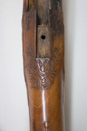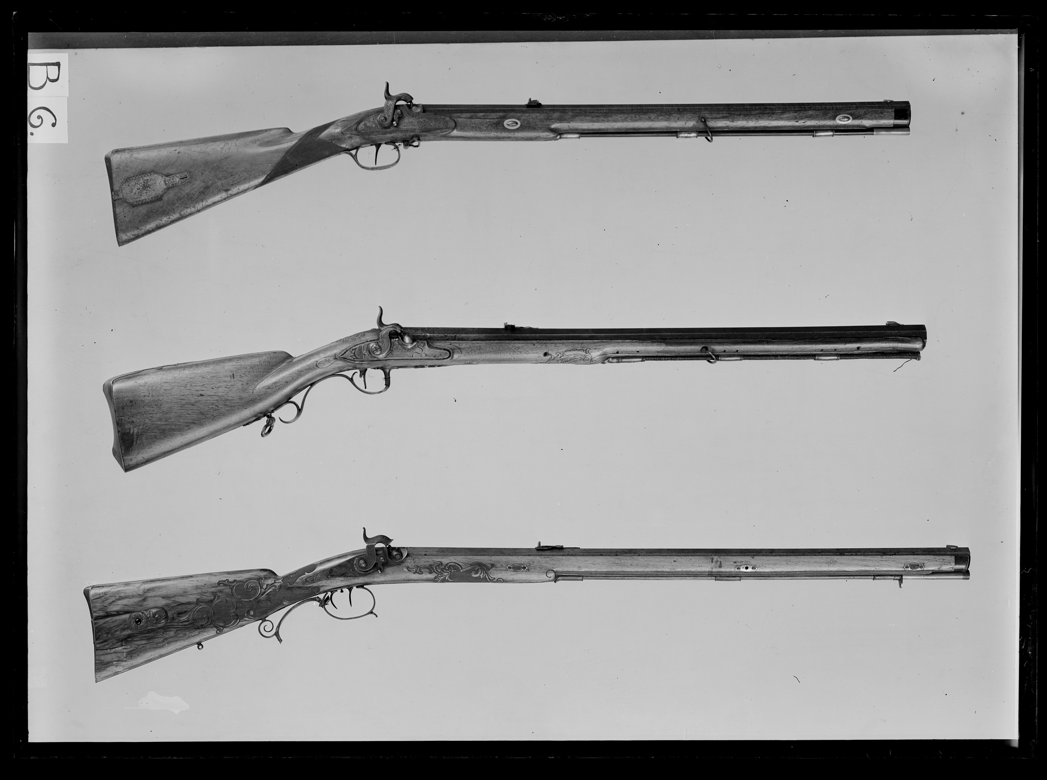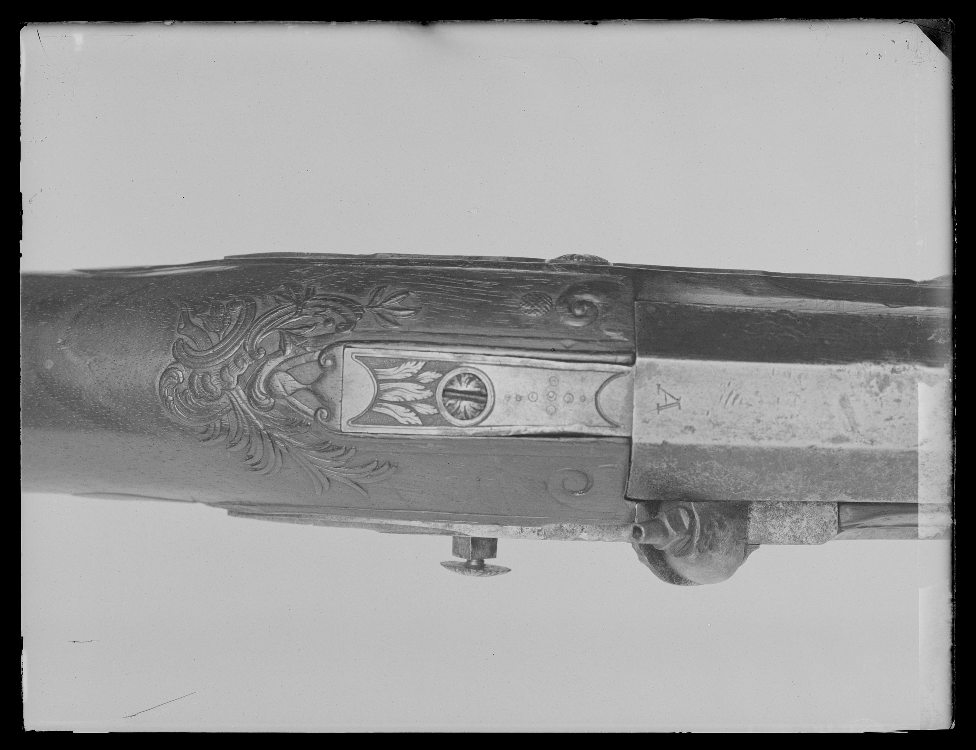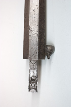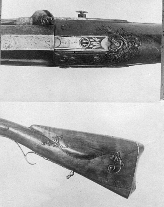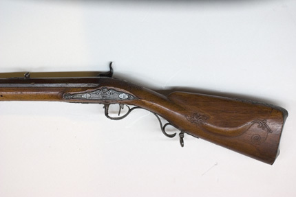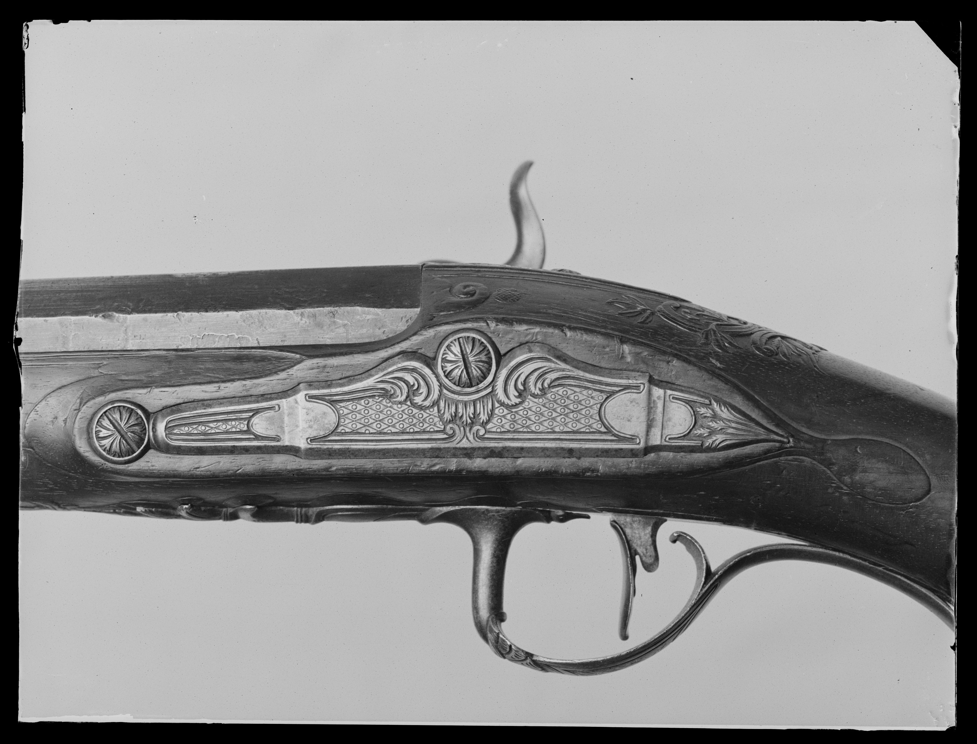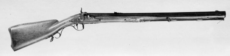 Åttsidig, ursprungligen brunerad (?), 12-räfflad pipa, plana räfflor. På h. sida en rundad snäcka med tändhattsnippel. Svagt böjt, baktill tvärt avskuret svansskruvblad. Graverad dekor, på svansskruvbladet ett bladknippe mot mörkpunsad bakgrund, framför skruvhålet kors av punsade ringar. Vid pipbasen graverat "A", framför siktet graverad signering: "P R B A IÖNKIÖPING", mellan PRB och Iönkiöping litet blad, framför signeringen likaså litet blad samt punsade ringar. Runt loppet en enkel ring och vid ytterkanterna en dubbel ring. Drall 3/4 varv. Riktmedel: Inlaxade riktmedel. Klaffsikte med en uppfällbar klaff på rektangulär platta med kanter fasade i längsriktningen, avslutning framtill med fasetterat treflikigt blad. Stolpkorn av silver med litet blad framtill. Fästning: Tre häften. Pipan fäst med krysskruv, bakre låsskruven i hak i svansskruvplattan samt främre rembygelns skruv, pipstiften saknas. Flintlås ändrat till slaglås, plant låsbleck med fasade kanter, något försänkt bakspets med lodrät profilering vid övergången. Graverade kantlister i form av bredare och därinnanför smalare linje, på bakspetsen bladknippe i låg relief mot mörkpunsad bakgrund. Framför hanen signatur: "P:RVNDBERG // AIÖNKIÖPING". S-formigt svängd, slaglåshane med mungipor och fasade kanter, hanskruv med blomformigt graverat huvud, grovt graverad kantlinje på hankroppen med antydan till fjäll, stjärnformig gravering på greppet. Enkel krage för tändhattssnäckan. Slag- och stångfjäder fint smidda med fasade kanter. Fästning: Två låsskruvar. Svagt böjd avtryckare, konturerat avtryckarbleck. Helstock av två träslag, bakre delen ljusare, skarv framför spetsrörkan. Lågt, rundat kindstöd. Fint snidad rankdekor i båda ändar av kindstödet, vid svansskruvbladet, varbygeln och spetsrörkan. Näsband av horn, övriga beslag av graverat stål. Kolvkappa med konturerad spets, bladknippen mot mörk bakgrund, avslutning i form av fem-flikigt blad, vid hälen fält med flätmönster, ring i varje ruta. Två fästskruvar med graverade skallar, runt hälskruven en ring, vid andra skruven tre koncentriska ringar, de två yttre dubbla, den innersta enkel. Plant sidbleck med fasade kanter, försänkta ändar, skålade fasningar vid övergången dekor i form av blad mot mörk bakgrund samt på mitten rutfält med ringar, litet rutfält även på den främre delen. Tre rörkor, alla med bladstavar längs mitten, slät spets. Varbygel med rundad framstolpe övergående i palmett vid bygeln, kluven bakre stolpe. Kraftigt nedsvängd bakre arm, nästan omböjd till ring vid bakre rembygen, rundad, 8-formig ändplatta med kraftig rembygel. Främre armen likaså rundad och 8-formig, avslutning i form av urna och femflikigt blad. Tillbehör: Laddstock av stål, l: 714 mm, helt lindad med svartnat snöre.