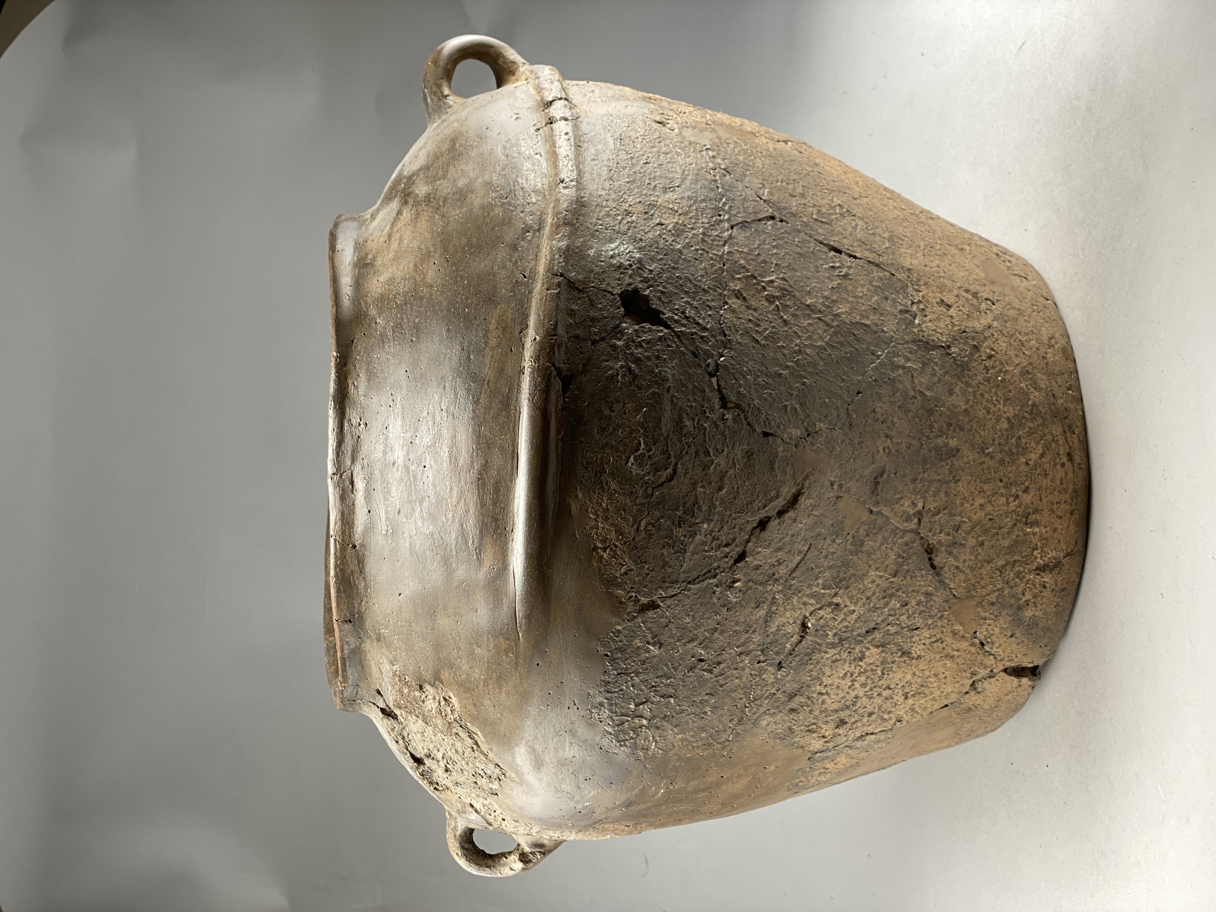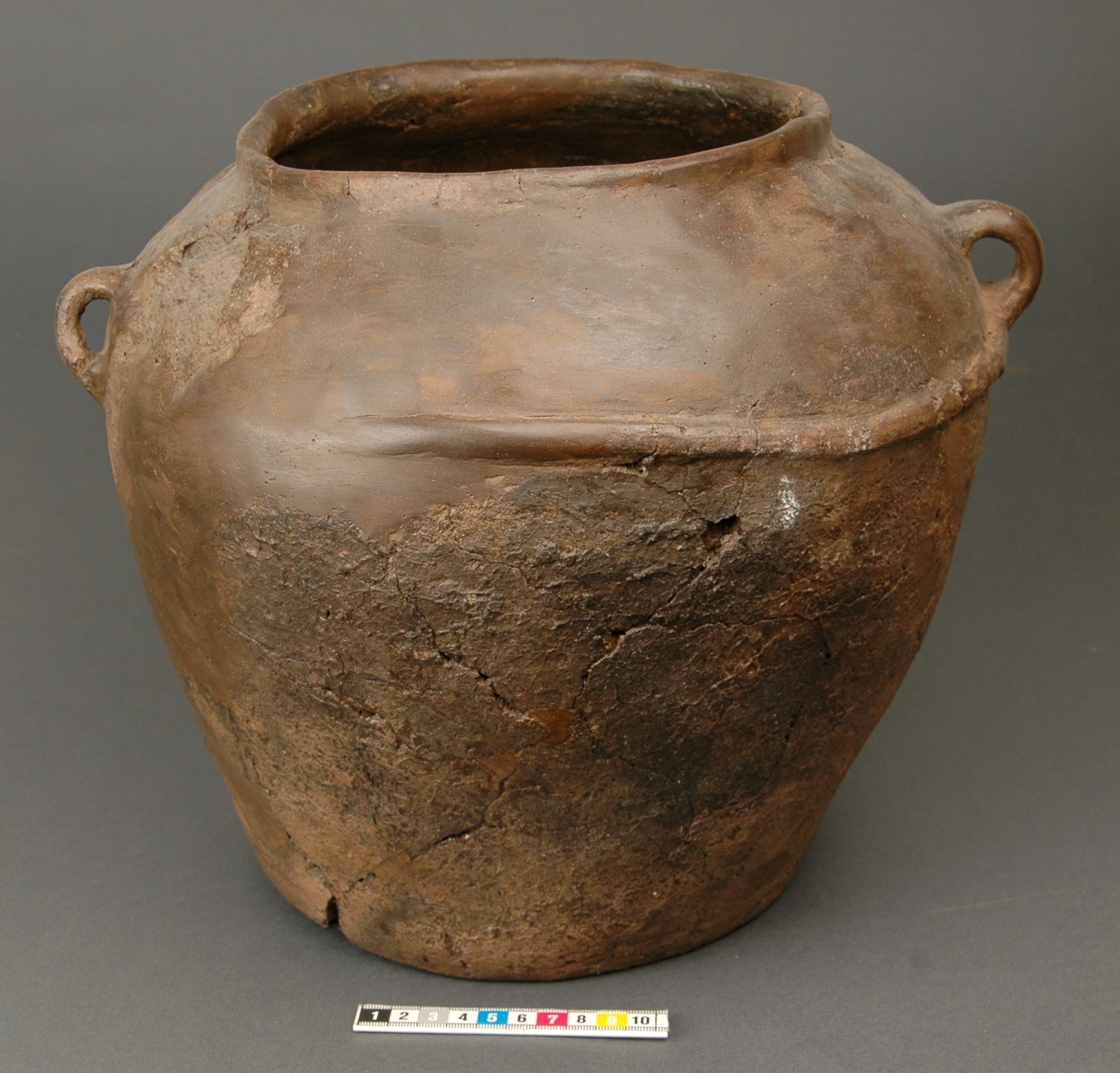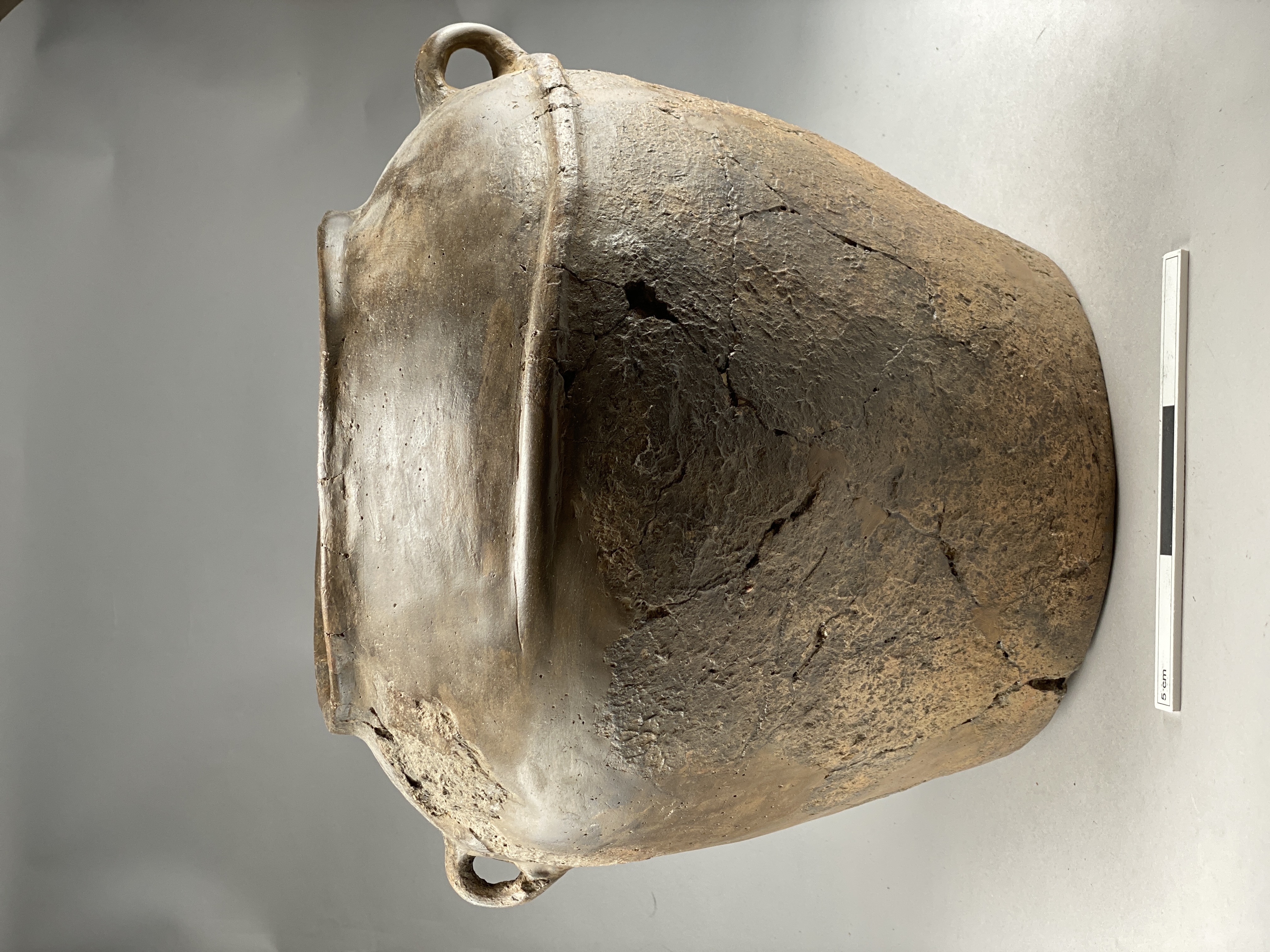 Stort lerkärl av grått gods med gråbrun yta. Sidoprofilen nedåt är rak, välvd skuldra, låg mynningsrand med rundad kant. Vid övergången till skuldran sitter två öron och i höjd med deras nederdel löper en runt om en cm-bred rundad vulst. övre delen av kärlet har polerad ytan, under vulsten är kärlet rabbat. Till urnan hör ett likaledes med öra försett välvt lock.