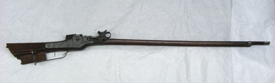 Lås av platt och slätt stål med rundad bakre kant. Hjulkapseln cirkulär, platt och slät med runt axeln ring med små räfflor. Fyrsidig axel nertill skuren flikig. Hanfjäder med fasad kant, baktill rund med liten klack och framtill platt med graverade voluter och utdragen bladformig ände. hanfjäder och hanfot förbunden med balusterformig tvärslå. Hanfot med svända utstående ändar, kroppen balusterformig, halsen oregelbunden, platt och bred med skurrna linjer och cirkulärt genomgående hål. Käkarna framtill rektangulära och tvärt avslutade. Övre käken med gavel och ring av platt stål. Fängpanna med svagt välvd utsida och fasad kant, fingergreppet med raka släta kanter och S-formig profil. Slagfjäder med fasade kanter och skurna ändar, nertill som volut och upptill tandad. Stången med platt och blånerad utsida. Slagfjäderstudeln med skurna linjer. Fängpannelockets arm och fjäder är blånerade. Studeln med S-formiga sidor och enkla skurna linjer. Fästning: Ursprungligen två låsskruvar, en saknas nu. Rak spetsig hane med cirkulärt tvärsnitt. Enkel varbygel av blankt stål med svagt rundad utsida. Rak, framtill böjd uppåt med spetsig ände. Y-formig stolpe, nertill hopgående med bygeln i ett profilerat utskott, ändarna upptill flikiga. Helstock av tysk typ, tillverkad i ett brunfärgat trä. Framstocken lång och slät med näsband och stockbeslag av blank slät stålplåt. Två hål för pipstift. Öppen kanal för laddstock. Kolven med hög nacke och och låg rak och platt rygg. Sluttande sidor, anslagssidan svagt välvd. Kolvlåda på undersidan, locket med svängt spetsigt bakparti. Hög och kort vinge med rundad urtagning bak, rakt framparti med bakåtriktad skuren volut.