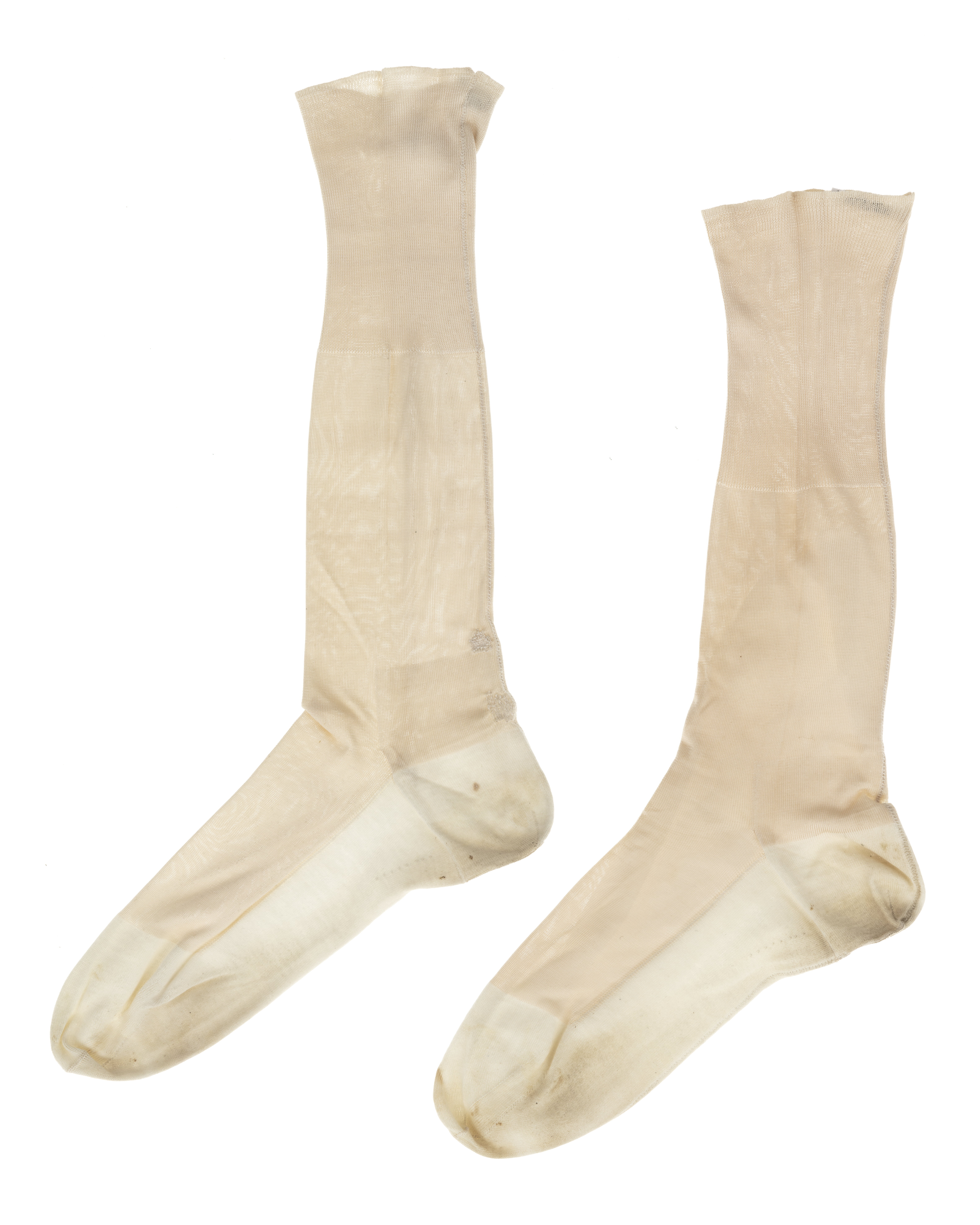 Strumpa i benvitt silke. Förstärkningar i tån, hälen och under foten. Längst upp i benet resårstickning l: 135mm. Har enligt uppgift tillhört res- och grävdräkt, och är samhörande med 13967-68, 14060-64 samt 14015-16.