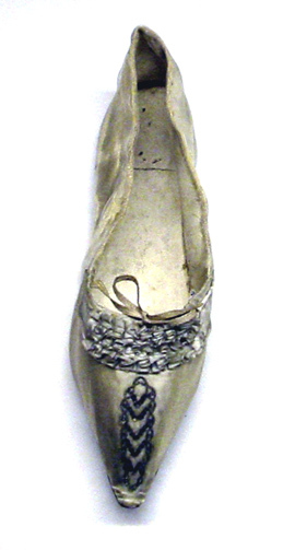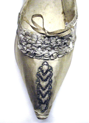 Skon har rak läst, liten klack och spetsig avsmalnande tå. Modellen skuren i två delar som förenas i sidorna med sömmar samt en söm mitt bak. Skon är fodrad med benvitt linne i ovanlädret och i bakstycket med benvitt getskinn? Innersula är gjord av benvitt getskinn och har två små hål i hälpartiet efter pligg. Bakstycket har över mittsömmen förstärkts med ett 26 mm brett band av getskinn? I skons ringning är insatt en 3 mm bred dragsko av beiget siden som framtill avslutats i en rosett. Framtill i ringningen har skon en dekor av ett benvitt 12 mm brett sidenband som veckats ihop. Mitt fram över tåpartiet är skon dekorerad med ett guldtrådbroderi, längd 55 mm, bredd 15mm. Broderiet är uppbyggt av guldpaljetter i fem så rader som i sin tur omgärdas av ett flätband av guldtråd. Klacken är klädd med benvitt sidenatlas fastsatt med lintråd som sytts fast rakt genom innersulan. Klacklappen av brunt nötläder fastsatt med en större träpligg mitt på klacken samt tre mindre i rad. Yttersulan gjord av mörkt brun ruggad nötläder med stämpel i form av 2 små streck ,en under trampet och en i hålfoten.