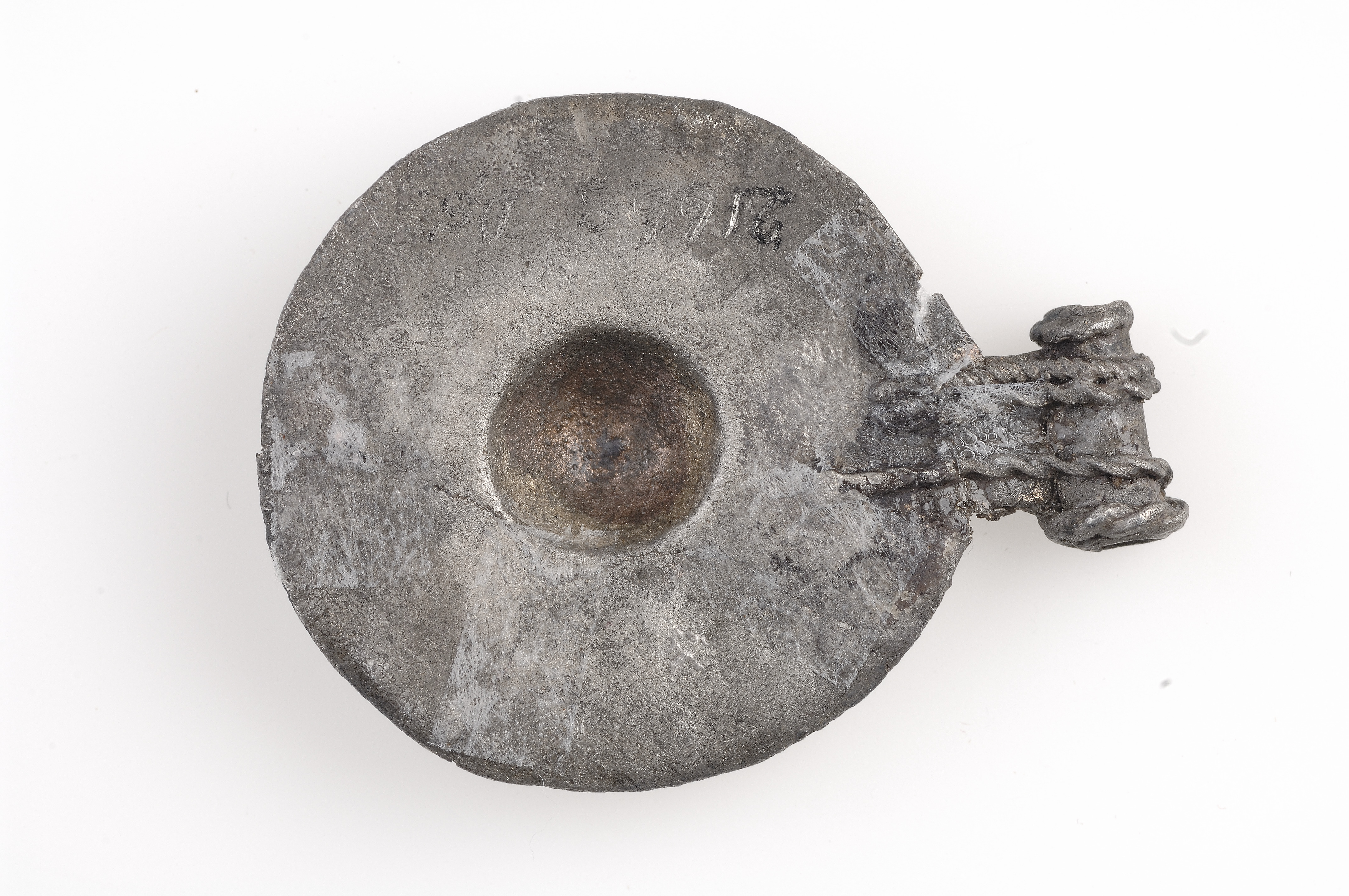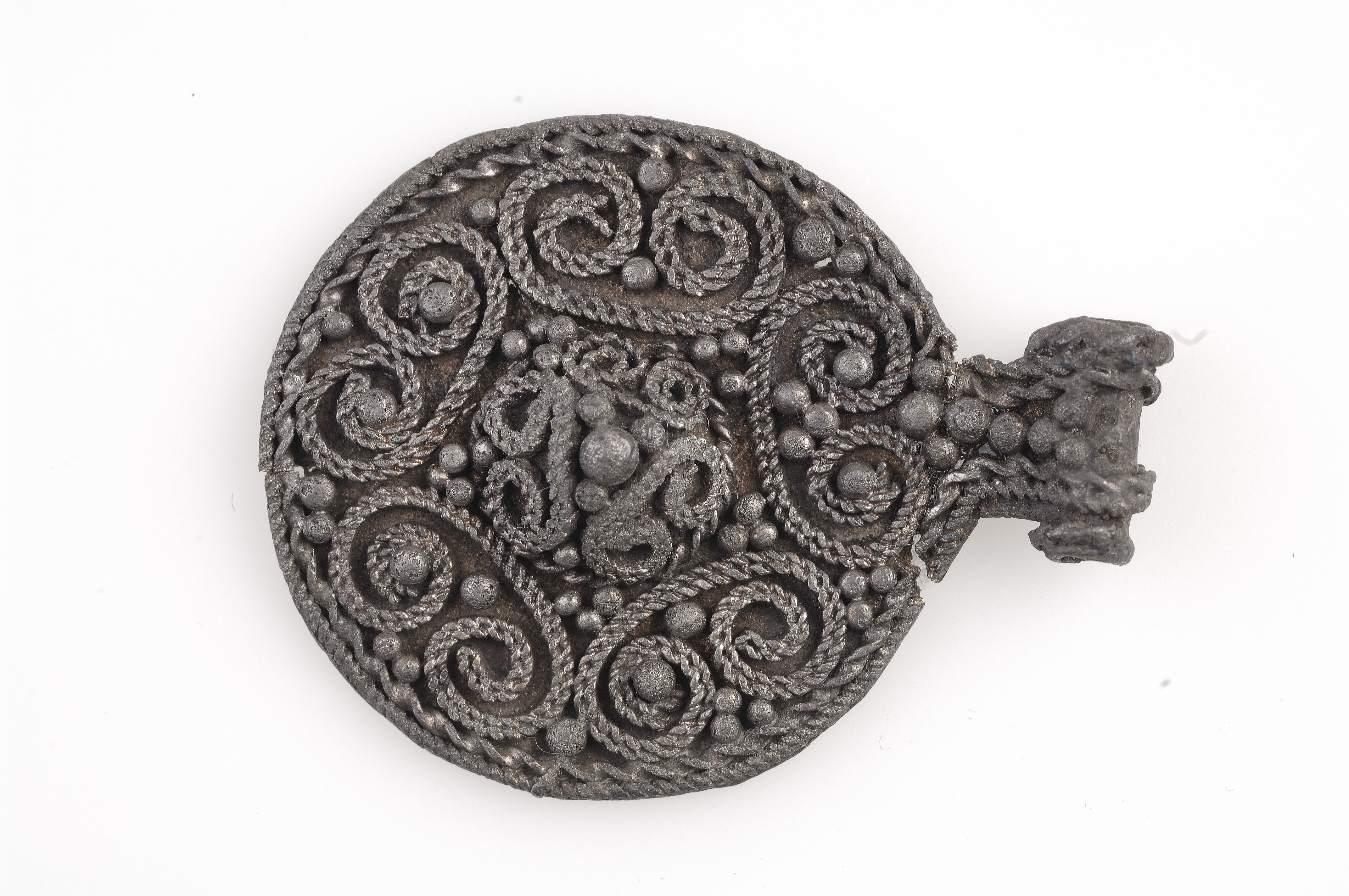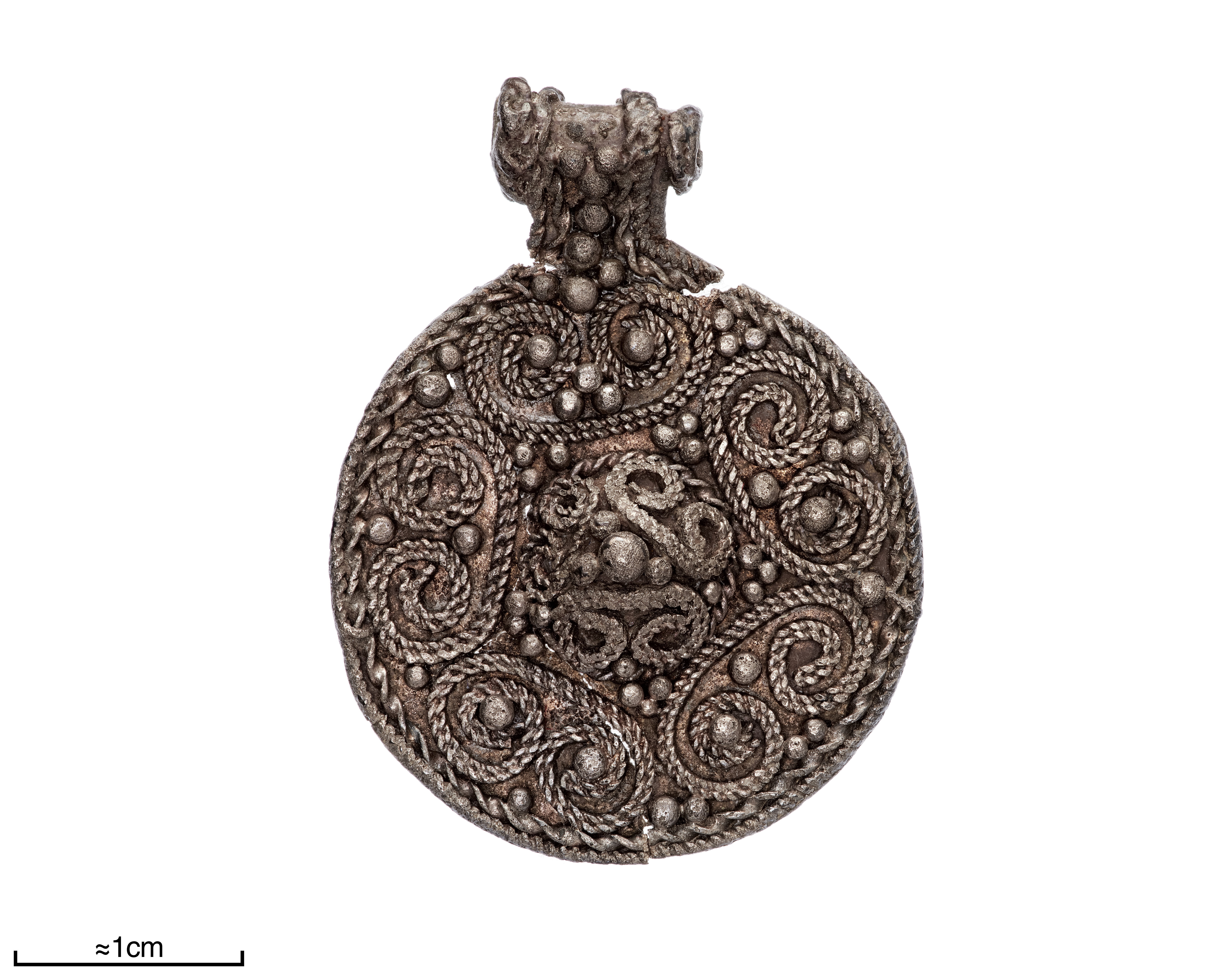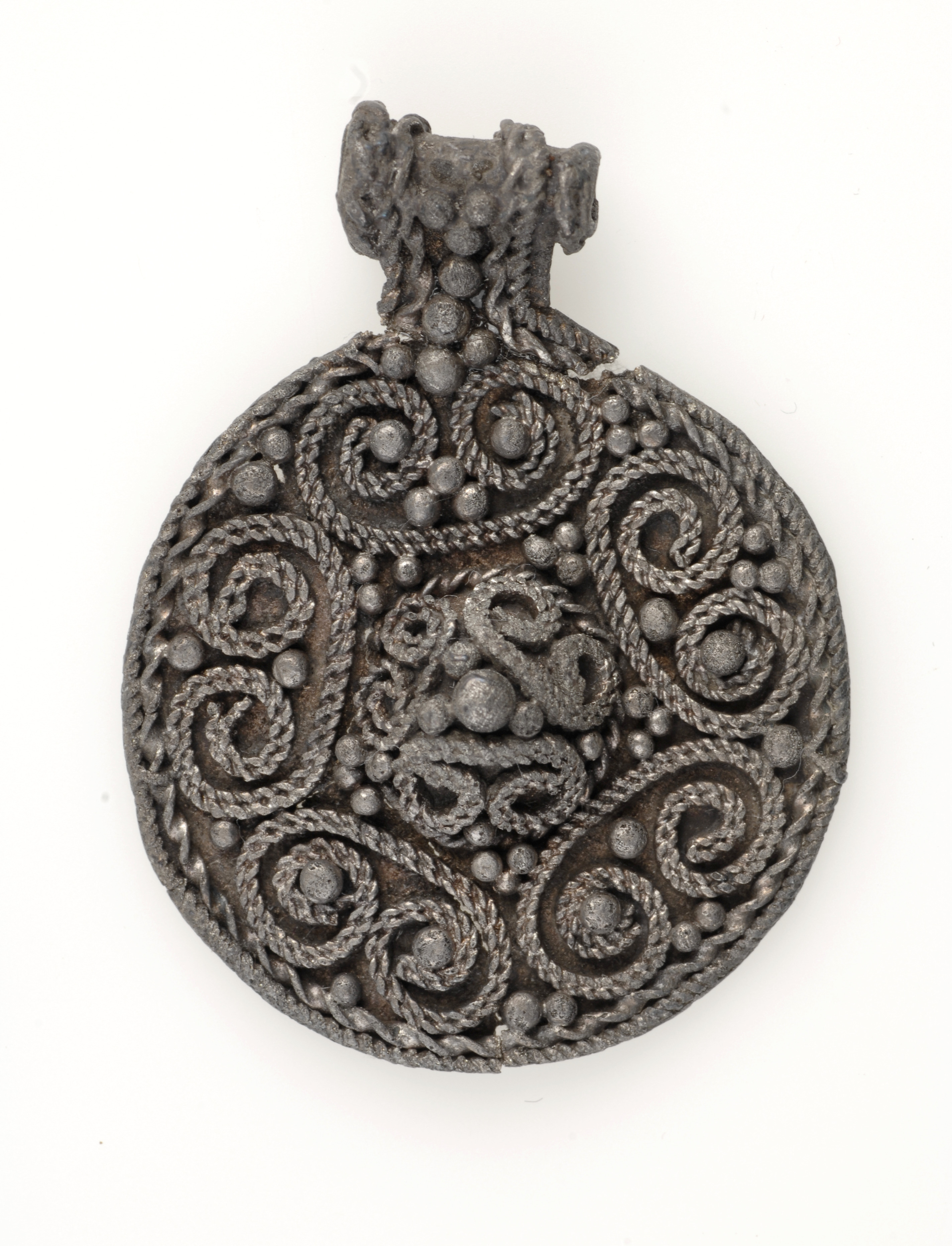 Förgyllt. Ornamentik filigranarbete i form av fem dubbelspiraler. I mitten en halvsfärisk buckla. Mellan spiralerna silverkorn, dels estaka, dels grupperade om tre.