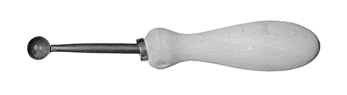 LEGYMJÄRN Av järn med träskaft. Med nästan halvsfärisk skopa, i vars botten ett runt hål, samt lång rundstavig skaftstånge, på vars ytterände skaftet är fäst. Skaft av rödbok, svarvat och spolformigt, med vulstformigt utsvälld innerände, avslutad i en rund tapp, skodd med en ring av bleckplåt. Längd: 15,1 cm. Skopa, diameter: 1,2 cm. Skaft, längd: 9,3 cm.