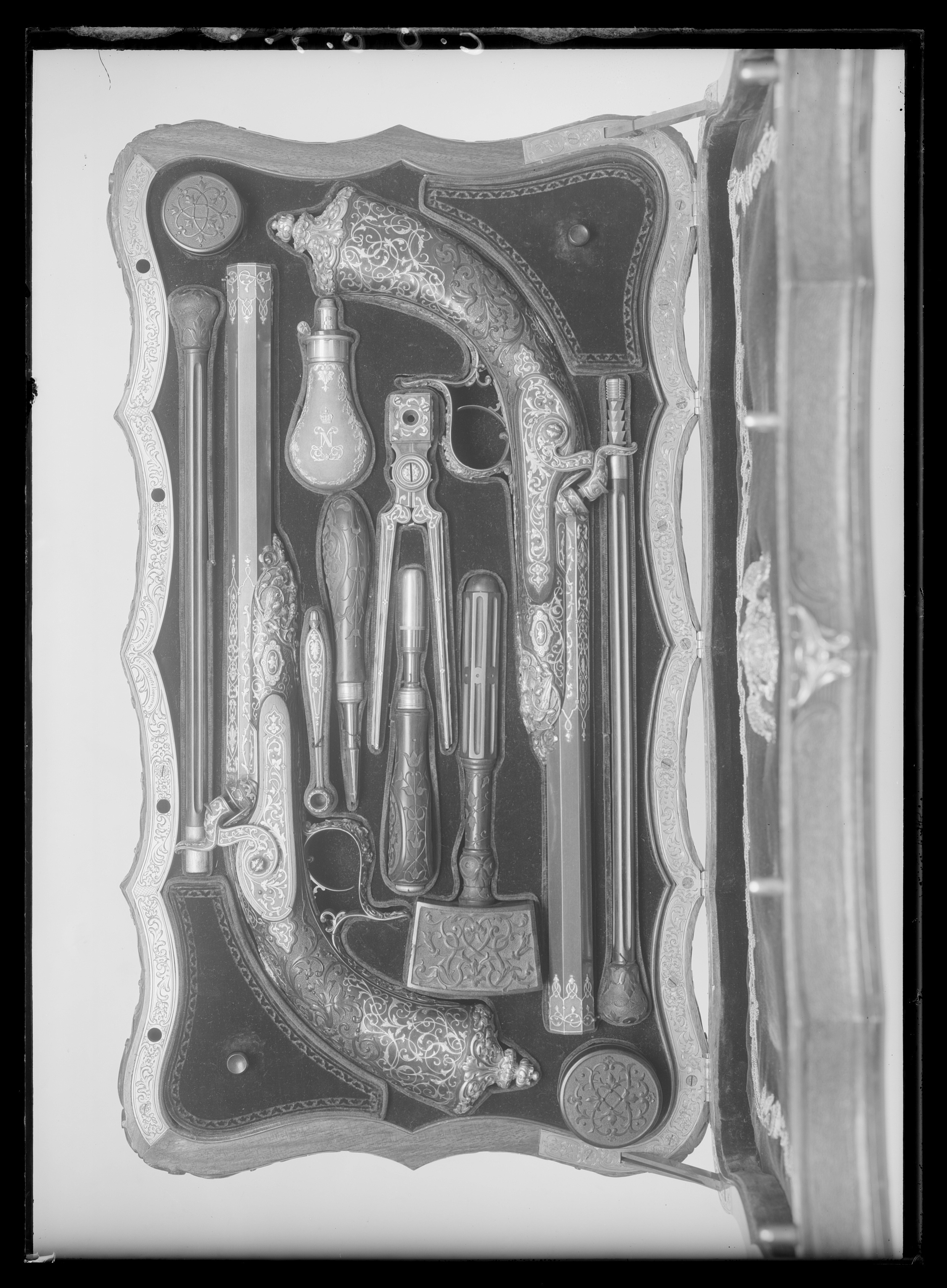 Åttsidig, brunerad, räfflad pipa. 12 räfflor, mycket smala bommar. På kammarens ovansida intill 123 mm från pipbasen samt runt mynningen, reliefornering i form av rankor, blad och blommor omväxlande av förgyllt silver och guld. Mellan dessa fält på pipans ovansida text i förgylld relief: "GASTINNE-RENETTE ARQ.DE S.M. L'EMPEREUR." På kammarens undersida oval, stämpel: "GR" nedanför sluten krona, därefter siffror: "11.1855.900". På sidan snäcka med tändhattsnippel samt hake för baskylen. Riktmedel: Ståndsikte och inlaxat knoppkorn av blånerat stål. Fästning: Häfte för engelskt pipstift. Slaglås av brunerat stål med framåtliggande slagfjäder, lika dekor som den på pipan. Avtryckare av brunerat stål. Halvstock av jakaranda med böjd kolv tvärt avskuren, med ovalt tvärsnitt, med yttäckande dekor av rankor, blommor och blad, dels snidade dels i form av guldinläggningar. Beslag: Kolvkappa, varbygel samt framstockens ändbeslag av förgyllt silver i driven högrelief. Kolvkappan med blad, blommor samt utdragen i en profilerad spets med kulformig blomliknande avslutning. Varbygeln med mansmaskaron, framstockens beslag i form av örn omgiven av rankor. Spetsoval, konturerad pipstiftsbricka av guld. Engelskt pipstift. På kolvnacken medaljong av guld med Napoleon III:s vapen.