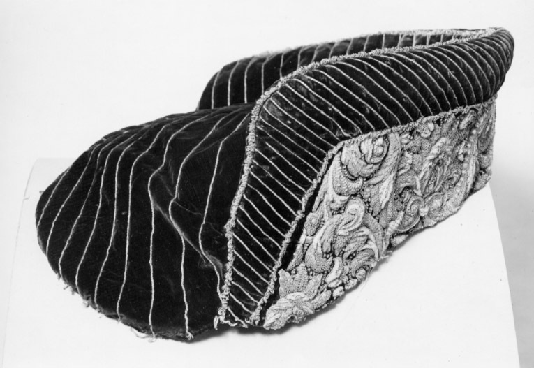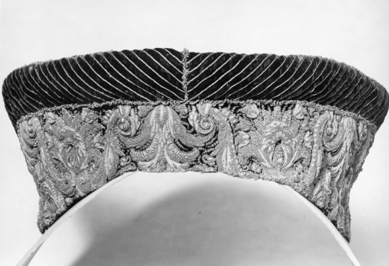 Bakbom, 160 mm hög, 630 mm bred. Sits klädd med lila sammet med på insidan parallella stickningar med tvinnad guldtråd. Stickningarna vinkelformigt utgående från mitten. Främre delen av sitsen vågformigt konturerad. Baksidan av bakbommen med broderier med guldtråd och guldlan samt pärlor i form av rankor och voluter. Tillverkad i Frankrike. Har tillhört drottning Kristina (1626-1684).