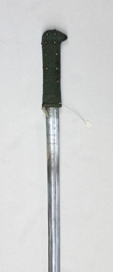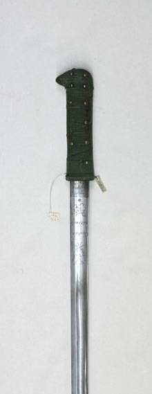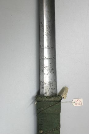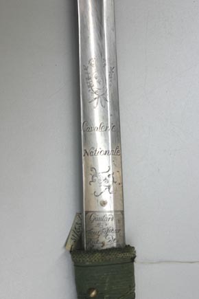 Pallasch med schaschkafäste bestående av enbart kavel med näbbformigt framåtskjutande överdel. Kavel med ovalt tvärsnitt, tätt lindad med spunnen, grön ylletråd och jämte överdelen smyckad med tjugoen nitar med kupiga mässingshuvuden ordnade i längsgående rader, kring kaveln fyra snedställda varv av två tvinnade tunna koppartrådar. Överdelen klädd med virkat tunt överdrag, näbben med slätt mässingsbeslag. Kavelns nederdel skodd med virkad grön bård. Klinga rak, eneggad . Utmed hela längden en bred hålkäl, utmed mittpartiet närmast den plana ryggen en ca 470 mm lång smalare dylik. Baspartiet på båda sidor med etsad ornering. Vid, basen fyrsidigt fält, vari svärdfejarens signering i skrivstil: "Gaulard Md Fourbisseur Rue de Beauregard". Därovanför ett asymmetriskt rankornament tecknat med tunna linjer samt inskription i skrivstil: "Cavalerie Nationale". Inskriptionen under en krönt oval vapensköld vari tre franska liljor, ställda två över en. Skölden mellan två korslagda tunna bladkvistar (lager?).