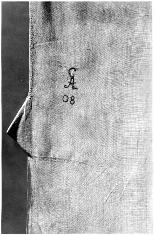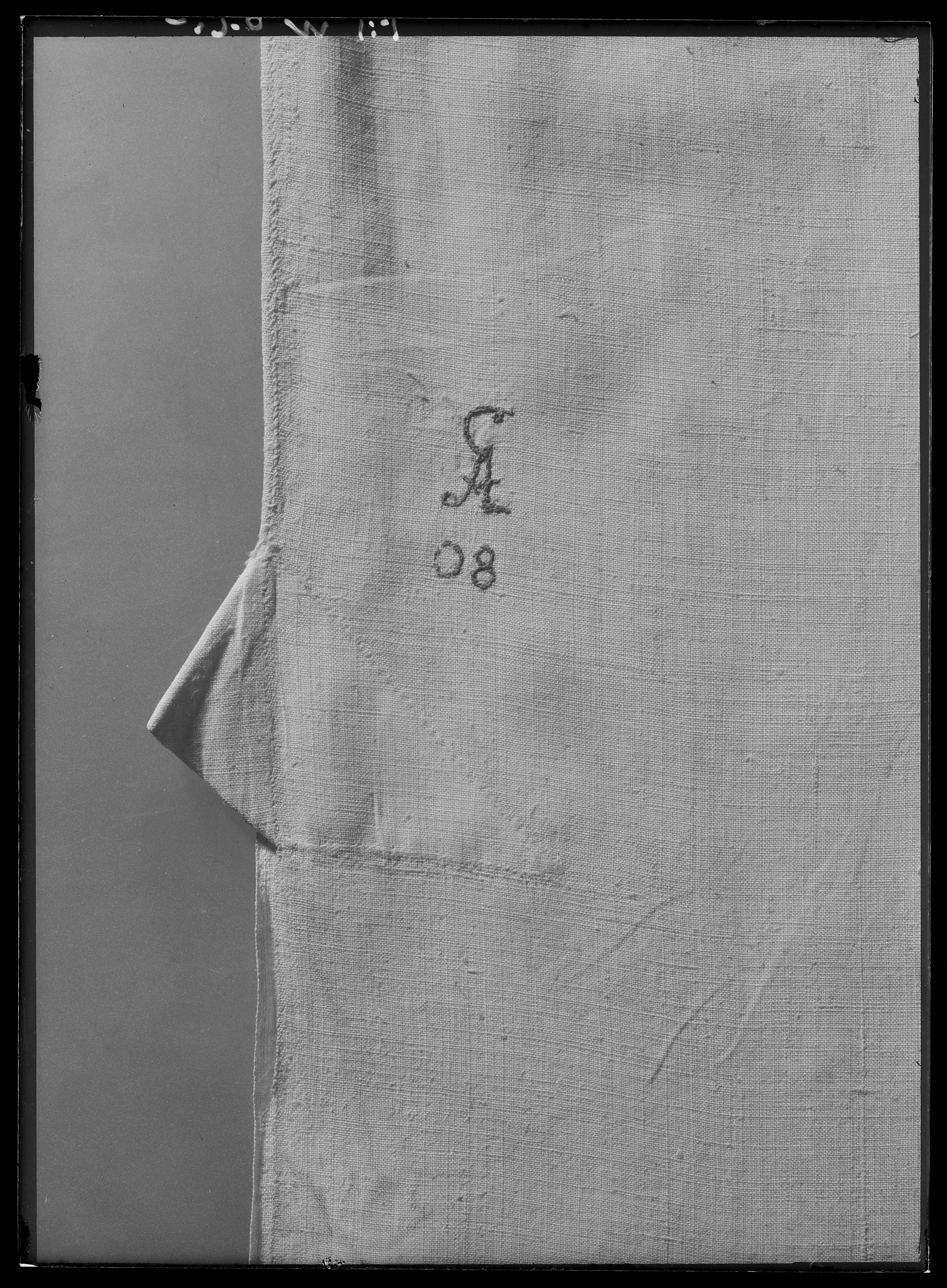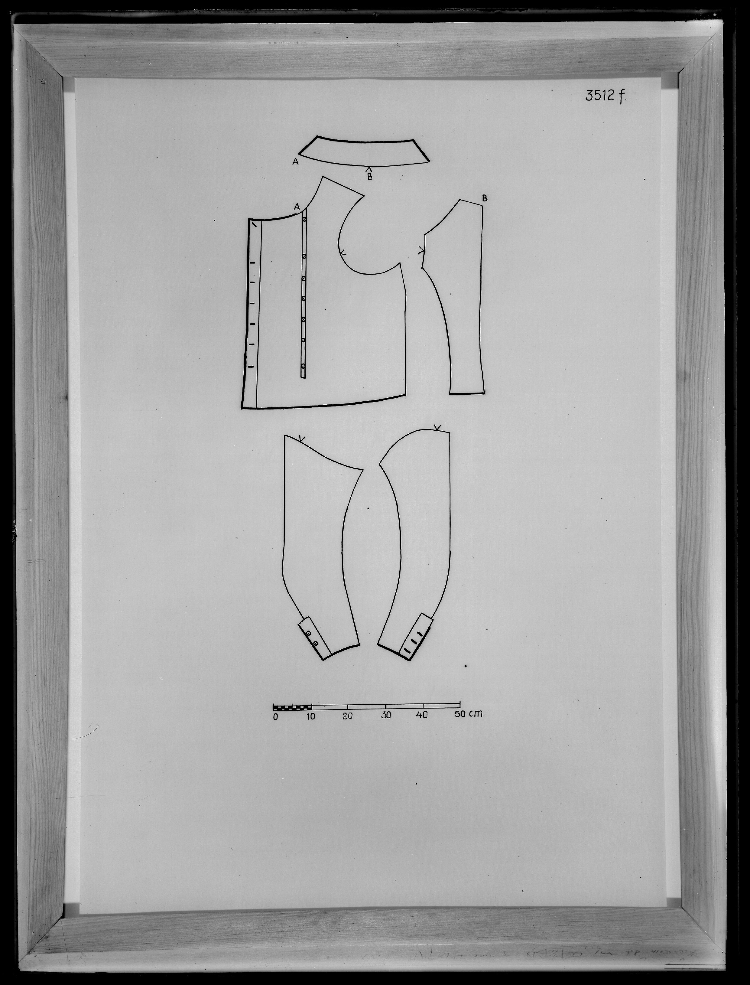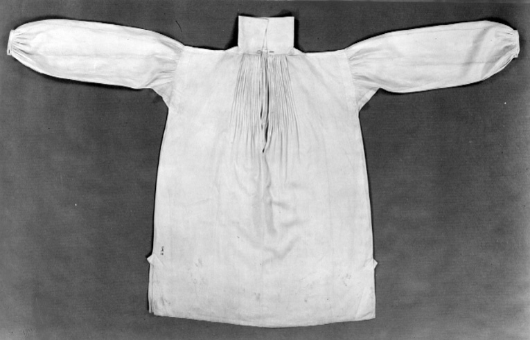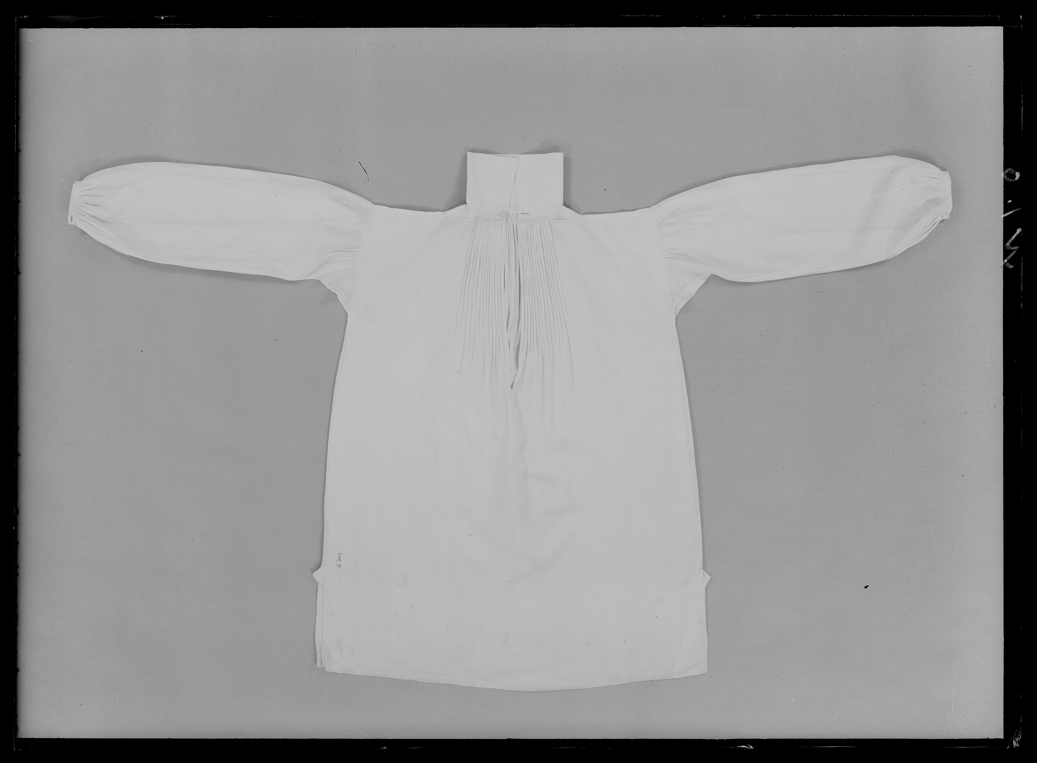 En nattröja i vit, gulnad linnelärft. Dubbelknäppt med vita klädda knappar. Knapparna sitter fästade på ett vävt band. Armsluten/manchetterna knäåås med tre stycken klädda knappar på vardera sida. Ståndkrage. Smal modell med tre stycken ryggsömmar. Aningen kortare bak än fram, ca. 3 cm.
