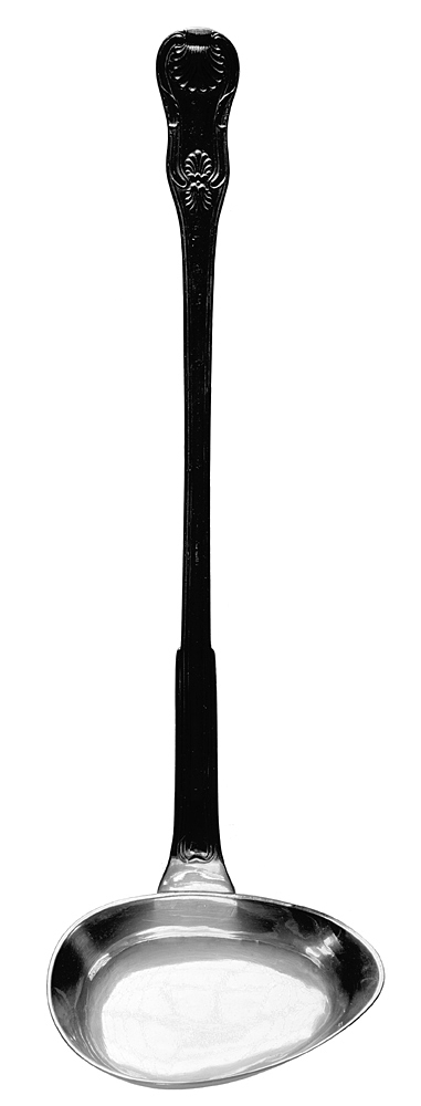 SOPPSLEV. Blad ovalt med svagt kupig botten, något snett uppstående kant och utsvängd brädd samt tvärställd mot skaftet. Skaft smalt, platt, långt starkt uppsvängd ytterända. Vikt: 296, 2 gr. Längd: 40 cm. Blad längd: 12,7 cm, bredd: 7,8 cm. Skaft längd: 33,5 cm. Svenskt arbete, Stockholm från 1842. Gustav Möllenborg mästare 1823. Gåva till Johanna Wallis och Wilhelm Kempe på dera första lysningsdag 1843 från hennes mor Johanna Wallis. Inköpt av den sistnämnda år 1843 hos guld- och silverarbetaren Gustav Möllenborg. +++++ *SOPPSLEV, Gustaf Möllenborg (1823-1850/1927), Stockholm, 1842. L. 40 cm. Nr. VII:K.III:G.n.1.