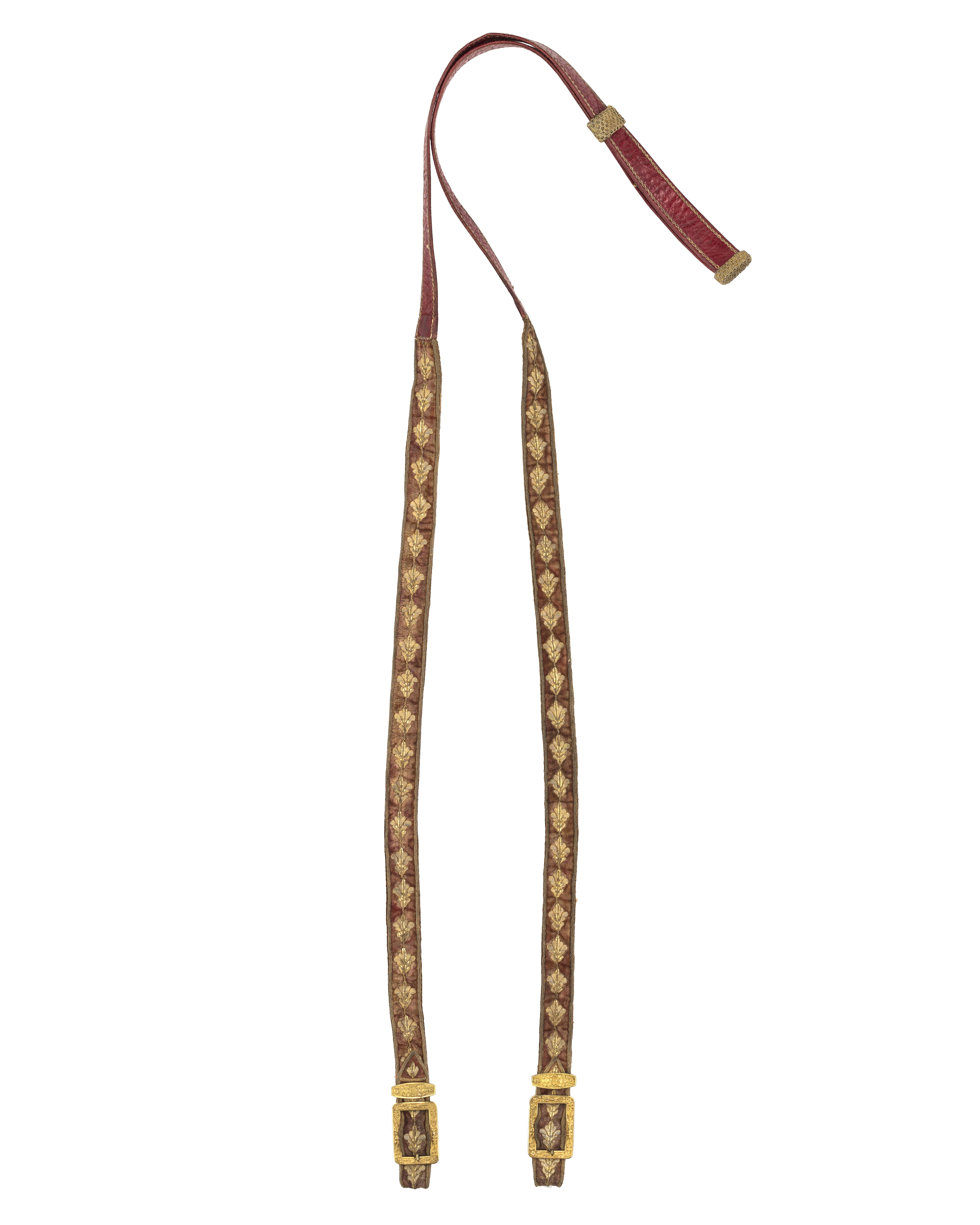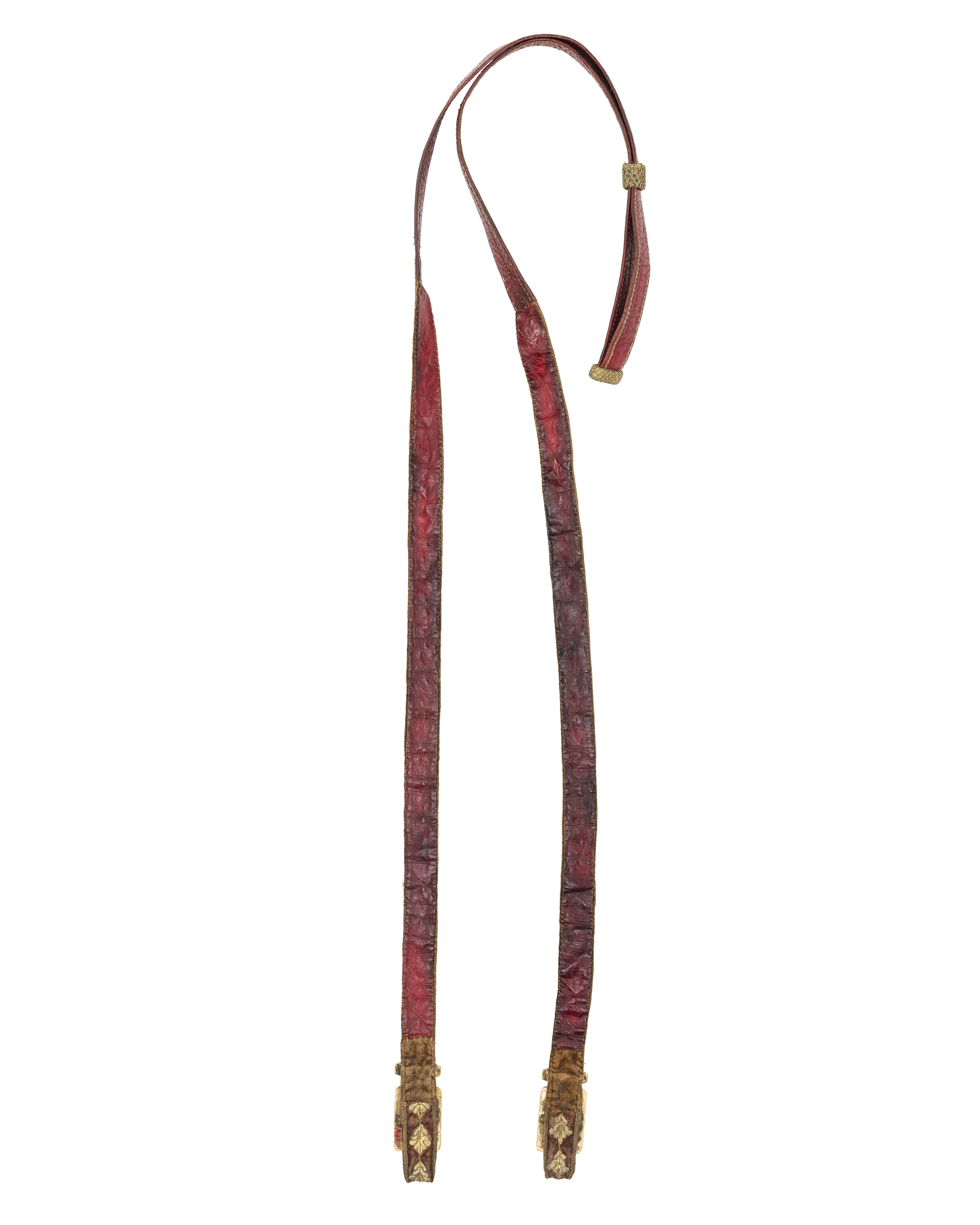 Tyglar, 29 mm breda, till hälften klädda med sammet, i övrigt av rött läder med kantstickningar av dubbel tvinnad guldtråd, valknut och löpare av guldtråd, nätöverklädda. Två söljor.