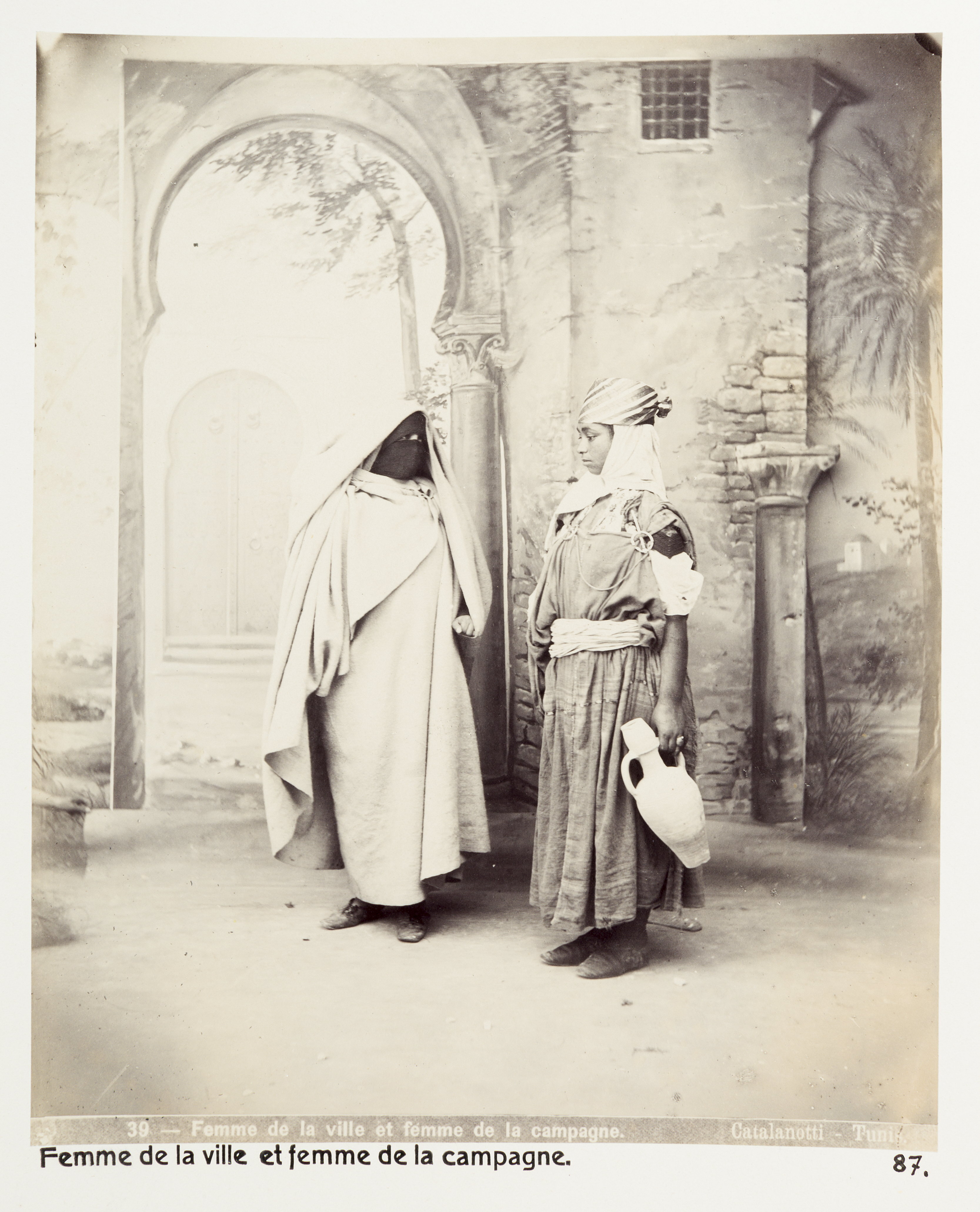 Tunis, Tunisien. Kvinna från staden och kvinna från landet. Bilden är en dubblett till LXVI:F.84. Bilderna med inventarienummer LXVI:K.H.01.-137. är inköpta av Johanna Kempe, f. Wallis, i Alger, Biskra, Tunis, Constantine, Oran och Blidah vid hennes vistelse i nämnda städer tillsammans med sin dotter och svärson, Wilhelmina och Walther von Hallwyl, dotterdottern Irma samt fröknarna Caroline Pflaum och Ida Uhse under deras resa genom Algeriet och Tunisien samt åter över Schweiz 11 februari - 19 maj 1889. Förestående uppgifter lämnade med ledning av fröken Ida Uhses Reseanteckningar. Vissa av bilderna är dubbletter till bilder i inventarienummerserien LXVI:F.01.-138. som köptes in av Wilhelmina von Hallwyl under samma resa.