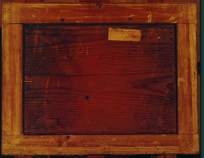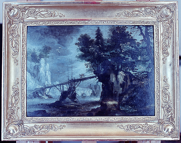 Tyrolskt bergslandskap med bro över vatten. Träd och 3 människor på bron, en leder en åsna. Förgylld 1800-tals ram med pastellageornament, listens bredd 70 mm. På baksidan Wrangellapp " No 726 Eine kleine Landschafft". Med rödkrita: "Skrifwit i fattburn". Upptill på ramen med blyerts " SKOKLOSTER". Nedtill på ramen med blyerts " Fr. blåa sängkammaren". På pannån med vit krita: 101. Högst sannolikt ett original målat av Roelandt Savery c.1608-09 under resa till Tyrolen, alt efter hemkomsten till Prag. Jmf med samtida kopparstick av Aegidius Sadeler med identiskt motiv efter original av Savery. Det existerar ingen annan känd målning av Savery med samma motiv. Tagen i Prag 1648, antingen ur Rudolf II samling eller ifrån något av de adelspalats som också plundrades. Pga av vaga beskrivningar är det inte möjligt att koppla den till någon specifik målning i inventariet över den kejserliga samlingen 1621, möjliga nr är 997, 1007, 1146, 1150, 1182. Alex H/20111206