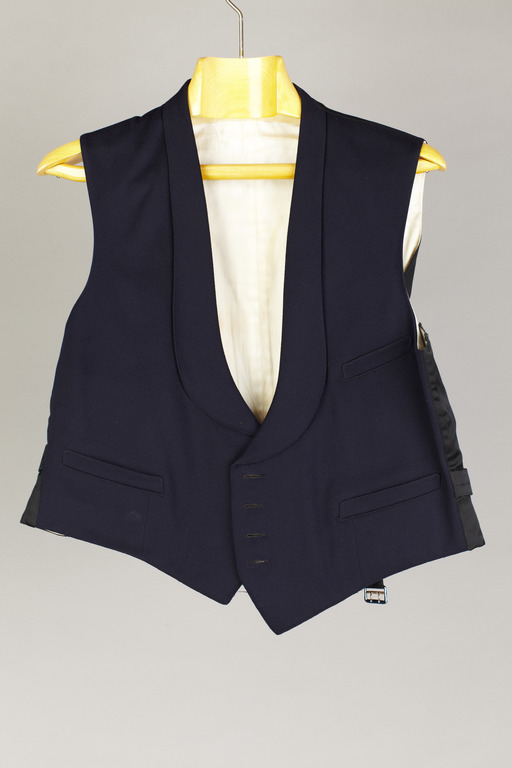 Väst av mörkblått kläde med sjalkrage. Två stolpfickor nedtill samt bröstficka. Enkelknäppning med fyra knappar. (Knapparna bortsprättade). Ryggstycke av svart bomull med spänntampar med blåanlöpt rektangulärt spänne. Foder av vit bomull. Tillbehör: Fyra lösa släta mässingsknappar i västfickan med firmanamn: " C. C. SPORRONG & Co STOCKHOLM".