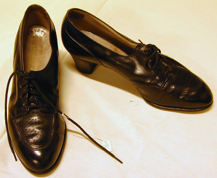 Svart snörsko med yttäckande perforeringar av små hål i ett fält framför tungan och vidhälen. Skosnöret genom åtta hål och med dubbelknut. Skon fodrad med vitfärgat läder ochframtill vid sidorna tyg. Baktill i skon en läderbit fastsydd. På skobotten i guldtryck:"CHAUSSURES DE LUXE // VENTE EXCLUSIVE Bally POUR STOCKHOLM // A.B. Nordiska Kompaniet //STOCKHOLM". Slitsulan svartmålad med inslaget: "5 // 6 // A". I klacksulan är 14 stiftinslagna.