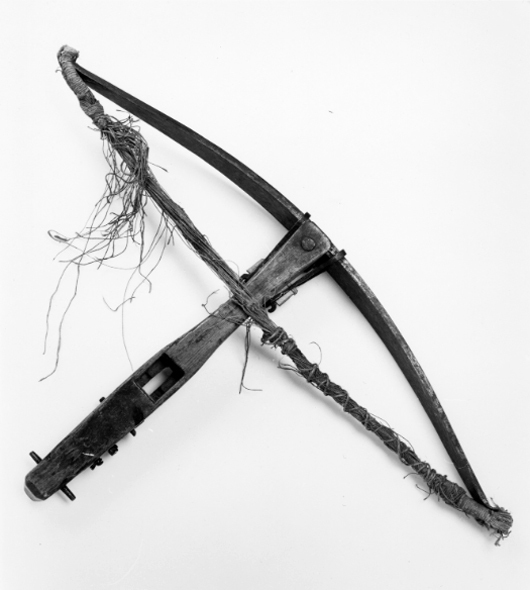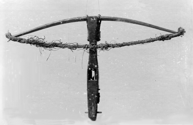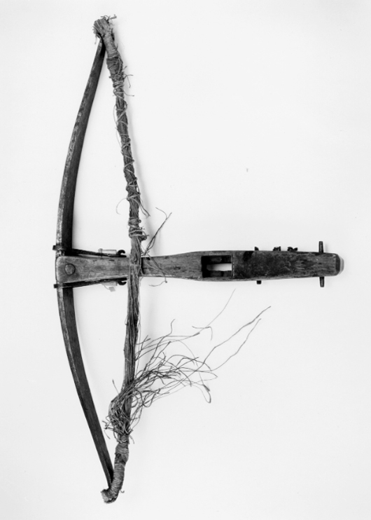 Båge av stål med tvinnad sträng av hampa (?). Bågen fästad vid stocken på sidorna med två triangulära skenor av stål. Utvändigt lås av stål. Stock av björk, kort och tjock, med baktill två utstående tappar (för spännanordning). Grovt arbetad. På stockens ena sida rektangulär pappersetikett med text: "Gård i Kräklingbo" (belägen på Gotland). Möjligen ett s.k. gillerarmborst, som riggades i en gillrad fälla.