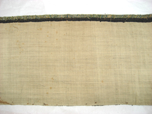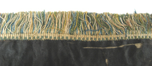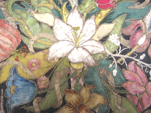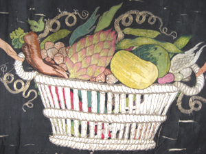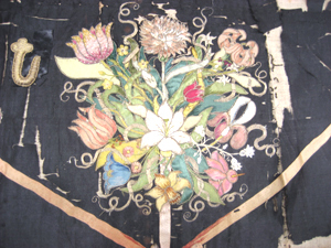 Rektangulär gardinkappa av svart sidenatlas, på två sidor kantad av en kort, tät silkefrans i rött, blått, grönt, gult och vitt. På kappan sitter två aplikationsbroderier av olikfärgat siden och med detaljer av silketråd och av förgylld metalltråd. Det ena broderiet föreställer stor vit korg fylld av frukt/grönsaker medan det andra broderiet föreställer en stor bukett med bland annat rosor, nejlikor, iris och liljor. Färgerna går i vitt, brunt, blått, lila, rött samt gult och grönt. Korgen och blombuketten sammanbinds med ett rött sidenband med rosetter. Sammanhörande med stolsöverdrag, gardiner och gardinkappor nnr 19545-19564.