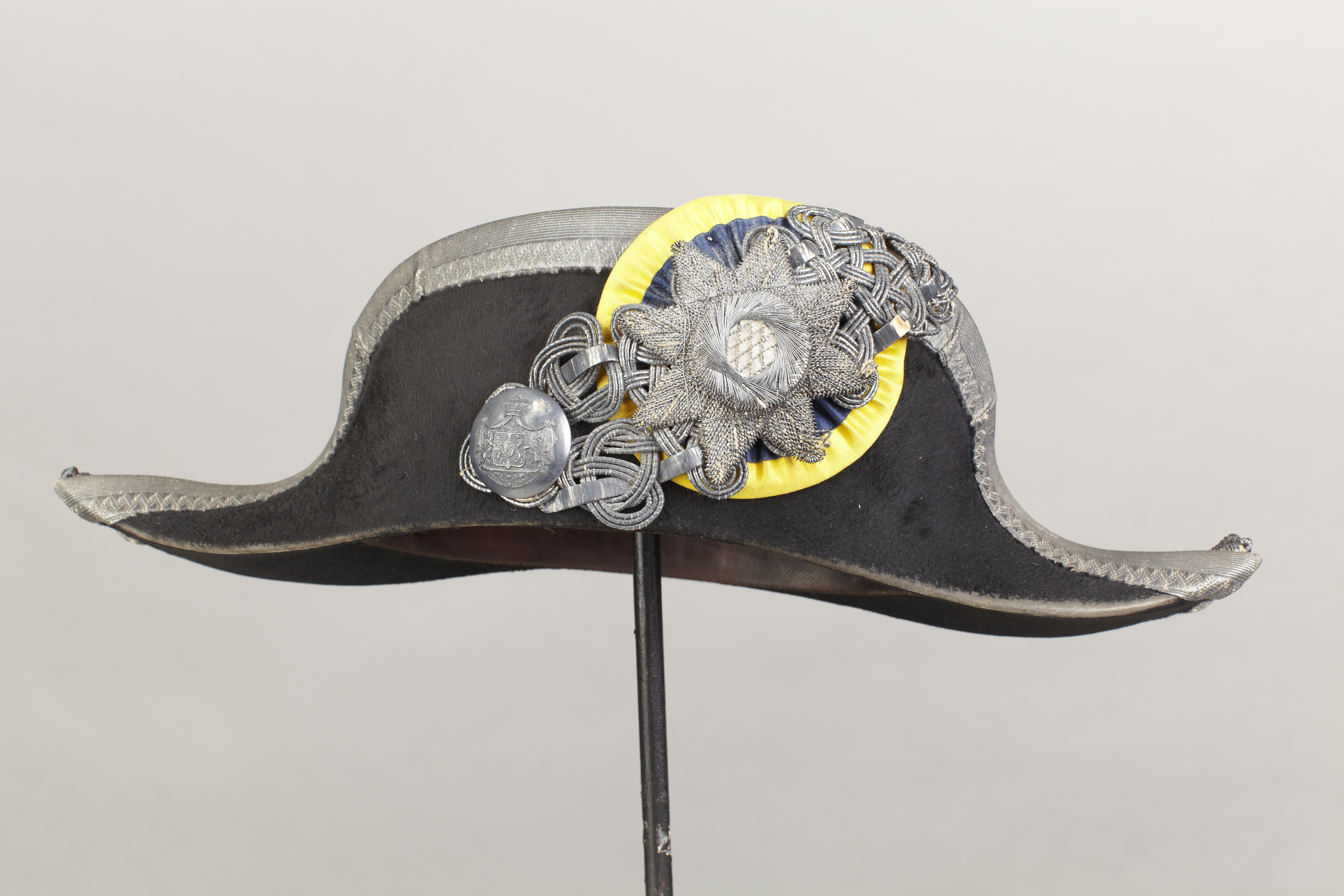 Hatt av svart silkesfelb med brättena uppvikta i sidorna. Brättet kantas av en mörknad, omvikt silvergalon. I sidorna sitter krepiner av silvertråd. I sidan sitter en kokard av blått och gult siden. På denna dekorerar ett snörmakeriarbete av silvertråd och silverlan samt en stjärna av silvertråd samt en kupig slät silverknapp med riksvapnet. På insidan är fodrat med svart glansig linnelärft. Svettremmen utgörs av ett brunt läderband.
