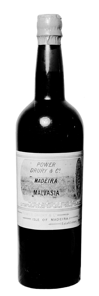 MALVASIA, Pover, Drury & Co., två helbuteljer Butelj av mörkgrönt glas. Cylindriska, med kupigt indragen skuldra och svagt konisk hals, kring vars mynning en bandliknande utsvällning (s. k. stärkring); nedanför denna en utstående skarp kant; bottnen insänkt. Etikett vit, därpå avbildning av buteljens originalkork i gulbrunt med text i svart, nedtill text i svart på engelska, franska och tyska, nederst firmanamn i blekrött jämte annan text i svart. Kapsyl av förtent bly, rödfärgad, ovanpå text i relief. Höjd: 31,3 cm.; diameter: 8,1 cm. Inköpt av Walther von Hallwyl något av åren 1917-1921.