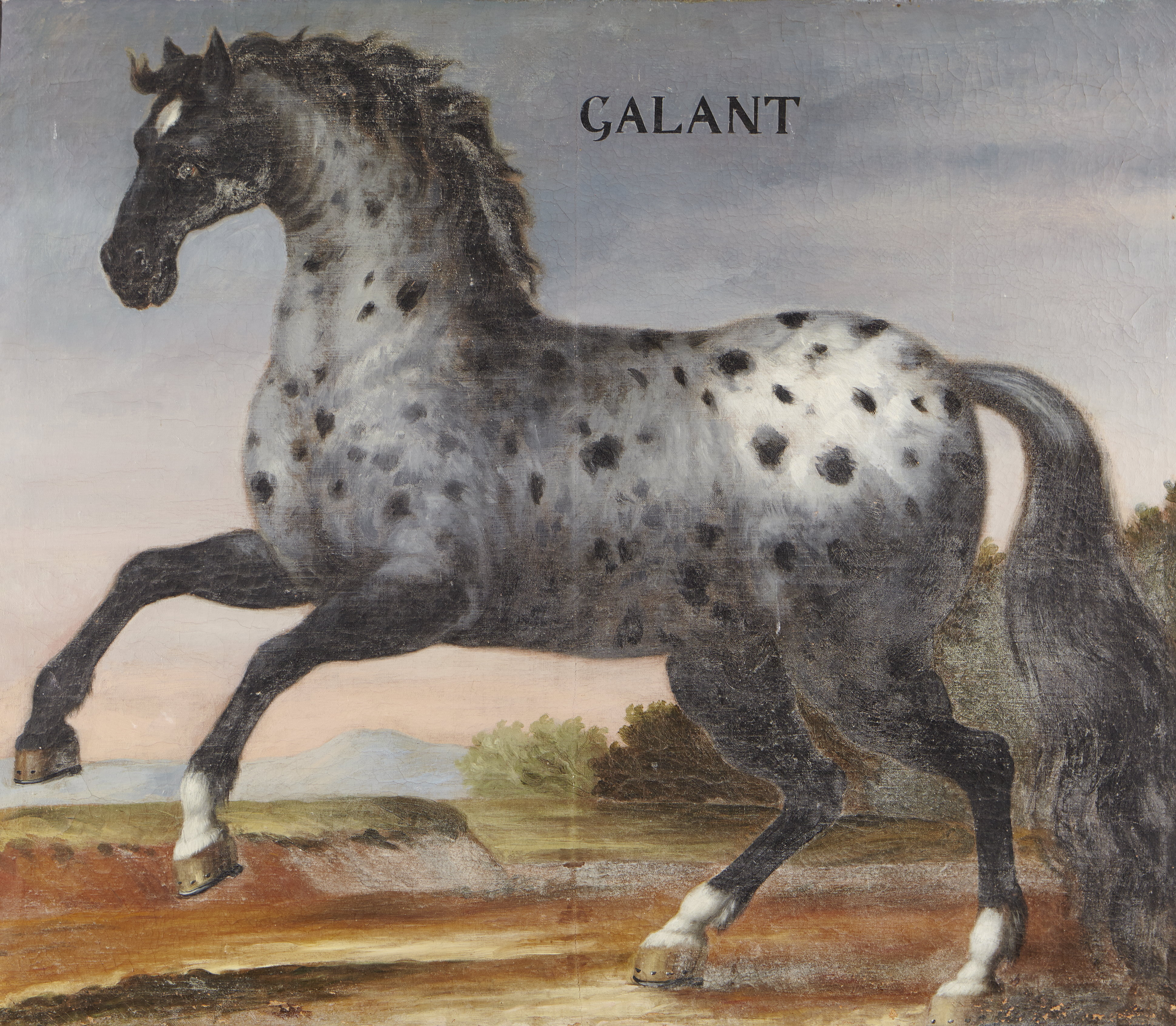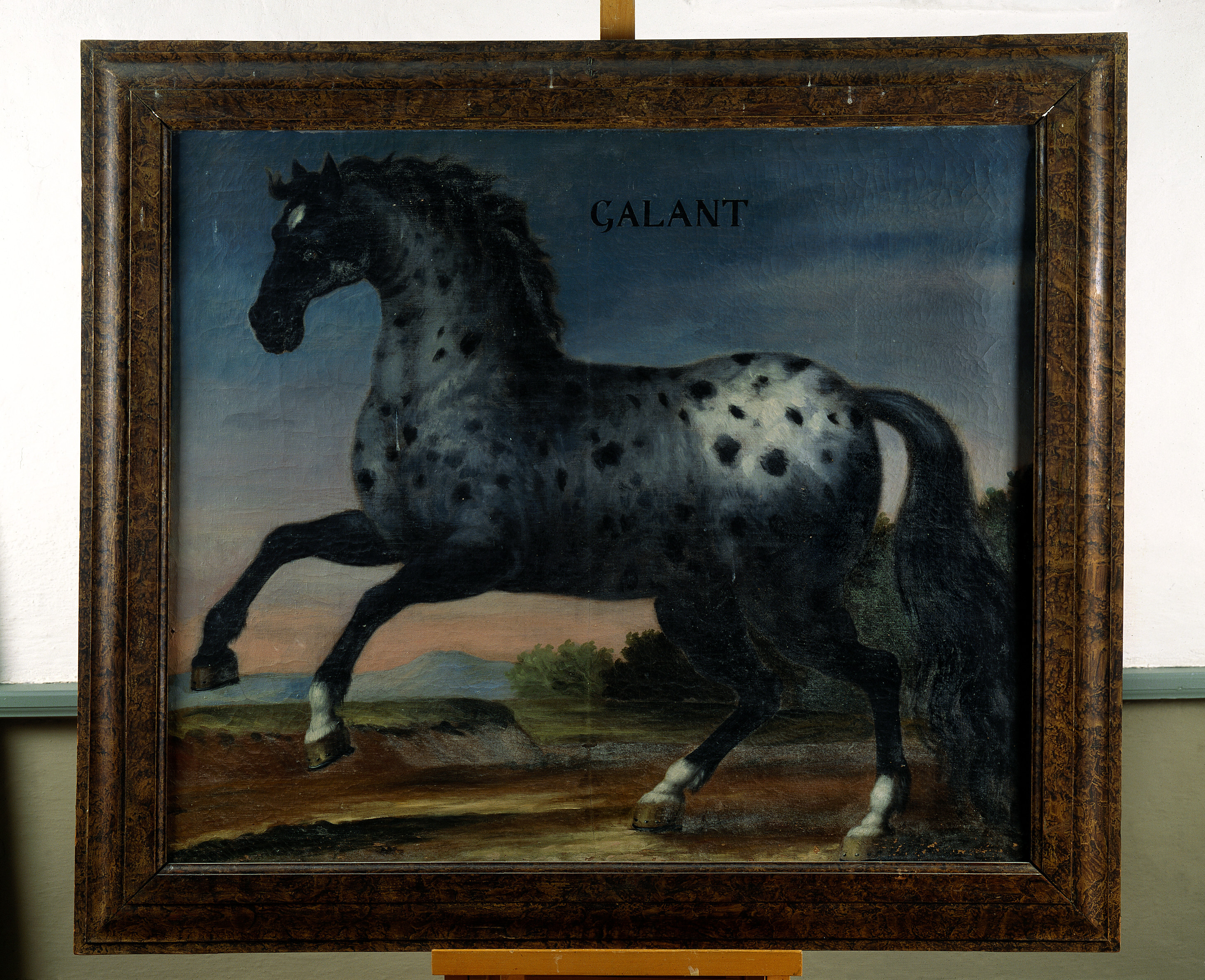 Grå apelkastad häst, stående på bakbenen, åt vänster i landskap. Inskrift: ”GALANT”. Stiftad spännram. Brunmarmorerad ram, bredd 120 mm. På ramens baksida skrivet ”G” med bläck. Oljemålning på duk.
