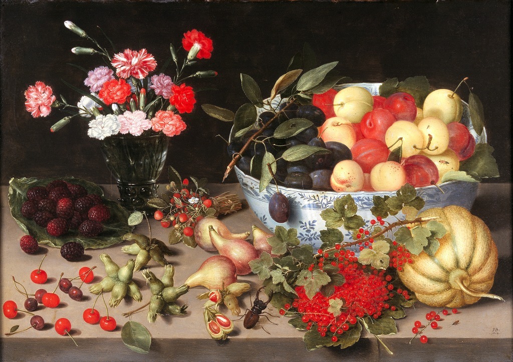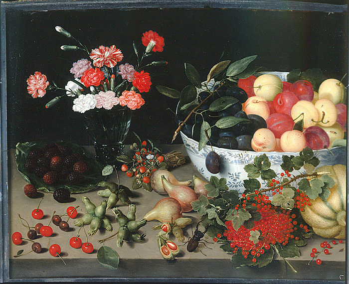 Bord med remmare fylld med nejlikor i olika färger, blåvit porslinsskål med röda, gula och blå plommon. På bordet även melon, röda vinbär, smultron, körsbär, moreller i kålblad, mullbär, små flaskkurbitsar, hasselnötter samt en ekoxe och en flugbagge. Signerad i nedre högra hörnet: "PB 1618". Förgylld empireram av furu med pastellagerankor i hörnen. Ramlistens bredd 100 mm. Still life with rummer, flowers, fruits, nuts, insects and blue and white Chinese porcelain bowl. The painting was executed by Peter Binoit during his stay in Frankfurt-am-Main 1611-1624. Signed and dated PB 1618.