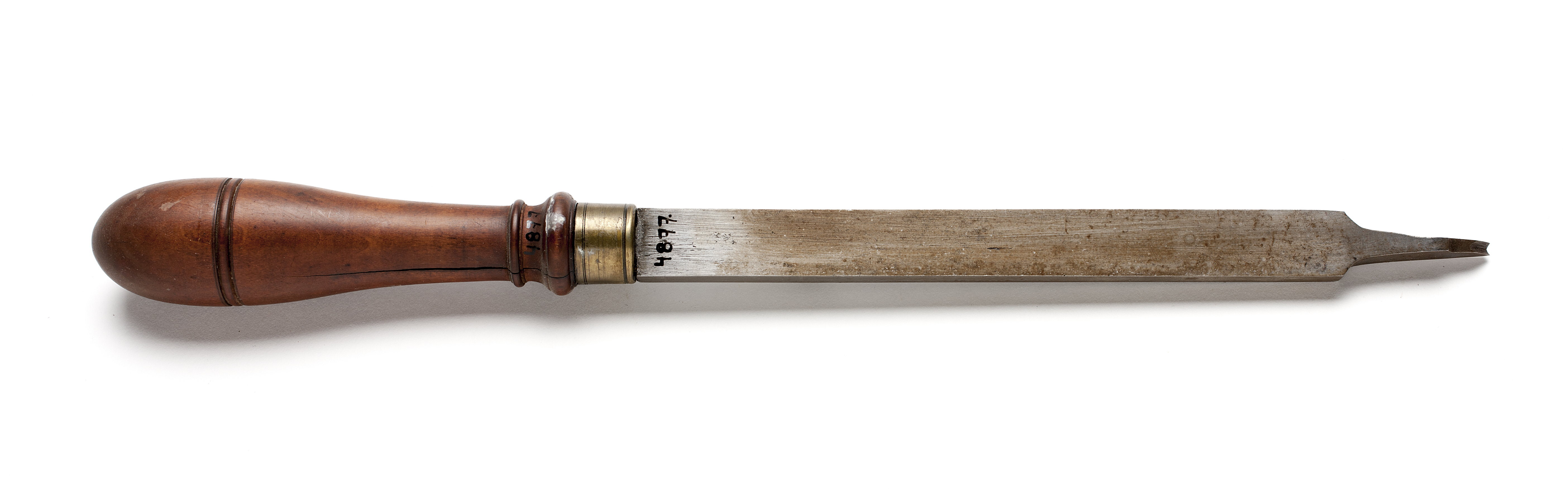 Klinga med rektangulär genomskärning, avsmalnande i änden via en konkavitet på vardera sidan. Konkav egg. Svarvat skaft av päronträ med två vulster nedtill ("skoklostertyp"). Mässingsring.