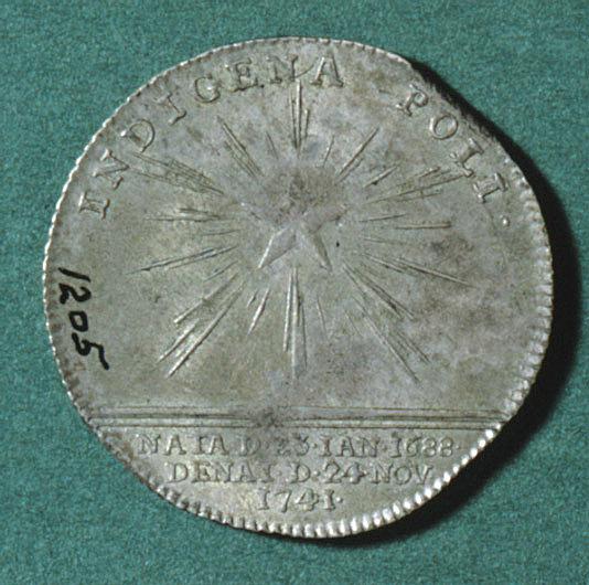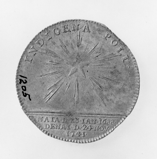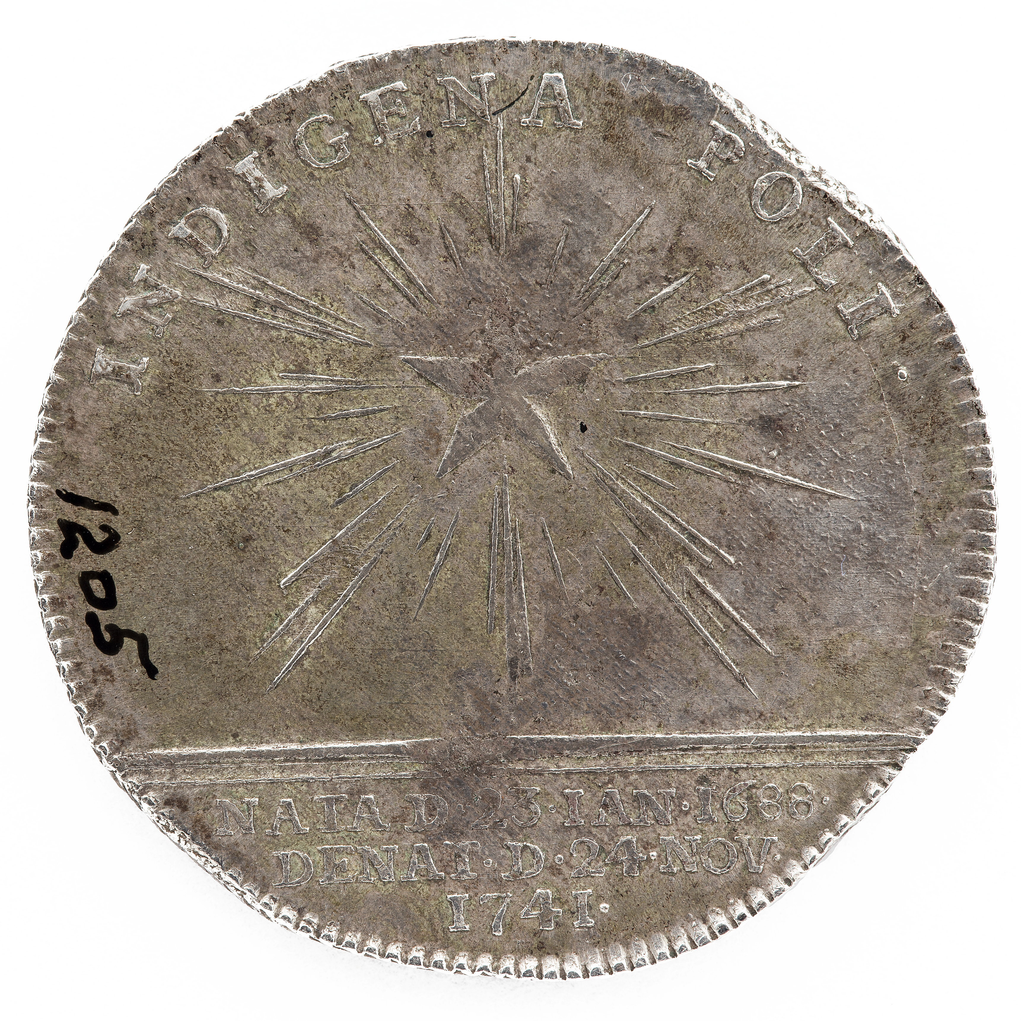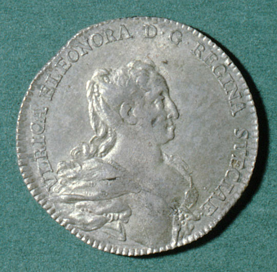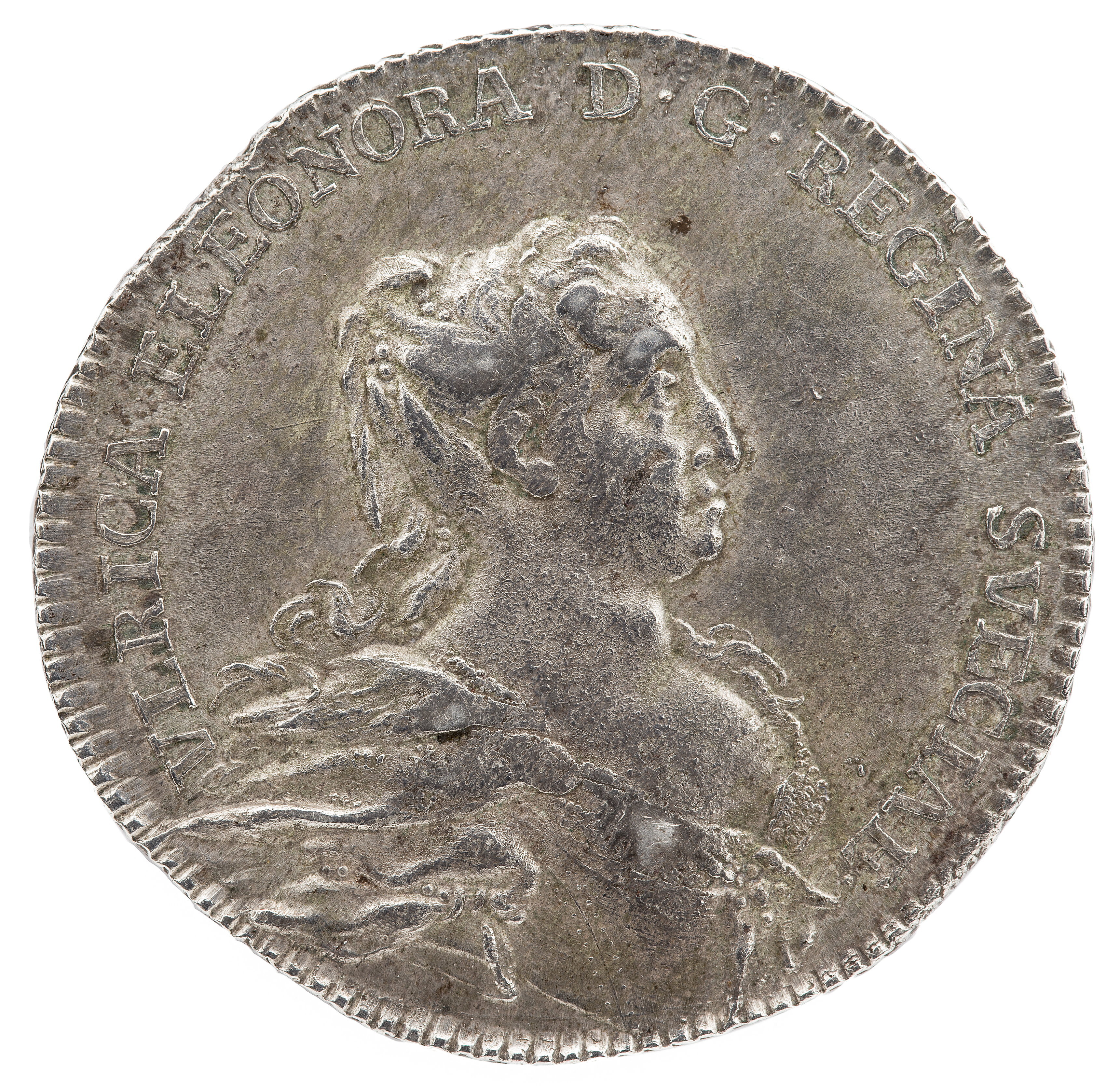 Kastpenning från drottning Ulrika Eleonora d.y:s (1688-01-23 - 1741-11-24) begravning i Riddarholmskyrkan i Stockholm 1742-12-01. Åtsida: Ulrika Eleonora d.y., midjebild, profil h, hår uppsatt med pärlband, urringad klänning, kronbeströdd mantel, text: "VLRIKA ELEONORA D.G.REGINA SVECIAE". Frånsida: strålande nordstjärna, text: "INDIGENA POLI.", i avskärning nertill text:"NATA D.23.IAN.1688. // DENATA.D.24.NOV. // 1741". Räfflade kanter, snedräfflad rand.