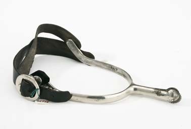 Sporre av förnicklat stål. U-formade skänklar med nedåtböjda ytterändar, vardera med två knappar på hals. På den ena en platt rund sölja av förnicklat stål. Rak sporrhals med rundad ytterände med klinga av stål med små taggar. Klingan räfflad. Tillbehör:Svarta sporrläder, hålfotsrem, l: 185 mm, vristrem, l: 240 mm.