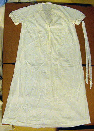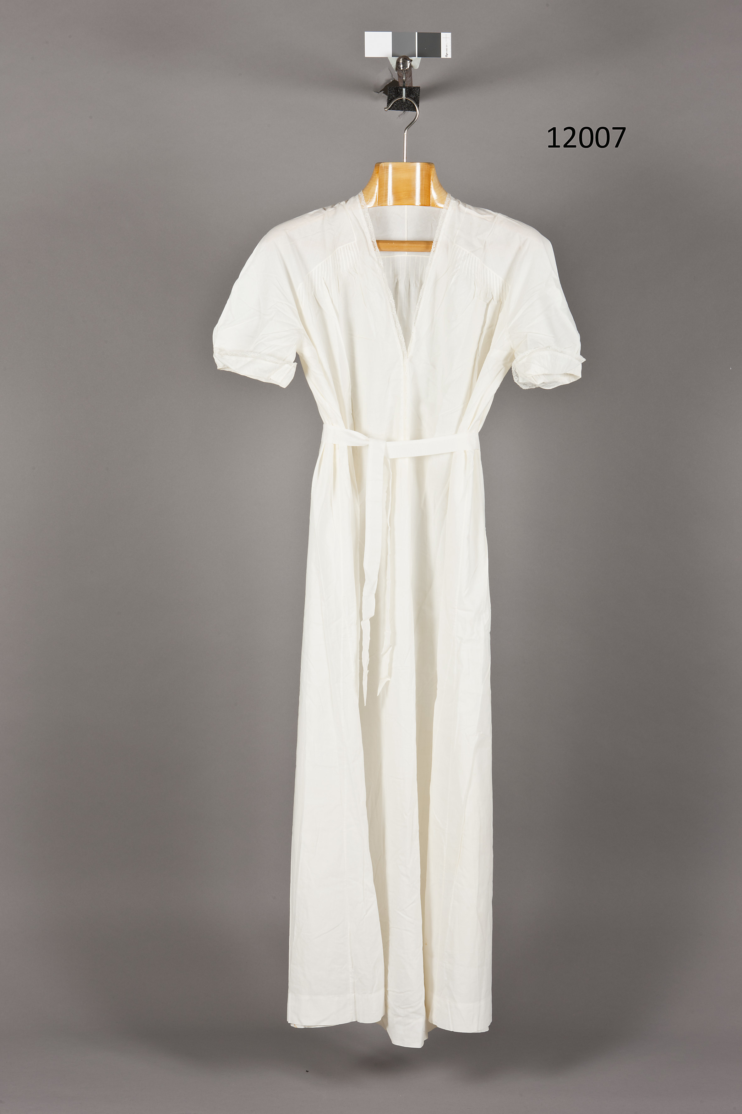 Nattlinne av vit ylle. V-formad urringning, kantad med maskinknypplad spets. På bröstsidanoch ryggen är tyget veckat i ca 40 mm långa veck. Kort ärm med slag. Slaget är kantat medsamma spets som ovannämnda. Yttersta kanten på slaget är veckat, längd ca 20 mm. Nattlinnet sytt i två huvudstycken, ett fram och ett bakstycke. I sidorna upp till halvanattlinnets längd är en kil insydd. Linnets nederkant är fållad. Tillbehör:Till nattlinnet hör ett skärp med samma nummer.
