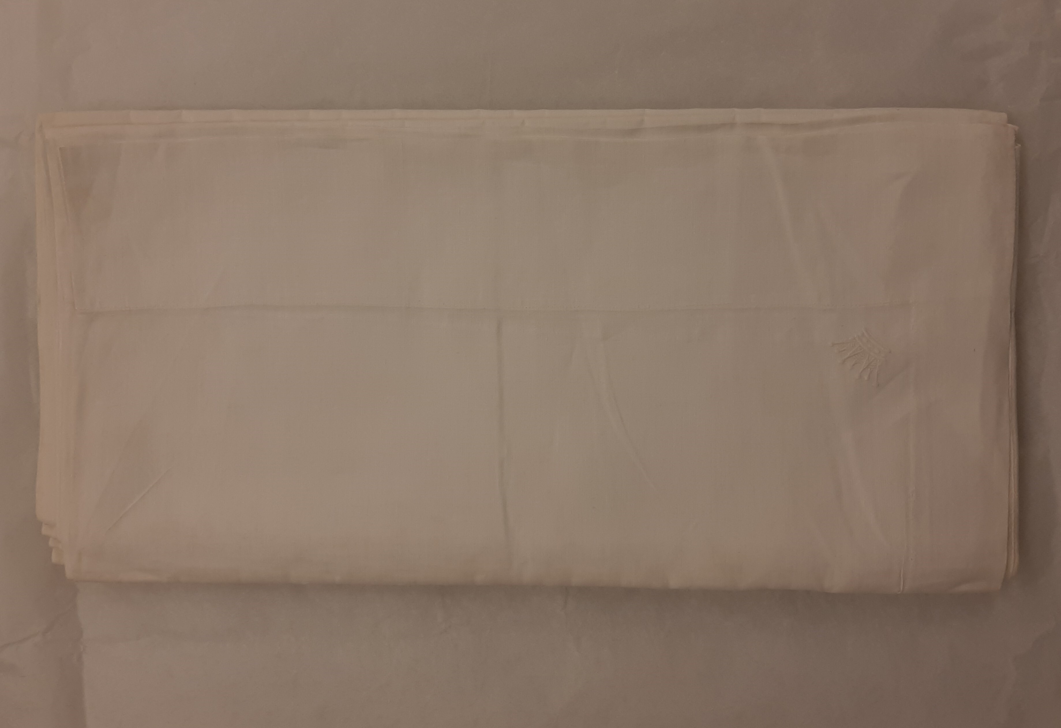 Duk av cellulosamaterial, troligen linne, med kronprinskrona i vitbroderi. Sydd av två våder, 600 mm breda, 30 mm bred fåll. Mittsöm handsömnad, fåll maskinsydd. Två äldre stoppningar. Tillhört drottning Victoria som kronprinsessa och av henne skänkts till garderobiären Hanna Sofia Karlsson (1868-1946). Duken ska ha använts vid resor och fungerat som skydd i kofferten.