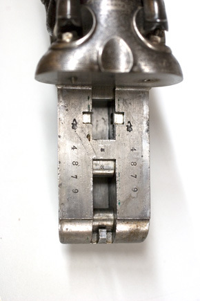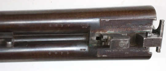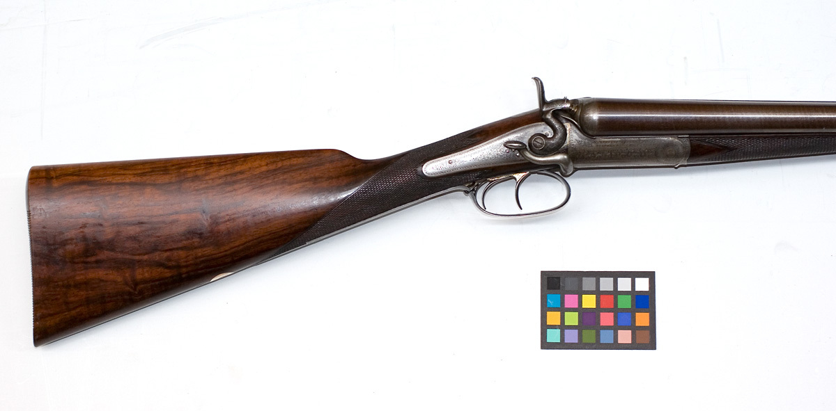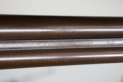 Brunerad, damaskerad dubbelpipa med utkastare, mellanliggande över- och underspänger, rosendamask. På överspången graverad signatur: "STEPHEN GRANT 67 ST JAMES'S STREET LONDON", därframför 2. På pipans undersida på båda sidor om stora pipklacken stämplat: NOT FOR BALL samt engelska kontrollstämplar: G och hjälmkrans med lejon, krönt V, krönt GP samt 12 B och 14. På runda delen därframför på båda piporna stämplat HW och 4879. Riktmedel: Knoppkorn av silver. Slutning: sidnyckel och radialklackar. Baskyl med graverad rankdekor, på sidorna graverat: "STEPHEN GRANT'S PATENT", på baskylbladet en utsparad oval, däri graverat: "PATENT". På ovansidan stämplat: krönt V, 4879 samt 2, allt 2 ggr. Dubbelt hanlås med bakåtliggande slagfjäder. Svagt välvda låsbleck med graverad rankdekor, signatur: "STEPHEN GRANT". S-formiga hanar med harmynta slaghuvuden, nätskurna tumgrepp, graverad rankdekor. På insidan av v. Hane stämplat: 4. På låsbleckets insida stämplat: "JOSEPH BRAZIER // ASHES", "STANTON & CO" samt 4879, dessutom under slagfjädrarna dolda stämplar. Fästning: En låsskruv från v. sida. Dubbla avtryckare. Kolv av engelsk typ med nätskuren kolvhals. Förstock av samma trä, nätskuren med låsmekanism system Anson, på insidan stämplat: 4879 samt 2. Kolvänden försedd med tvärgående räfflor i träet. På kolvens undersida en oval, förgylld silverplåt, därpå graverat: T, därbakom stämplat i träet: OXX. Blånerad varbygel med graverade rankor, lång bakre arm med graverade siffror: 4879 samt 2.