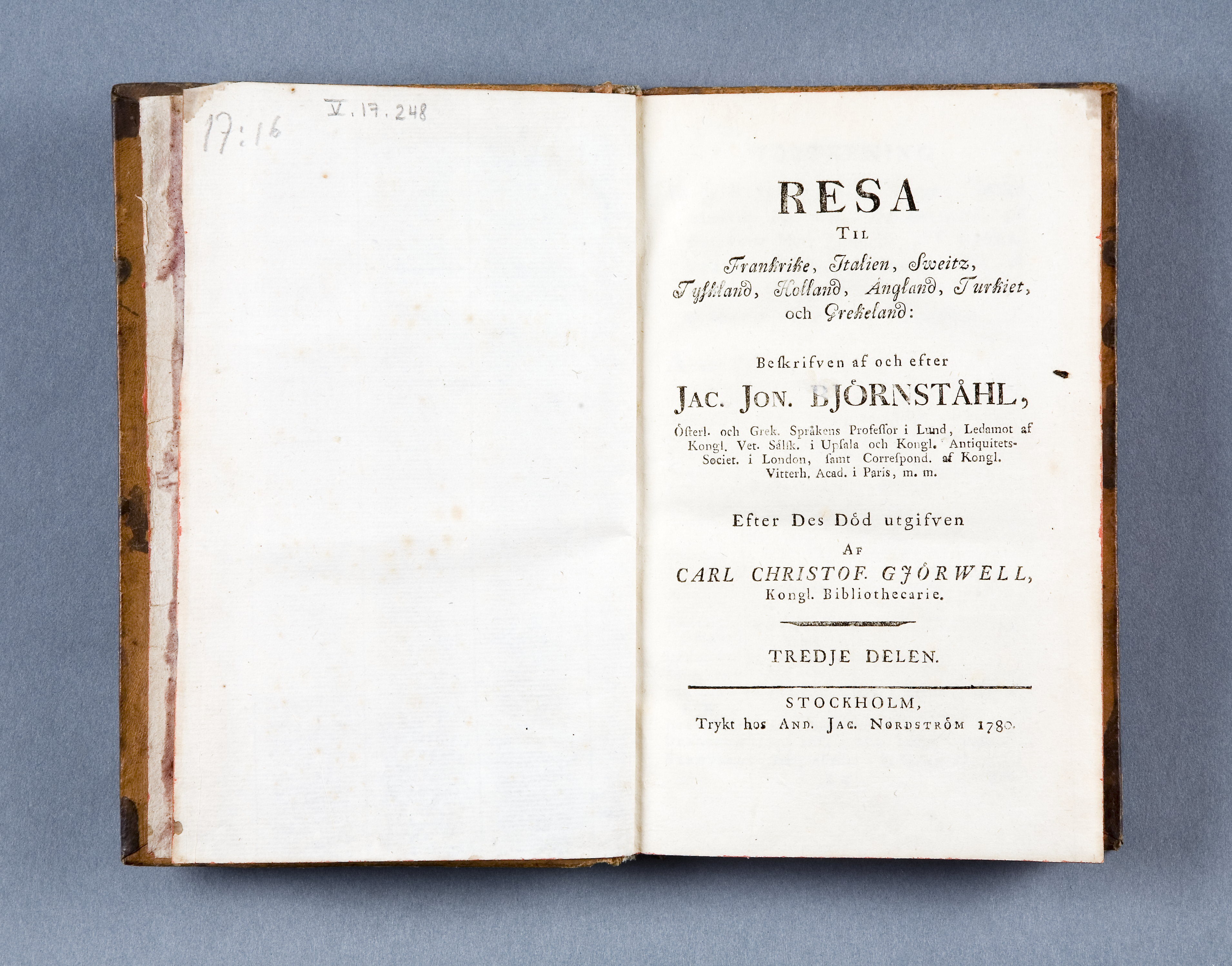 Resa til Frankrike, Italien, Sweitz, Tyskland, Holland, Ángland, Turkiet och Grekland: beskrifven af och efter Jac. Jon. Björnståhl...Efter des död utgifven af Carl Christof. Gjörwell...Första [-fjerde] delen. Stockholm, tryckt hos And. Jac. Nordström, 1780.